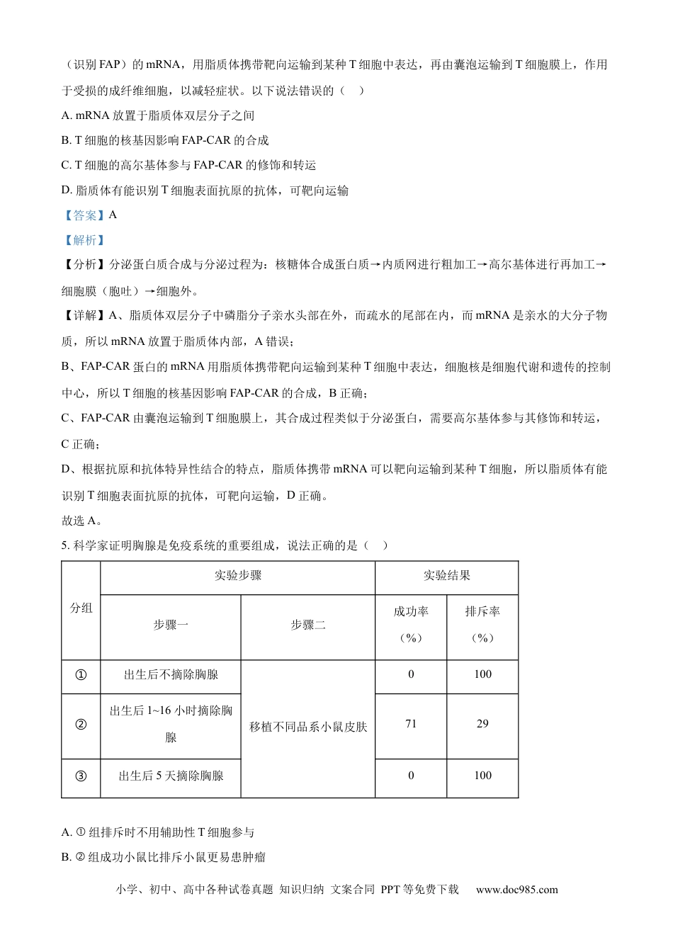 小学、初中、高中各种试卷真题知识归纳文案合同PPT等免费下载www.doc985.com2024年重庆新课标高考生物试卷1.苹果变甜主要是因为多糖水解为可溶性糖,细胞中可溶性糖储存的主要场所是()A.叶绿体B.液泡C.内质网D.溶酶体【答案】B【解析】【分析】细胞质中有线粒体、内质网、核糖体、高尔基体等细胞器,植物细胞有的有叶绿体。这些细胞器既有分工,又有合作。【详解】A、叶绿体是绿色植物能进行光合作用的细胞含有的细胞器,是植物细胞的“养料制造车间”和“能量转换站”。据此可知,叶绿体不是苹果细胞中可溶性糖储存的主要场所,A不符合题意;B、液泡主要存在于植物的细胞中,内有细胞液,含糖类、无机盐、色素和蛋白质等。据此可知,苹果细胞中的可溶性糖储存的主要场所是液泡,B符合题意;C、内质网是蛋白质等大分子物质的合成、加工场所和运输通道。据此可知,内质网不是苹果细胞中可溶性糖储存的主要场所,C不符合题意;D、溶酶体主要分布在动物细胞中,是细胞的“消化车间”,内部含有多种水解酶。据此可知,溶酶体不是苹果细胞中可溶性糖储存的主要场所,D不符合题意。故选B。2.下表据《中国膳食指南》得到女性3种营养元素每天推荐摄入量,据表推测,下列错误的是()钙(mg/d)铁(mg/d)碘0.5-1岁3501011525-30岁(未孕)8001812025-30岁(孕中期)8002523065-75岁80010120A.以单位体重计,婴儿对碘的需求高于成人B.与孕前期相比,孕中期女性对氧的需求量升高C.对25岁与65岁女性,大量元素的推荐摄入量不同D.即使按推荐量摄入钙,部分女性也会因缺维生素D而缺钙小学、初中、高中各种试卷真题知识归纳文案合同PPT等免费下载www.doc985.com【答案】C【解析】【分析】大量元素主要有C、H、O、N、P、S、K、Ca、Mg;微量元素主要有Fe、Mn、Zn、Cu、B、Mo;主要元素有C、H、O、N、P、S;基本元素有C、H、O、N;最基本元素是C。【详解】A、由表格数据可知,婴儿碘每天的摄入量为115μg,成人为120μg,相差不大,但成人的体重远高于婴儿,所以以单位体重计,婴儿对碘的需求高于成人,A正确;B、铁是血红蛋白在重要成分,表中数据可知,孕中期铁的摄入量高于未孕,由此推测孕中期胎儿发育加快,孕妇的新陈代谢加快,与孕前期相比,孕中期女性对氧的需求量升高,B正确;C、大量元素主要有C、H、O、N、P、S、K、Ca、Mg,由表格数据可知对25岁与65岁女性,钙的推荐摄入量均为800mg/d,C错误;D、维生素D可以促进钙的吸收,所以即使按推荐量摄入钙,部分女性也会因缺维生素D而缺钙,D正确。故选C。3.正常重力环境中,成骨细胞分泌的PGE2与感觉神经上的EP4结合,将信号传入下丘脑抑制某类交感神经活动。进而对骨骼中血管和成骨细胞进行调节,促进骨生成以维持骨量稳定。长时间航天飞行会使宇航员骨量下降。下列分析合理的是()A.PGE2与EP4的合成过程均发生在内环境B.PGE与EP4的结合使骨骼中血管收缩C.长时间航天飞行会使宇航员成骨细胞分泌PGE2增加D.使用抑制该类交感神经的药物有利于宇航员的骨量恢复【答案】D【解析】【分析】自主神经系统包括交感神经和副交感神经。交感神经和副交感神经是调节人体内脏功能的神经装置,所以也叫内脏神经系统,因为其功能不完全受人类的意识支配,所以又叫自主神经系统,也可称为植物性神经系统。【详解】A、PGE2是细胞分泌的神经递质,EP4是神经上的受体,这两个物质的合成场所都是在细胞内完成的,不属于内环境,A错误;B、PGE2与EP4结合后传入下丘脑抑制某类交感神经活动,这通常会导致血管扩张而不是收缩,B错误;C、长时间航天飞行会导致宇航员骨量下降,而不是通过增加PGE2的分泌来尝试维持骨量,C错误;D、根据题意,交感神经活动的抑制有助于促进骨生成以维持骨量稳定,抑制交感神经活动的药物可能有助于宇航员在长时间航天飞行后恢复骨量,D正确;故选D。4.心脏受损的病人,成纤维细胞异常表达FAP蛋白,使心脏纤维化。科研人员设计编码FAP-CAR蛋白小学、初中、高中各种试卷真题知识归纳文案合同PPT等免费下载www.doc985.com(识别FAP)的mRNA,用脂质体携带靶向运输到某种T细胞中表达,再由囊泡运输到T细胞膜上,作用于受损的成纤维细胞...