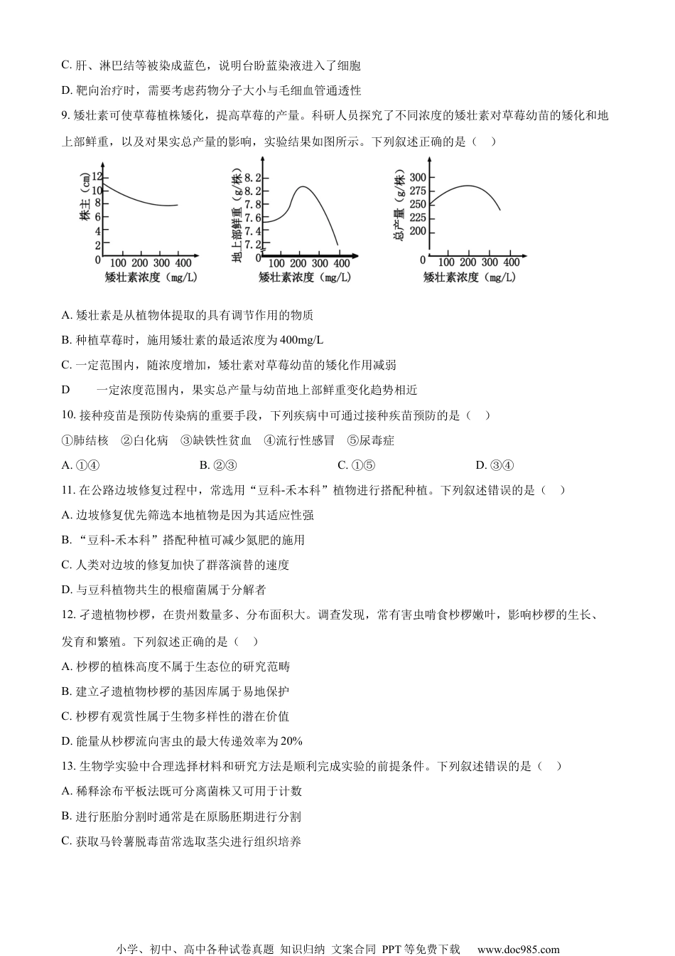小学、初中、高中各种试卷真题知识归纳文案合同PPT等免费下载www.doc985.com贵州省2024年普通高中学业水平选择性考试生物学注意事项:1.答卷前,考生务必将自己的姓名、准考证号填写在答题卡上。2.回答选择题时,选出每小题答案后,用2B铅笔把答题卡上对应题目的答案标号涂黑。如需改动,用橡皮擦干净后,再选涂其他答案标号。回答非选择题时,将答案写在答题卡上。写在本试卷上无效。3.考试结束后,将本试卷和答题卡一并交回。一、选择题:本题共16小题,每小题3分,共48分。在每小题给出的四个选项中,只有一项符合题目要求。1.种子萌发形成幼苗离不开糖类等能源物质,也离不开水和无机盐。下列叙述正确的是()A.种子吸收的水与多糖等物质结合后,水仍具有溶解性B.种子萌发过程中糖类含量逐渐下降,有机物种类不变C.幼苗细胞中的无机盐可参与细胞构建,水不参与D.幼苗中的水可参与形成NADPH,也可参与形成NADH2.蝌蚪长出四肢,尾巴消失,发育成蛙。下列叙述正确的是()A.四肢细胞分裂时会发生同源染色体分离B.四肢的组织来自于干细胞的增殖分化C.蝌蚪尾巴逐渐消失是细胞坏死的结果D.蝌蚪发育成蛙是遗传物质改变的结果3.为探究不同光照强度对叶色的影响,取紫鸭跖草在不同光照强度下,其他条件相同且适宜,分组栽培,一段时间后获取各组光合色素提取液,用分光光度法(一束单色光通过溶液时,溶液的吸光度与吸光物质的浓度成正比)分别测定每组各种光合色素含量。下列叙述错误的是()A.叶片研磨时加入碳酸钙可防止破坏色素B.分离提取液中的光合色素可采用纸层析法C.光合色素相对含量不同可使叶色出现差异D.测定叶绿素的含量时可使用蓝紫光波段4.茶树根细胞质膜上的硫酸盐转运蛋白可转运硒酸盐。硒酸盐被根细胞吸收后,随者植物的生长;吸收的大部分硒与胞内蛋白结合形成硒蛋白,硒蛋白转移到细胞壁中储存。下列叙述错误的是()A.硒酸盐以离子的形式才能被根细胞吸收B.硒酸盐与硫酸盐进入细胞可能存在竞争关系C.硒蛋白从细胞内转运到细胞壁需转运蛋白小学、初中、高中各种试卷真题知识归纳文案合同PPT等免费下载www.doc985.comD.利用呼吸抑制剂可推测硒酸盐的吸收方式5.大鼠脑垂体瘤细胞可分化成细胞Ⅰ和细胞Ⅱ两种类型,仅细胞Ⅰ能合成催乳素。细胞Ⅰ和细胞Ⅱ中催乳素合成基因的碱基序列相同,但细胞Ⅱ中该基因多个碱基被甲基化。细胞Ⅱ经氮胞苷处理后,再培养可合成催乳素。下列叙述错误的是()A.甲基化可以抑制催乳素合成基因的转录B.氮胞苷可去除催乳素合成基因的甲基化C.处理后细胞Ⅱ的子代细胞能合成催乳素D.该基因甲基化不能用于细胞类型的区分6.人类的双眼皮基因对单眼皮基因是显性,位于常染色体上。一个色觉正常的单眼皮女性(甲),其父亲是色盲:一个色觉正常的双眼皮男性(乙),其母亲是单眼皮。下列叙述错误的是()A.甲的一个卵原细胞在有丝分裂中期含有两个色盲基因B.乙的一个精原细胞在减数分裂Ⅰ中期含四个单眼皮基因C.甲含有色盲基因并且一定是来源于她的父亲D.甲、乙婚配生出单眼皮色觉正常女儿的概率为1/47.如图是某基因编码区部分碱基序列,在体内其指导合成肽链的氨基酸序列为:甲硫氨酸-组氨酸-脯氨酸-赖氨酸……下列叙述正确的是()注:AUG(起始密码子):甲硫氨酸CAU、CNC:组氨酸CCU:脯氨酸AAG:赖氨酸UCC:丝氨酸UAA(终止密码子)A.①链是转录的模板链,其左侧是5'端,右侧是3'端B.若在①链5~6号碱基间插入一个碱基G,合成的肽链变长C.若在①链1号碱基前插入一个碱基G,合成的肽链不变D.碱基序列不同的mRNA翻译得到的肽链不可能相同8.将台盼蓝染液注入健康家兔的血管,一段时间后,取不同器官制作切片观察,发现肝和淋巴结等被染成蓝色,而脑和骨骼肌等未被染色。下列叙述错误的是()A.实验结果说明,不同器官中毛细血管通透性有差异B.脑和骨骼肌等未被染色,是因为细胞膜能控制物质进出小学、初中、高中各种试卷真题知识归纳文案合同PPT等免费下载www.doc985.comC.肝、淋巴结等被染成蓝色,说明台盼蓝染液进入了细胞D.靶向治疗时,需要考虑药物分子大小与毛细血管通透性9.矮壮素可使草莓植株矮化,提高草莓的产量。科研人员探究了不同...