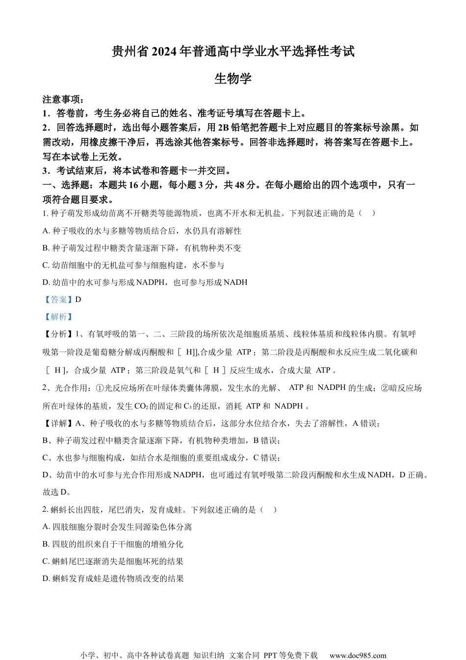小学、初中、高中各种试卷真题知识归纳文案合同PPT等免费下载www.doc985.com贵州省2024年普通高中学业水平选择性考试生物学注意事项:1.答卷前,考生务必将自己的姓名、准考证号填写在答题卡上。2.回答选择题时,选出每小题答案后,用2B铅笔把答题卡上对应题目的答案标号涂黑。如需改动,用橡皮擦干净后,再选涂其他答案标号。回答非选择题时,将答案写在答题卡上。写在本试卷上无效。3.考试结束后,将本试卷和答题卡一并交回。一、选择题:本题共16小题,每小题3分,共48分。在每小题给出的四个选项中,只有一项符合题目要求。1.种子萌发形成幼苗离不开糖类等能源物质,也离不开水和无机盐。下列叙述正确的是()A.种子吸收的水与多糖等物质结合后,水仍具有溶解性B.种子萌发过程中糖类含量逐渐下降,有机物种类不变C.幼苗细胞中的无机盐可参与细胞构建,水不参与D.幼苗中的水可参与形成NADPH,也可参与形成NADH【答案】D【解析】【分析】1、有氧呼吸的第一、二、三阶段的场所依次是细胞质基质、线粒体基质和线粒体内膜。有氧呼吸第一阶段是葡萄糖分解成丙酮酸和[H]],合成少量ATP;第二阶段是丙酮酸和水反应生成二氧化碳和[H],合成少量ATP;第三阶段是氧气和[H]反应生成水,合成大量ATP。2、光合作用:①光反应场所在叶绿体类囊体薄膜,发生水的光解、ATP和NADPH的生成;②暗反应场所在叶绿体的基质,发生CO2的固定和C3的还原,消耗ATP和NADPH。【详解】A、种子吸收的水与多糖等物质结合后,这部分水位结合水,失去了溶解性,A错误;B、种子萌发过程中糖类含量逐渐下降,有机物种类增加,B错误;C、水也参与细胞构成,如结合水是细胞的重要组成成分,C错误;D、幼苗中的水可参与光合作用形成NADPH,也可通过有氧呼吸第二阶段丙酮酸和水生成NADH,D正确。故选D。2.蝌蚪长出四肢,尾巴消失,发育成蛙。下列叙述正确的是()A.四肢细胞分裂时会发生同源染色体分离B.四肢的组织来自于干细胞的增殖分化C.蝌蚪尾巴逐渐消失是细胞坏死的结果D.蝌蚪发育成蛙是遗传物质改变的结果小学、初中、高中各种试卷真题知识归纳文案合同PPT等免费下载www.doc985.com【答案】B【解析】【分析】在“蝌蚪长出四肢,尾巴消失,发育成蛙”的过程中,涉及到细胞的增殖、凋亡、分化。【详解】A、四肢细胞分裂属于有丝分裂,不会发生同源染色体分离,同源染色体分离发生在减数分裂过程中,A错误;B、动物和人体内仍保留着少数具有分裂和分化能力的细胞,这些细胞叫作干细胞,四肢的组织细胞是来自于干细胞的增殖分化,B正确;C、蝌蚪尾巴逐渐消失是细胞凋亡的结果,C错误;D、蝌蚪发育成蛙是细胞分化的结果,细胞分化是细胞中基因选择性表达,而不是遗传物质改变,D错误。故选B。3.为探究不同光照强度对叶色的影响,取紫鸭跖草在不同光照强度下,其他条件相同且适宜,分组栽培,一段时间后获取各组光合色素提取液,用分光光度法(一束单色光通过溶液时,溶液的吸光度与吸光物质的浓度成正比)分别测定每组各种光合色素含量。下列叙述错误的是()A.叶片研磨时加入碳酸钙可防止破坏色素B.分离提取液中的光合色素可采用纸层析法C.光合色素相对含量不同可使叶色出现差异D.测定叶绿素的含量时可使用蓝紫光波段【答案】D【解析】【分析】叶绿体色素的提取和分离实验:(1)提取色素原理:色素能溶解在酒精或丙酮等有机溶剂中,所以可用无水酒精等提取色素。(2)分离色素原理:各色素随层析液在滤纸上扩散速度不同,从而分离色素。溶解度大,扩散速度快;溶解度小,扩散速度慢。(3)各物质作用:无水乙醇或丙酮:提取色素;层析液:分离色素;二氧化硅:使研磨得充分;碳酸钙:防止研磨中色素被破坏。(4)结果:滤纸条从上到下依次是:胡萝卜素(最窄)、叶黄素、叶绿素a(最宽)、叶绿素b(第2宽),色素带的宽窄与色素含量相关。【详解】A、提取光合色素加入碳酸钙可以防止色素被破坏,A正确;B、由于不同色素在层析液中溶解度不同,因此在滤纸上的扩散速度不同,从而达到分离的效果,这是纸层析法,B正确;C、不同光合色素颜色不同,因此光合色素相对含量不同可使叶色出现差异,叶绿素多使叶片呈现绿...