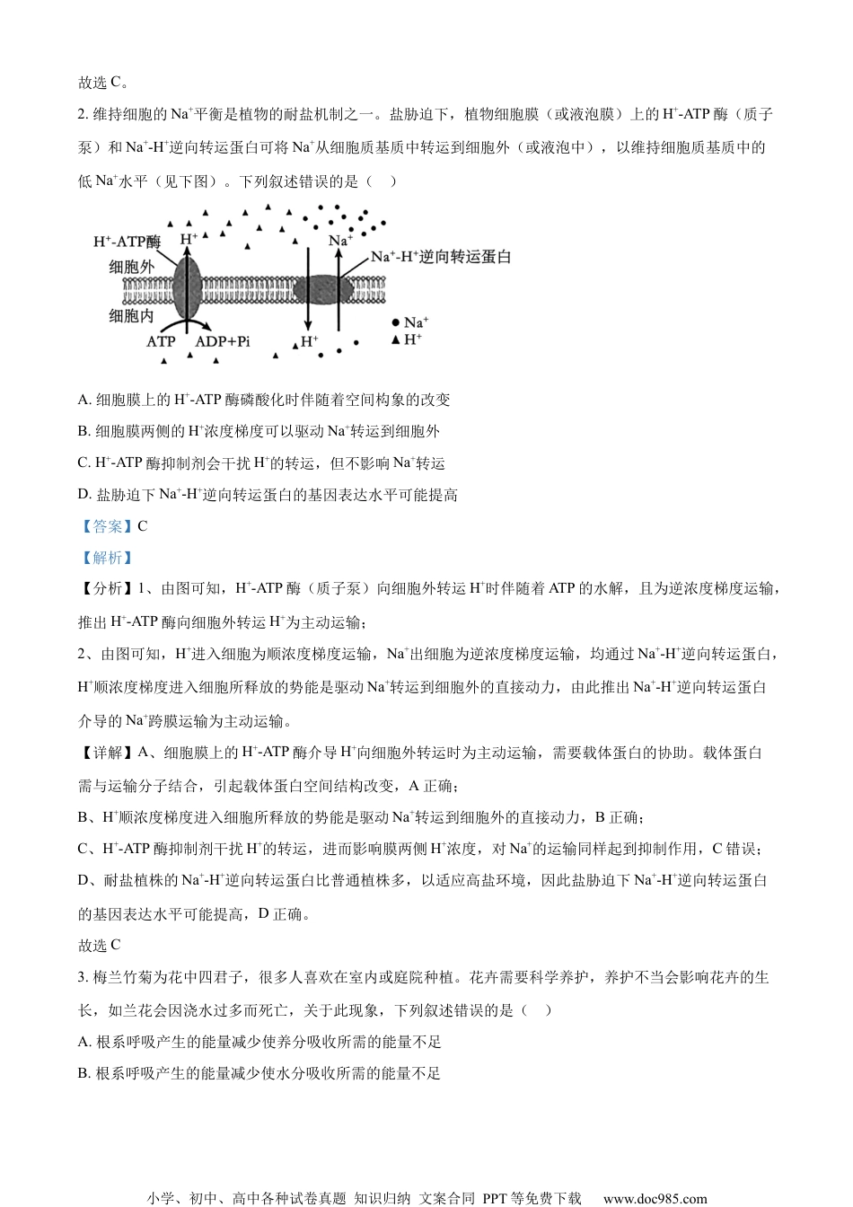 小学、初中、高中各种试卷真题知识归纳文案合同PPT等免费下载www.doc985.com2024年甘肃省普通高校招生统一考试生物学注意事项:1.答卷前,考生务必将自己的姓名、准考证号填写在答题卡上。2.回答选择题时,选出每小题答案后,用2B铅笔把答题卡上对应题目的答案标号框涂黑。如需改动,用橡皮擦干净后,再选涂其它答案标号框。回答非选择题时,将答案写在答题卡上。写在本试卷上无效。3.考试结束后,将本试卷和答题卡一并交回。一、选择题:本题共16小题,每小题3分,共48分。在每小题给出的四个选项中,只有一项是符合题目要求的。1.甘肃陇南的“武都油橄榄”是中国国家地理标志产品,其果肉呈黄绿色,子叶呈乳白色,均富含脂肪。由其生产的橄榄油含有丰富的不饱和脂肪酸,可广泛用于食品、医药和化工等领域。下列叙述错误的是()A.不饱和脂肪酸的熔点较低,不容易凝固,橄榄油在室温下通常呈液态B.苏丹Ⅲ染液处理油橄榄子叶,在高倍镜下可观察到橘黄色的脂肪颗粒C.油橄榄种子萌发过程中有机物的含量减少,有机物的种类不发生变化D.脂肪在人体消化道内水解为脂肪酸和甘油后,可被小肠上皮细胞吸收【答案】C【解析】【分析】脂肪是由三分子脂肪酸与一分子甘油发生反应而形成的酯,即三酰甘油(又称甘油三酯)。其中甘油的分子比较简单,而脂肪酸的种类和分子长短却不相同。脂肪酸可以是饱和的,也可以是不饱和的。植物脂肪大多含有不饱和脂肪酸,在室温时呈液态;大多数动物脂肪含有饱和脂肪酸,室温时呈固态。【详解】A、植物脂肪大多含有不饱和脂肪酸,不饱和脂肪酸的熔点较低,不容易凝固,橄榄油含有丰富的不饱和脂肪酸,在室温下通常呈液态,A正确;B、油橄榄子叶富含脂肪,脂肪可被苏丹Ⅲ染液染成橘黄色,因此在高倍镜下可观察到橘黄色的脂肪颗粒,B正确;C、油橄榄种子萌发过程中由于细胞呼吸的消耗,有机物的总量减少,但由于发生了有机物的转化,故有机物的种类增多,C错误;D、脂肪是由三分子脂肪酸与一分子甘油发生反应而形成的酯,脂肪在人体消化道内水解为脂肪酸和甘油后,可被小肠上皮细胞吸收,D正确。小学、初中、高中各种试卷真题知识归纳文案合同PPT等免费下载www.doc985.com故选C。2.维持细胞的Na+平衡是植物的耐盐机制之一。盐胁迫下,植物细胞膜(或液泡膜)上的H+-ATP酶(质子泵)和Na+-H+逆向转运蛋白可将Na+从细胞质基质中转运到细胞外(或液泡中),以维持细胞质基质中的低Na+水平(见下图)。下列叙述错误的是()A.细胞膜上的H+-ATP酶磷酸化时伴随着空间构象的改变B.细胞膜两侧的H+浓度梯度可以驱动Na+转运到细胞外C.H+-ATP酶抑制剂会干扰H+的转运,但不影响Na+转运D.盐胁迫下Na+-H+逆向转运蛋白的基因表达水平可能提高【答案】C【解析】【分析】1、由图可知,H+-ATP酶(质子泵)向细胞外转运H+时伴随着ATP的水解,且为逆浓度梯度运输,推出H+-ATP酶向细胞外转运H+为主动运输;2、由图可知,H+进入细胞为顺浓度梯度运输,Na+出细胞为逆浓度梯度运输,均通过Na+-H+逆向转运蛋白,H+顺浓度梯度进入细胞所释放的势能是驱动Na+转运到细胞外的直接动力,由此推出Na+-H+逆向转运蛋白介导的Na+跨膜运输为主动运输。【详解】A、细胞膜上的H+-ATP酶介导H+向细胞外转运时为主动运输,需要载体蛋白的协助。载体蛋白需与运输分子结合,引起载体蛋白空间结构改变,A正确;B、H+顺浓度梯度进入细胞所释放的势能是驱动Na+转运到细胞外的直接动力,B正确;C、H+-ATP酶抑制剂干扰H+的转运,进而影响膜两侧H+浓度,对Na+的运输同样起到抑制作用,C错误;D、耐盐植株的Na+-H+逆向转运蛋白比普通植株多,以适应高盐环境,因此盐胁迫下Na+-H+逆向转运蛋白的基因表达水平可能提高,D正确。故选C。3.梅兰竹菊为花中四君子,很多人喜欢在室内或庭院种植。花卉需要科学养护,养护不当会影响花卉的生长,如兰花会因浇水过多而死亡,关于此现象,下列叙述错误的是()A.根系呼吸产生的能量减少使养分吸收所需的能量不足B.根系呼吸产生的能量减少使水分吸收所需的能量不足小学、初中、高中各种试卷真题知识归纳文案合同PPT等免费下载www.doc985.comC.浇水过多抑制了根系细胞有氧呼吸但...