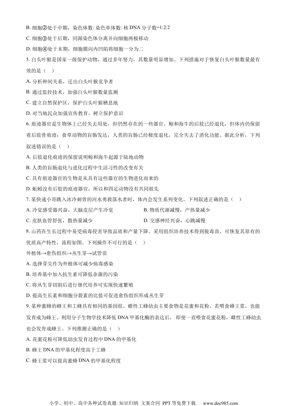 小学、初中、高中各种试卷真题知识归纳文案合同PPT等免费下载www.doc985.com2024年1月浙江省普通高校招生选考科目考试生物学试题考生须知:1.考生答题前,务必将自己的姓名、准考证号用黑色字迹的签字笔或钢笔填写在答题纸上。2.选择题的答案须用2B铅笔将答题纸上对应题目的答案标号涂黑,如要改动,须将原填涂处用橡皮擦净。3.非选择题的答案须用黑色字迹的签字笔或钢笔写在答题纸上相应区域内,作图时可先使用2B铅笔,确定后须用黑色字迹的签字笔或钢笔描黑,答案写在本试题卷上无效。选择题部分一、选择题(本大题共19小题,每小题2分,共38分。每小题列出的四个备选项中只有一个是符合题目要求的,不选、多选、错选均不得分)1.关于生物技术的安全与伦理问题在我国相关法规明令禁止的是()A.试管动物的培育B.转基因食品的生产C.治疗性克隆的研究D.生物武器的发展和生产2.下列不属于水在植物生命活动中作用的是()A.物质运输的良好介质B.保持植物枝叶挺立C.降低酶促反应活化能D.缓和植物温度变化3.婴儿的肠道上皮细胞可以吸收母乳中的免疫球蛋白,此过程不涉及()A.消耗ATPB.受体蛋白识别C.载体蛋白协助D.细胞膜流动性4.观察洋葱根尖细胞有丝分裂装片时,某同学在显微镜下找到①~④不同时期的细胞,如图。关于这些细胞所处时期及主要特征的叙述,正确的是()A.细胞①处于间期,细胞核内主要进行DNA复制和蛋白质合成小学、初中、高中各种试卷真题知识归纳文案合同PPT等免费下载www.doc985.comB.细胞②处于中期,染色体数:染色单体数:核DNA分子数=1:2:2C.细胞③处于后期,同源染色体分离并向细胞两极移动D.细胞④处于末期,细胞膜向内凹陷将细胞一分为二5.白头叶猴是国家一级保护动物,通过多年努力,其数量明显增加。下列措施对于恢复白头叶猴数量最有效的是()A.分析种间关系,迁出白头叶猴竞争者B.通过监控技术,加强白头叶猴数量监测C.建立自然保护区,保护白头叶猴栖息地D.对当地民众加强宣传教育,树立保护意识6.痕迹器官是生物体上已经失去用处,但仍然存在的一些器官。鲸和海牛的后肢已经退化,但体内仍保留着后肢骨痕迹;食草动物的盲肠发达,人类的盲肠已经极度退化,完全失去了消化功能。据此分析,下列叙述错误的是()A.后肢退化痕迹的保留说明鲸和海牛起源于陆地动物B.人类的盲肠退化与进化过程中生活习性的改变有关C.具有痕迹器官的生物是从具有这些器官的生物进化而来的D.蚯蚓没有后肢的痕迹器官,所以和四足动物没有共同祖先7.某快递小哥跳入冰冷刺骨的河水勇救落水者时,体内会发生系列变化。下列叙述正确的是()A.冷觉感受器兴奋,大脑皮层产生冷觉B.物质代谢减慢,产热量减少C.皮肤血管舒张,散热量减少D.交感神经兴奋,心跳减慢8.山药在生长过程中易受病毒侵害导致品质和产量下降。采用组织培养技术得到脱毒苗,可恢复其原有的优质高产特性,流程如图。下列操作不可行的是()外植体→愈伤组织→丛生芽→试管苗A.选择芽尖作为外植体可减少病毒感染B.培养基中加入抗生素可降低杂菌的污染C.将丛生芽切割后进行继代培养可实现快速繁殖D.提高生长素和细胞分裂素的比值可促进愈伤组织形成丛生芽9.某种蜜蜂的蜂王和工蜂具有相同的基因组。雌性工蜂幼虫主要食物是花蜜和花粉,若喂食蜂王浆,也能发育成为蜂王。利用分子生物学技术降低DNA甲基化酶的表达后,即使一直喂食花蜜花粉,雌性工蜂幼虫也会发育成蜂王。下列推测正确的是()A.花蜜花粉可降低幼虫发育过程中DNA的甲基化B.蜂王DNA的甲基化程度高于工蜂C.蜂王浆可以提高蜜蜂DNA的甲基化程度小学、初中、高中各种试卷真题知识归纳文案合同PPT等免费下载www.doc985.comD.DNA的低甲基化是蜂王发育的重要条件10.大肠杆菌在含有³H-脱氧核苷培养液中培养,³H-脱氧核苷掺入到新合成的DNA链中,经特殊方法显色,可观察到双链都掺入³H-脱氧核苷的DNA区段显深色,仅单链掺入的显浅色,未掺入的不显色。掺入培养中,大肠杆菌拟核DNA第2次复制时,局部示意图如图。DNA双链区段①、②、③对应的显色情况可能是()A.深色、浅色、浅色B.浅色、深色、浅色C.浅色、浅色、深色D.深色、浅色、深色11.越野跑、马拉松等运...