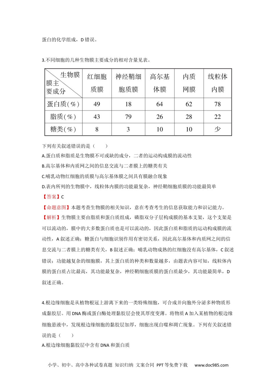 小学、初中、高中各种试卷真题知识归纳文案合同PPT等免费下载www.doc985.com2023年普通高中学业水平等级考试(海南卷)生物本试卷分选择题和非选择题两部分,满分100分,考试时间90分钟。一、选择题:本部分共15题,每题2分,共30分。在每题列出的四个选项中,选出最符合题目要求的一项。1.衣藻和大肠杆菌都是单细胞生物。下列有关二者的叙述,正确的是()A.都属于原核生物B.都以DNA作为遗传物质C.都具有叶绿体,都能进行光合作用D.都具有线粒体,都能进行呼吸作用【答案】B【命题意图】本题考查单细胞生物中衣藻和大肠杆菌的相关知识,意在考查考生的识记能力。【解析】衣藻属于真核生物,A错误;衣藻和大肠杆菌的遗传物质都是DNA,B正确;大肠杆菌没有叶绿体,也不能进行光合作用,C错误;大肠杆菌不含线粒体,但可以进行呼吸作用,D错误。2.科学家将编码天然蜘蛛丝蛋白的基因导入家蚕,使其表达出一种特殊的复合纤维蛋白,该复合纤维蛋白的韧性优于天然蚕丝蛋白。下列有关该复合纤维蛋白的叙述,正确的是()A.该蛋白的基本组成单位与天然蜘蛛丝蛋白的不同B.该蛋白的肽链由氨基酸通过肽键连接而成C.该蛋白彻底水解的产物可与双缩脲试剂发生紫色反应D.高温可改变该蛋白的化学组成,从而改变其韧性【答案】B【命题意图】本题考查蛋白质的相关知识,意在考查考生的识记能力。【解析】该蛋白的基本组成单位是氨基酸,与天然蜘蛛丝蛋白的基本组成单位相同,A错误;氨基酸是组成蛋白质的基本单位,氨基酸发生脱水缩合反应形成由肽键连接而成的多肽链,进而形成蛋白质,B正确;该蛋白彻底水解的产物为氨基酸,不能与双缩脲试剂发生紫色反应,C错误;高温可通过改变该蛋白的空间结构从而改变其韧性,但不会改变该小学、初中、高中各种试卷真题知识归纳文案合同PPT等免费下载www.doc985.com蛋白的化学组成,D错误。3.不同细胞的几种生物膜主要成分的相对含量见表。下列有关叙述错误的是()A.蛋白质和脂质是生物膜不可或缺的成分,二者的运动构成膜的流动性B.高尔基体和内质网之间的信息交流与二者膜上的糖类有关C.哺乳动物红细胞的质膜与高尔基体膜之间具有膜融合现象D.表内所列的生物膜中,线粒体内膜的功能最复杂,神经鞘细胞质膜的功能最简单【答案】C【命题意图】本题考查生物膜的相关知识,意在考查考生的信息获取能力和识记能力。【解析】生物膜主要由脂质和蛋白质组成,磷脂双分子层构成膜的基本支架,这个支架是可以流动的,膜中的大多数蛋白质也是可以流动的,因此蛋白质和脂质的运动构成膜的流动性,A叙述正确;糖蛋白与细胞识别作用有密切关系,因此高尔基体和内质网之间的信息交流与二者膜上的糖类有关,B叙述正确;哺乳动物成熟的红细胞没有高尔基体,C叙述错误;功能越复杂的细胞膜,其上蛋白质的种类和数量越多,由题表内容可知,线粒体内膜的蛋白质占比最高,其功能最复杂,神经鞘细胞质膜的蛋白质最少,其功能最简单,D叙述正确。4.根边缘细胞是从植物根冠上游离下来的一类特殊细胞,可合成并向胞外分泌多种物质形成黏胶层。用DNA酶或蛋白酶处理黏胶层会使其厚度变薄。将物质A加入某植物的根边缘细胞悬液中,发现根边缘细胞的黏胶层加厚,细胞出现自噬和凋亡现象。下列有关叙述错误的是()A.根边缘细胞黏胶层中含有DNA和蛋白质小学、初中、高中各种试卷真题知识归纳文案合同PPT等免费下载www.doc985.comB.物质A可导致根边缘细胞合成胞外物质增多C.根边缘细胞通过自噬可获得维持生存所需的物质和能量D.物质A引起的根边缘细胞凋亡,是该植物在胚发育时期基因表达的结果【答案】D【命题意图】本题考查细胞自噬和细胞凋亡的相关知识,意在考查考生的信息获取能力和理解能力。【解析】由题意可知,用DNA酶或蛋白酶处理黏胶层会使其厚度变薄,说明根边缘细胞黏胶层中含有DNA和蛋白质,A叙述正确;将物质A加入某植物的根边缘细胞悬液中,发现根边缘细胞的黏胶层加厚,说明物质A可导致根边缘细胞合成胞外物质增多,B叙述正确;细胞通过自噬,分解部分细胞中的物质和结构,获得维持生存所需的物质和能量,C叙述正确;物质A引起细胞凋亡是在外界不良环境下引起的,不是在胚发育...