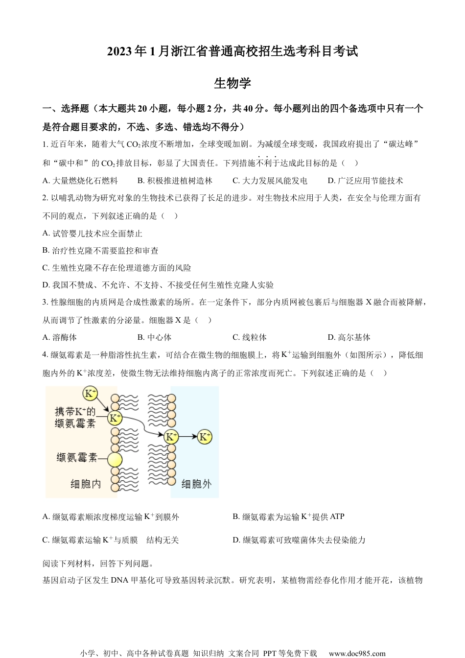 小学、初中、高中各种试卷真题知识归纳文案合同PPT等免费下载www.doc985.com2023年1月浙江省普通高校招生选考科目考试生物学一、选择题(本大题共20小题,每小题2分,共40分。每小题列出的四个备选项中只有一个是符合题目要求的,不选、多选、错选均不得分)1.近百年来,随着大气CO2浓度不断增加,全球变暖加剧。为减缓全球变暖,我国政府提出了“碳达峰”和“碳中和”的CO2排放目标,彰显了大国责任。下列措施不利于达成此目标的是()A.大量燃烧化石燃料B.积极推进植树造林C.大力发展风能发电D.广泛应用节能技术2.以哺乳动物为研究对象的生物技术已获得了长足的进步。对生物技术应用于人类,在安全与伦理方面有不同的观点,下列叙述正确的是()A.试管婴儿技术应全面禁止B.治疗性克隆不需要监控和审查C.生殖性克隆不存在伦理道德方面的风险D.我国不赞成、不允许、不支持、不接受任何生殖性克隆人实验3.性腺细胞的内质网是合成性激素的场所。在一定条件下,部分内质网被包裹后与细胞器X融合而被降解,从而调节了性激素的分泌量。细胞器X是()A.溶酶体B.中心体C.线粒体D.高尔基体4.缬氨霉素是一种脂溶性抗生素,可结合在微生物的细胞膜上,将K+运输到细胞外(如图所示),降低细胞内外的K+浓度差,使微生物无法维持细胞内离子的正常浓度而死亡。下列叙述正确的是()A.缬氨霉素顺浓度梯度运输K+到膜外B.缬氨霉素为运输K+提供ATPC.缬氨霉素运输K+与质膜的结构无关D.缬氨霉素可致噬菌体失去侵染能力阅读下列材料,回答下列问题。基因启动子区发生DNA甲基化可导致基因转录沉默。研究表明,某植物需经春化作用才能开花,该植物小学、初中、高中各种试卷真题知识归纳文案合同PPT等免费下载www.doc985.com的DNA甲基化水平降低是开花的前提。用5-azaC处理后,该植株开花提前,检测基因组DNA,发现5'胞嘧啶的甲基化水平明显降低,但DNA序列未发生改变,这种低DNA甲基化水平引起的表型改变能传递给后代。5.这种DNA甲基化水平改变引起表型改变,属于()A.基因突变B.基因重组C.染色体变异D.表观遗传6.该植物经5-azaC去甲基化处理后,下列各项中会发生显著改变的是()A.基因的碱基数量B.基因的碱基排列顺序C.基因的复制D.基因的转录7.在我国西北某地区,有将荒漠成功改造为枸杞园的事例。改造成的枸杞园与荒漠相比,生态系统的格局发生了重大变化。下列叙述错误的是()A.防风固沙能力有所显现B.食物链和食物网基本不变C.土壤的水、肥条件得到很大改善D.单位空间内被生产者固定的太阳能明显增多8.某同学研究某因素对酶活性的影响,实验处理及结果如下:己糖激酶溶液置于45℃水浴12min,酶活性丧失50%;己糖激酶溶液中加入过量底物后置于45℃水浴12min,酶活性仅丧失3%。该同学研究的因素是()A.温度B.底物C.反应时间D.酶量阅读下列材料,回答下列问题。纺锤丝由微管构成,微管由微管蛋白组成。有丝分裂过程中,染色体的移动依赖于微管的组装和解聚。紫杉醇可与微管结合,使微管稳定不解聚,阻止染色体移动,从而抑制细胞分裂。9.微管蛋白是构成细胞骨架的重要成分之一,组成微管蛋白的基本单位是()A.氨基酸B.核苷酸C.脂肪酸D.葡萄糖10.培养癌细胞时加入一定量的紫杉醇,下列过程受影响最大的是()A.染色质复制B.染色质凝缩为染色体C.染色体向两极移动D.染色体解聚为染色质11.胰高血糖素可激活肝细胞中的磷酸化酶,促进肝糖原分解成葡萄糖,提高血糖水平,机理如图所示。下列叙述正确的是()A.胰高血糖素经主动运输进入肝细胞才能发挥作用B.饥饿时,肝细胞中有更多磷酸化酶b被活化小学、初中、高中各种试卷真题知识归纳文案合同PPT等免费下载www.doc985.comC.磷酸化酶a能为肝糖原水解提供活化能D.胰岛素可直接提高磷酸化酶a的活性12.在家畜优良品种培育过程中常涉及胚胎工程的相关技术。下列叙述错误的是()A.经获能处理的精子才能用于体外受精B.受精卵经体外培养可获得早期胚胎C.胚胎分割技术提高了移植胚胎的成活率D.胚胎移植前需对受体进行选择和处理13.太平洋某岛上生存着上百个蜗牛物种,但同一区域中只有少数几个蜗牛物种共存。生活在同一区域的不同蜗牛物种之间外壳相似...