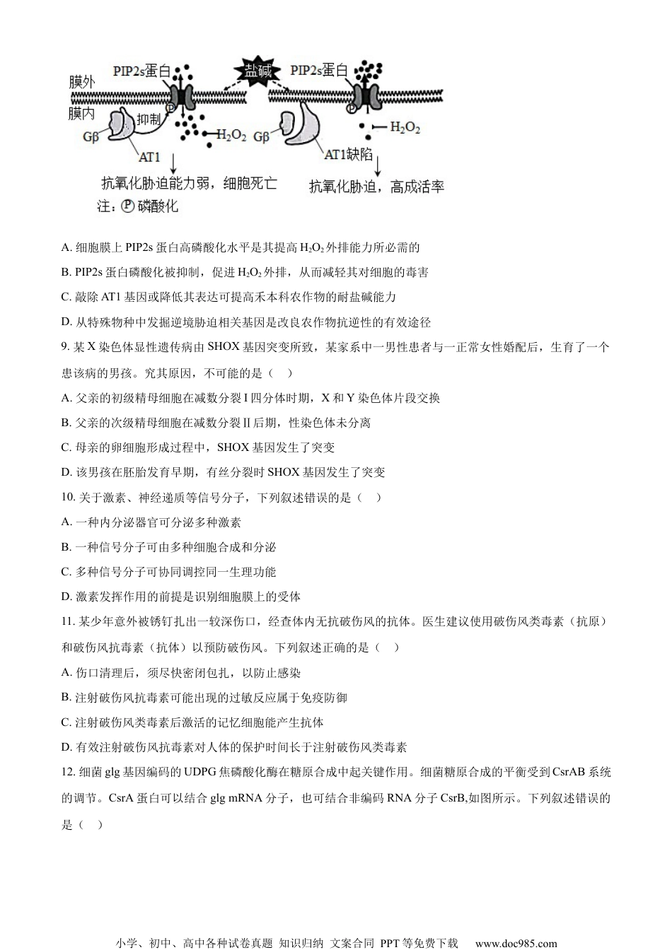 小学、初中、高中各种试卷真题知识归纳文案合同PPT等免费下载www.doc985.com2023年普通高中学业水平选择性考试(湖南卷)生物一、选择题:本题共12小题,在每小题给出的四个选项中,只有一项是符合题目要求的。1.南极雌帝企鹅产蛋后,由雄帝企鹅负责孵蛋,孵蛋期间不进食。下列叙述错误的是()A.帝企鹅蛋的卵清蛋白中N元素的质量分数高于C元素B.帝企鹅的核酸、多糖和蛋白质合成过程中都有水的产生C.帝企鹅蛋孵化过程中有mRNA和蛋白质种类的变化D.雄帝企鹅孵蛋期间主要靠消耗体内脂肪以供能2.关于细胞结构与功能,下列叙述错误的是()A.细胞骨架被破坏,将影响细胞运动、分裂和分化等生命活动B.核仁含有DNA、RNA和蛋白质等组分,与核糖体的形成有关C.线粒体内膜含有丰富的酶,是有氧呼吸生成CO2的场所D.内质网是一种膜性管道系统,是蛋白质的合成、加工场所和运输通道3.酗酒危害人类健康。乙醇在人体内先转化为乙醛,在乙醛脱氢酶2(ALDH2)作用下再转化为乙酸,最终转化成CO2和水。头孢类药物能抑制ALDH2的活性。ALDH2基因某突变导致ALDH2活性下降或丧失。在高加索人群中该突变的基因频率不足5%,而东亚人群中高达30%。下列叙述错误的是()A.相对于高加索人群,东亚人群饮酒后面临的风险更高B.患者在服用头孢类药物期间应避免摄入含酒精的药物或食物C.ALDH2基因突变人群对酒精耐受性下降,表明基因通过蛋白质控制生物性状D.饮酒前口服ALDH2酶制剂可催化乙醛转化成乙酸,从而预防酒精中毒4.“油菜花开陌野黄,清香扑鼻蜂蝶舞。”菜籽油是主要的食用油之一,秸秆和菜籽饼可作为肥料还田。下列叙述错误的是()A.油菜花通过物理、化学信息吸引蜂蝶B.蜜蜂、蝴蝶和油菜之间存在协同进化C.蜂蝶与油菜的种间关系属于互利共生D.秸秆和菜籽饼还田后可提高土壤物种丰富度5.食品保存有干制、腌制、低温保存和高温处理等多种方法。下列叙述错误的是()A.干制降低食品的含水量,使微生物不易生长和繁殖,食品保存时间延长B.腌制通过添加食盐、糖等制造高渗环境,从而抑制微生物的生长和繁殖C.低温保存可抑制微生物的生命活动,温度越低对食品保存越有利小学、初中、高中各种试卷真题知识归纳文案合同PPT等免费下载www.doc985.comD.高温处理可杀死食品中绝大部分微生物,并可破坏食品中的酶类6.甲状旁腺激素(PTH)和降钙素(CT)可通过调节骨细胞活动以维持血钙稳态,如图所示。下列叙述错误的是()A.CT可促进成骨细胞活动,降低血钙B.甲状旁腺功能亢进时,可引起骨质疏松C.破骨细胞活动异常增强,将引起CT分泌增加D.长时间的高血钙可导致甲状旁腺增生7.基因Bax和Bd-2分别促进和抑制细胞凋亡。研究人员利用siRNA干扰技术降低TRPM7基因表达,研究其对细胞凋亡的影响,结果如图所示。下列叙述错误的是()A.细胞衰老和细胞凋亡都受遗传信息的调控B.TRPM7基因可能通过抑制Bax基因的表达来抑制细胞凋亡C.TRPM7基因可能通过促进Bcl-2基因的表达来抑制细胞凋亡D.可通过特异性促进癌细胞中TRPM7基因的表达来治疗相关癌症8.盐碱胁迫下植物应激反应产生的H2O2对细胞有毒害作用。禾本科农作物AT1蛋白通过调节细胞膜上PIP2s蛋白磷酸化水平,影响H2O2的跨膜转运,如图所示。下列叙述错误的是()小学、初中、高中各种试卷真题知识归纳文案合同PPT等免费下载www.doc985.comA.细胞膜上PIP2s蛋白高磷酸化水平是其提高H2O2外排能力所必需的B.PIP2s蛋白磷酸化被抑制,促进H2O2外排,从而减轻其对细胞的毒害C.敲除AT1基因或降低其表达可提高禾本科农作物的耐盐碱能力D.从特殊物种中发掘逆境胁迫相关基因是改良农作物抗逆性的有效途径9.某X染色体显性遗传病由SHOX基因突变所致,某家系中一男性患者与一正常女性婚配后,生育了一个患该病的男孩。究其原因,不可能的是()A.父亲的初级精母细胞在减数分裂I四分体时期,X和Y染色体片段交换B.父亲的次级精母细胞在减数分裂Ⅱ后期,性染色体未分离C.母亲的卵细胞形成过程中,SHOX基因发生了突变D.该男孩在胚胎发育早期,有丝分裂时SHOX基因发生了突变10.关于激素、神经递质等信号分子,下列叙述错误的是()A.一种内分泌器官可分泌多种激素B.一种信号分子可由多种细...