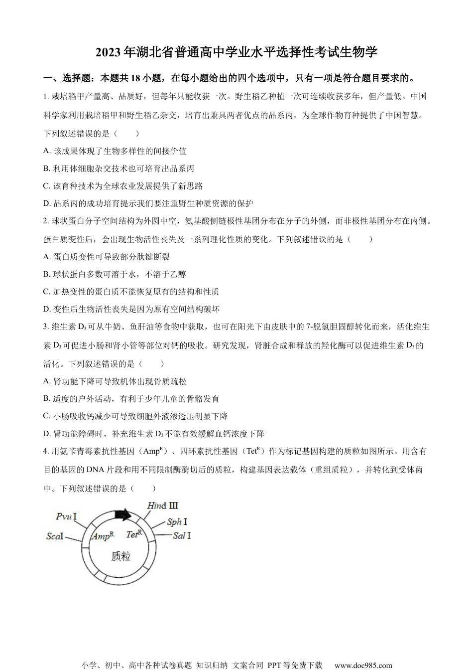 小学、初中、高中各种试卷真题知识归纳文案合同PPT等免费下载www.doc985.com2023年湖北省普通高中学业水平选择性考试生物学一、选择题:本题共18小题,在每小题给出的四个选项中,只有一项是符合题目要求的。1.栽培稻甲产量高、品质好,但每年只能收获一次。野生稻乙种植一次可连续收获多年,但产量低。中国科学家利用栽培稻甲和野生稻乙杂交,培育出兼具两者优点的品系丙,为全球作物育种提供了中国智慧。下列叙述错误的是()A.该成果体现了生物多样性的间接价值B.利用体细胞杂交技术也可培育出品系丙C.该育种技术为全球农业发展提供了新思路D.品系丙的成功培育提示我们要注重野生种质资源的保护2.球状蛋白分子空间结构为外圆中空,氨基酸侧链极性基团分布在分子的外侧,而非极性基团分布在内侧。蛋白质变性后,会出现生物活性丧失及一系列理化性质的变化。下列叙述错误的是()A.蛋白质变性可导致部分肽键断裂B.球状蛋白多数可溶于水,不溶于乙醇C.加热变性的蛋白质不能恢复原有的结构和性质D.变性后生物活性丧失是因为原有空间结构破坏3.维生素D3可从牛奶、鱼肝油等食物中获取,也可在阳光下由皮肤中的7-脱氢胆固醇转化而来,活化维生素D3可促进小肠和肾小管等部位对钙的吸收。研究发现,肾脏合成和释放的羟化酶可以促进维生素D3的活化。下列叙述错误的是()A.肾功能下降可导致机体出现骨质疏松B.适度的户外活动,有利于少年儿童的骨骼发育C.小肠吸收钙减少可导致细胞外液渗透压明显下降D.肾功能障碍时,补充维生素D3不能有效缓解血钙浓度下降4.用氨苄青霉素抗性基因(AmpR)、四环素抗性基因(TetR)作为标记基因构建的质粒如图所示。用含有目的基因的DNA片段和用不同限制酶酶切后的质粒,构建基因表达载体(重组质粒),并转化到受体菌中。下列叙述错误的是()小学、初中、高中各种试卷真题知识归纳文案合同PPT等免费下载www.doc985.comA.若用HindⅢ酶切,目的基因转录的产物可能不同B.若用PvuⅠ酶切,在含Tet(四环素)培养基中的菌落,不一定含有目的基因C.若用SphⅠ酶切,可通过DNA凝胶电泳技术鉴定重组质粒构建成功与否D.若用SphⅠ酶切,携带目的基因的受体菌在含Amp(氨苄青霉素)和Tet的培养基中能形成菌落5.2023年4月,武汉马拉松比赛吸引了全球约26000名运动员参赛。赛程中运动员出现不同程度的出汗、脱水和呼吸加深、加快。下列关于比赛中运动员生理状况的叙述,正确的是()A.血浆中二氧化碳浓度持续升高B.大量补水后,内环境可恢复稳态C.交感神经兴奋增强,胃肠平滑肌蠕动加快D.血浆渗透压升高,抗利尿激素分泌增加,尿量生成减少6.为探究环境污染物A对斑马鱼生理的影响,研究者用不同浓度的污染物A溶液处理斑马鱼,实验结果如下表。据结果分析,下列叙述正确的是()A物质浓度(μg·L-1)指标01050100①肝脏糖原含量(mg·g-1)25.0±0.612.1±0.712.0±0.711.1±0.2②肝脏丙酮酸含量(nmol·g-1)23.6±0.717.5±0.215.7±0.28.8±0.4③血液中胰高血糖素含量(mIU·mg·prot-1)43.6±1.787.2±1.8109.1±3.0120.0±2.1A.由②可知机体无氧呼吸减慢,有氧呼吸加快B.由①可知机体内葡萄糖转化为糖原的速率加快C.①②表明肝脏没有足够的丙酮酸来转化成葡萄糖D.③表明机体生成的葡萄糖增多,血糖浓度持续升高7.2020年9月,我国在联合国大会上向国际社会作出了力争在2060年前实现“碳中和”的庄严承诺。某湖泊早年受周边农业和城镇稠密人口的影响,常年处于CO2过饱和状态。经治理后,该湖泊生态系统每年的有机碳分解量低于生产者有机碳的合成量,实现了碳的零排放。下列叙述错误的是()A.低碳生活和绿色农业可以减小生态足迹B.水生消费者对有机碳的利用,缓解了碳排放C.湖泊沉积物中有机碳的分解会随着全球气候变暖而加剧D.在湖泊生态修复过程中,适度提高水生植物的多样性有助于碳的固定小学、初中、高中各种试卷真题知识归纳文案合同PPT等免费下载www.doc985.com8.植物光合作用的光反应依赖类囊体膜上PSⅠ和PSⅡ光复合体,PSⅡ光复合体含有光合色素,能吸收光能,并分解水。研究发现,PSⅡ光复合体上的蛋白质LHCⅡ,通过与PSⅡ结合或...