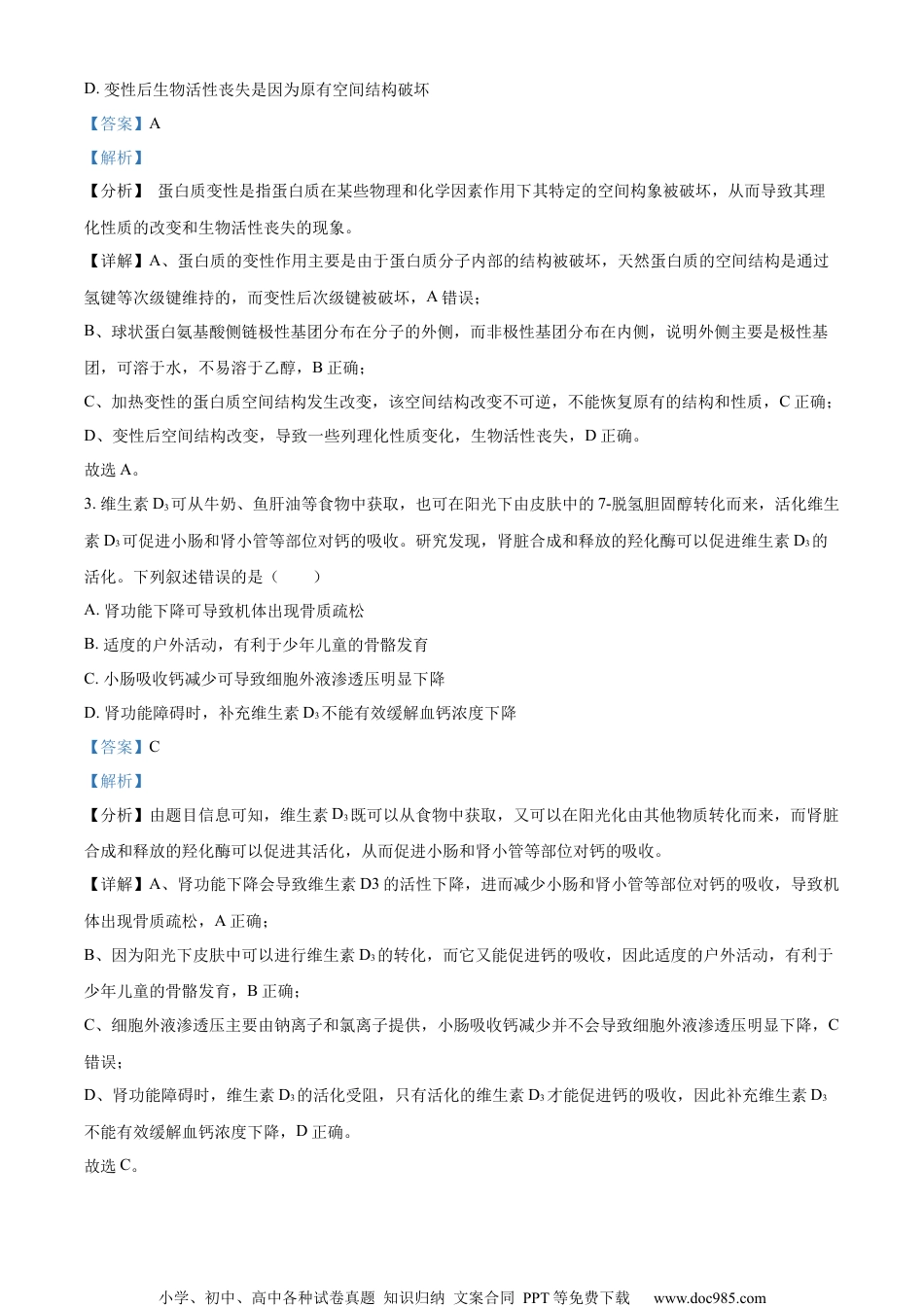 小学、初中、高中各种试卷真题知识归纳文案合同PPT等免费下载www.doc985.com2023年湖北省普通高中学业水平选择性考试生物学一、选择题:本题共18小题,在每小题给出的四个选项中,只有一项是符合题目要求的。1.栽培稻甲产量高、品质好,但每年只能收获一次。野生稻乙种植一次可连续收获多年,但产量低。中国科学家利用栽培稻甲和野生稻乙杂交,培育出兼具两者优点的品系丙,为全球作物育种提供了中国智慧。下列叙述错误的是()A.该成果体现了生物多样性的间接价值B.利用体细胞杂交技术也可培育出品系丙C.该育种技术为全球农业发展提供了新思路D.品系丙的成功培育提示我们要注重野生种质资源的保护【答案】A【解析】【分析】生物多样性的直接价值提现在食用、药用、文学艺术创作等,间接价值体现在调节生态系统的功能上,培育新品系不属于间接价值,潜在价值指的是尚未发现的。植物体细胞杂交是以原生质体培养为基础,人工诱导使不同亲本原生质体融合,并通过对异核体的培养产生体细胞杂种的技术。体细胞杂交在转移抗逆性状,进行作物改良,实现远缘重组,创造新型物种,以及定向转移胞质基因控制的性状和利用配子一体细胞杂交产生三倍体植物上显示出重要的应用前景,并对丰富种质、保持和促进生物多样性具有重大的意义。【详解】A、生物多样性的直接价值提现在食用、药用、文学艺术创作等,间接价值体现在调节生态系统的功能上,培育新品系不属于间接价值,A错误;B、植物体细胞杂交是以原生质体培养为基础,人工诱导使不同亲本原生质体融合,并通过对异核体的培养产生体细胞杂种的技术。植物体细胞杂交使远缘杂交不亲和的植物有可能实现遗传物质重组,创造和培养植物新品种乃至新物种,尤其在多基因控制农艺性状的改良上具有较大优势。因此可以利用该方法培育品系丙,B正确;C、该育种技术把栽培稻和野生稻杂交,为全球农业发展提供了新思路,C正确;D、品系丙的成功培育需要依靠野生稻的参与,提示我们要注重野生种质资源的保护,D正确。故选A。2.球状蛋白分子空间结构为外圆中空,氨基酸侧链极性基团分布在分子的外侧,而非极性基团分布在内侧。蛋白质变性后,会出现生物活性丧失及一系列理化性质的变化。下列叙述错误的是()A.蛋白质变性可导致部分肽键断裂B.球状蛋白多数可溶于水,不溶于乙醇C.加热变性的蛋白质不能恢复原有的结构和性质小学、初中、高中各种试卷真题知识归纳文案合同PPT等免费下载www.doc985.comD.变性后生物活性丧失是因为原有空间结构破坏【答案】A【解析】【分析】蛋白质变性是指蛋白质在某些物理和化学因素作用下其特定的空间构象被破坏,从而导致其理化性质的改变和生物活性丧失的现象。【详解】A、蛋白质的变性作用主要是由于蛋白质分子内部的结构被破坏,天然蛋白质的空间结构是通过氢键等次级键维持的,而变性后次级键被破坏,A错误;B、球状蛋白氨基酸侧链极性基团分布在分子的外侧,而非极性基团分布在内侧,说明外侧主要是极性基团,可溶于水,不易溶于乙醇,B正确;C、加热变性的蛋白质空间结构发生改变,该空间结构改变不可逆,不能恢复原有的结构和性质,C正确;D、变性后空间结构改变,导致一些列理化性质变化,生物活性丧失,D正确。故选A。3.维生素D3可从牛奶、鱼肝油等食物中获取,也可在阳光下由皮肤中的7-脱氢胆固醇转化而来,活化维生素D3可促进小肠和肾小管等部位对钙的吸收。研究发现,肾脏合成和释放的羟化酶可以促进维生素D3的活化。下列叙述错误的是()A.肾功能下降可导致机体出现骨质疏松B.适度的户外活动,有利于少年儿童的骨骼发育C.小肠吸收钙减少可导致细胞外液渗透压明显下降D.肾功能障碍时,补充维生素D3不能有效缓解血钙浓度下降【答案】C【解析】【分析】由题目信息可知,维生素D3既可以从食物中获取,又可以在阳光化由其他物质转化而来,而肾脏合成和释放的羟化酶可以促进其活化,从而促进小肠和肾小管等部位对钙的吸收。【详解】A、肾功能下降会导致维生素D3的活性下降,进而减少小肠和肾小管等部位对钙的吸收,导致机体出现骨质疏松,A正确;B、因为阳光下皮肤中可以进行维生素D3的转化,而它又能促进钙的吸收,因...