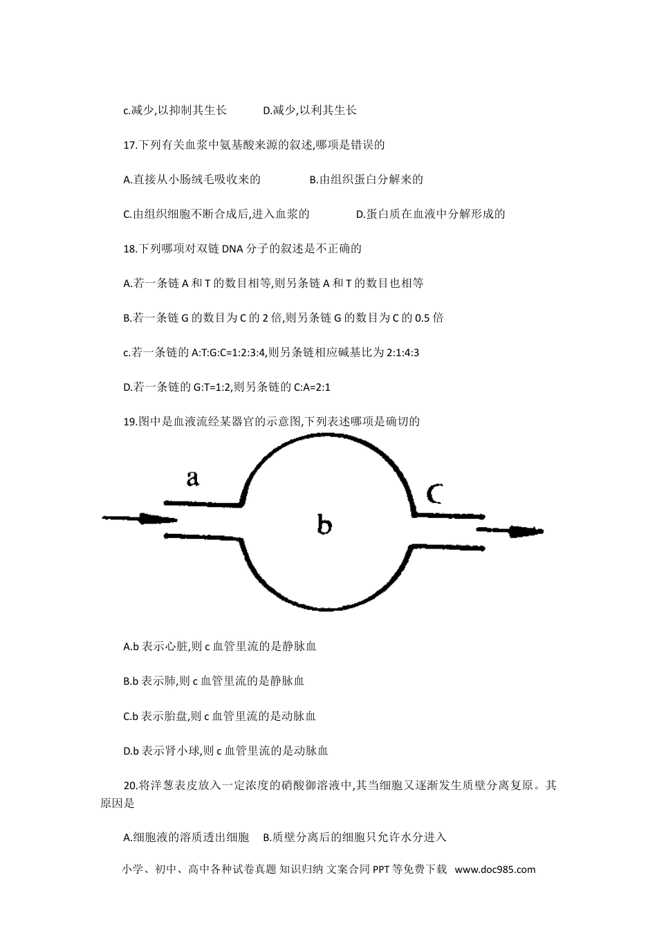 1992年海南高考生物真题及答案一、选择题:本大题共28个小题,每小题1分,共28分。在每小题给出的四个选项中,只有一项是符合题目要求的。把所选项前的字母填在括号内。1.人体内产生自细胞的器官,除了红骨髓之外,还有A.淋巴结和肝脏B.脾和扁桃体C.黄骨髓和脾D.扁桃体和肝脏2.下列哪项可以称为细胞A.肌纤维B.胶原纤维C.神经纤维D.弹性纤维3.下列哪种疾病属于呼吸道传染病A.伤寒B.流行性脑脊髓膜炎C.流行性乙型脑炎D.黑热病4.下列哪种器官不受垂体的直接控制A.胰岛B.甲状腺C.卵巢D.肾上腺5.高等动物胚的外胚层发育出A.呼吸道的上皮B.真皮C.消化道的上皮D.神经系统6.在生命起源的化学进化过程中,第二阶段形成的物质是A.NH3、CH4B.核苷酸、单糖C.原始的蛋白质、核酸D.嘌岭、嘧啶7.下列哪种神经含有传出神经纤维A.嗅神经B.面神经C.位听神经D.视神经8.桡动脉的脉搏是由于A.心脏的振动直接引起的B.心脏射出的血液冲到这里引起的C.主动脉的搏动沿着动脉管壁传来的D.桡动脉的血压造成的9.下列有关脑灰质分布的叙述,哪项是正确的小学、初中、高中各种试卷真题知识归纳文案合同PPT等免费下载www.doc985.comA.集中于脑的深部B.集中于脑的表层C,均匀分散于脑的各部D.在脑的不同部分,分布不同10.下列有关青春期特征的叙述,哪项是不正确的A.男女出现各自的第二性征B.大脑兴奋性比较强C.性激素开始分泌D.标志着身体已经完全发育成熟11.下列有关肝脏功能的叙述,哪项是错误的A、合成蛋白质B、产生激素C、分泌消化液D、有解毒作用12.下列哪项生理活动是由脑神经直接支配的A.心跳加快B.汗腺分泌C.皮肤血管收缩D.促进胃肠运动13.硝化细菌通过化能合成作用形成有机物,需要下列哪种环境条件A.具有NH3及缺氧B.具有NH3和氧c.具有硝酸和氧D.具有硝酸及缺氧14.下列对皮肤功能的叙述,哪项是有错误的A.具有弹性、韧性,起保护作用B.通过汗腺分泌及皮肤血管的收缩与舒张,起调节体温作用C.通过汗腺和皮脂腺的分泌,起排泄作用D.接受冷、热、触、痛等刺激,起感受作用15.下列哪组色素是叶绿体和有色体都含有的A.叶绿素和类胡萝卡素B.叶绿素和叶黄素c.叶绿素和胡萝卡素D.叶黄素和胡萝卡素16.在棉花栽培过程中,需要摘心(打顶)使侧芽的生长素量A.增加,以抑制其生长B.增加,以利其生长小学、初中、高中各种试卷真题知识归纳文案合同PPT等免费下载www.doc985.comc.减少,以抑制其生长D.减少,以利其生长17.下列有关血浆中氨基酸来源的叙述,哪项是错误的A.直接从小肠绒毛吸收来的B.由组织蛋白分解来的C.由组织细胞不断合成后,进入血浆的D.蛋白质在血液中分解形成的18.下列哪项对双链DNA分子的叙述是不正确的A.若一条链A和T的数目相等,则另条链A和T的数目也相等B.若一条链G的数目为C的2倍,则另条链G的数目为C的0.5倍c.若一条链的A:T:G:C=1:2:3:4,则另条链相应碱基比为2:1:4:3D.若一条链的G:T=1:2,则另条链的C:A=2:119.图中是血液流经某器官的示意图,下列表述哪项是确切的A.b表示心脏,则c血管里流的是静脉血B.b表示肺,则c血管里流的是静脉血C.b表示胎盘,则c血管里流的是动脉血D.b表示肾小球,则c血管里流的是动脉血20.将洋葱表皮放入一定浓度的硝酸御溶液中,其当细胞又逐渐发生质壁分离复原。其原因是A.细胞液的溶质透出细胞B.质壁分离后的细胞只允许水分进入小学、初中、高中各种试卷真题知识归纳文案合同PPT等免费下载www.doc985.comC.K+和N03-离子进入了液泡D.水分和溶质自由地迸出细胞21.下列有关腹部肌群在深呼吸中作用的叙述.哪项是正确的?A.收缩时,腹压减小,协助吸气B.舒张时,腹压增大,协助吸气C.收缩时,腹压增大,协助呼气D.舒张时,腹压减小,协助呼气22.下列是血糖代谢图解,指出哪项是不正确的A.①B.②C.③D.④23.决定猫的毛色基因位于X染色体上,基因型bb、BB和Bb的猫分别为黄、黑和虎斑色。现有虎斑色雌猫与黄色雄猫交配,生下三只虎斑色小猫和一只黄色小猫,它们的性别是A.全为雌猫或三雌一雄B.全为雄猫或三雄一雌c.全为雌猫或全为雄猫D.雌雄各半24.一对夫妻都正常,他们的父母也正常,妻子的弟弟是色盲。请你预测,他们的儿子是色盲的几率是A.1B.1/2C.1/4D.1/825.人类多指基因(T〉是正常〈t)的显性,白化基因(a〉是正常〈A)的隐...