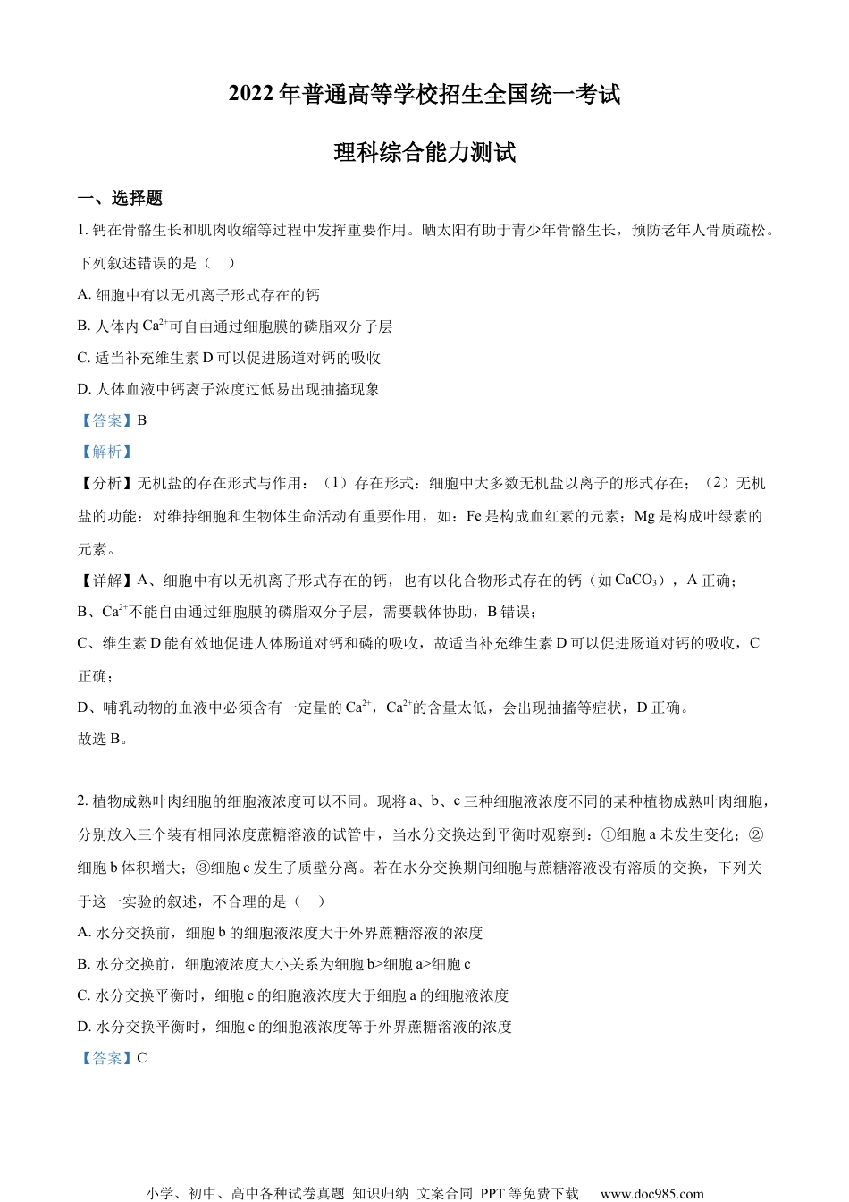 小学、初中、高中各种试卷真题知识归纳文案合同PPT等免费下载www.doc985.com2022年普通高等学校招生全国统一考试理科综合能力测试一、选择题1.钙在骨骼生长和肌肉收缩等过程中发挥重要作用。晒太阳有助于青少年骨骼生长,预防老年人骨质疏松。下列叙述错误的是()A.细胞中有以无机离子形式存在的钙B.人体内Ca2+可自由通过细胞膜的磷脂双分子层C.适当补充维生素D可以促进肠道对钙的吸收D.人体血液中钙离子浓度过低易出现抽搐现象【答案】B【解析】【分析】无机盐的存在形式与作用:(1)存在形式:细胞中大多数无机盐以离子的形式存在;(2)无机盐的功能:对维持细胞和生物体生命活动有重要作用,如:Fe是构成血红素的元素;Mg是构成叶绿素的元素。【详解】A、细胞中有以无机离子形式存在的钙,也有以化合物形式存在的钙(如CaCO3),A正确;B、Ca2+不能自由通过细胞膜的磷脂双分子层,需要载体协助,B错误;C、维生素D能有效地促进人体肠道对钙和磷的吸收,故适当补充维生素D可以促进肠道对钙的吸收,C正确;D、哺乳动物的血液中必须含有一定量的Ca2+,Ca2+的含量太低,会出现抽搐等症状,D正确。故选B。2.植物成熟叶肉细胞的细胞液浓度可以不同。现将a、b、c三种细胞液浓度不同的某种植物成熟叶肉细胞,分别放入三个装有相同浓度蔗糖溶液的试管中,当水分交换达到平衡时观察到:①细胞a未发生变化;②细胞b体积增大;③细胞c发生了质壁分离。若在水分交换期间细胞与蔗糖溶液没有溶质的交换,下列关于这一实验的叙述,不合理的是()A.水分交换前,细胞b的细胞液浓度大于外界蔗糖溶液的浓度B.水分交换前,细胞液浓度大小关系为细胞b>细胞a>细胞cC.水分交换平衡时,细胞c的细胞液浓度大于细胞a的细胞液浓度D.水分交换平衡时,细胞c的细胞液浓度等于外界蔗糖溶液的浓度【答案】C小学、初中、高中各种试卷真题知识归纳文案合同PPT等免费下载www.doc985.com【解析】【分析】由题分析可知,水分交换达到平衡时细胞a未发生变化,既不吸水也不失水,细胞a的细胞液浓度等于外界蔗糖溶液的浓度;细胞b的体积增大,说明细胞吸水,水分交换前,细胞b的细胞液浓度大于外界蔗糖溶液的浓度;细胞c发生质壁分离,说明细胞失水,水分交换前,细胞c的细胞液浓度小于外界蔗糖溶液的浓度。【详解】A、由于细胞b在水分交换达到平衡时细胞的体积增大,说明细胞吸水,则水分交换前,细胞b的细胞液浓度大于外界蔗糖溶液的浓度,A正确;B、水分交换达到平衡时,细胞a的细胞液浓度等于外界蔗糖溶液的浓度,细胞b的细胞液浓度大于外界蔗糖溶液的浓度,细胞c的细胞液浓度小于外界蔗糖溶液的浓度,因此水分交换前,细胞液浓度大小关系为细胞b>细胞a>细胞c,B正确;C、由题意可知,水分交换达到平衡时,细胞a未发生变化,说明其细胞液浓度与外界蔗糖溶液浓度相等;水分交换达到平衡时,虽然细胞内外溶液浓度相同,但细胞c失水后外界蔗糖溶液的浓度减小,因此,水分交换平衡时,细胞c的细胞液浓度小于细胞a的细胞液浓度,C错误D、在一定的蔗糖溶液中,细胞c发生了质壁分离,水分交换达到平衡时,其细胞液浓度等于外界蔗糖溶液的浓度,D正确。故选C。3.植物激素通常与其受体结合才能发挥生理作用。喷施某种植物激素,能使某种作物的矮生突变体长高。关于该矮生突变体矮生的原因,下列推测合理的是()A.赤霉素合成途径受阻B.赤霉素受体合成受阻C.脱落酸合成途径受阻D.脱落酸受体合成受阻【答案】A【解析】【分析】赤霉素:合成部位:幼芽、幼根和未成熟的种子等幼嫩部分;主要生理功能:促进细胞的伸长;解除种子、块茎的休眠并促进萌发的作用。【详解】AB、赤霉素具有促进细胞伸长的功能,该作用的发挥需要与受体结合后才能完成,故喷施某种激素后作物的矮生突变体长高,说明喷施的为赤霉素,矮生突变体矮生的原因是缺乏赤霉素而非受体合成受阻(若受体合成受阻,则外源激素也不能起作用),A正确,B错误;CD、脱落酸抑制植物细胞的分裂和种子的萌发,与植物矮化无直接关系,CD错误。故选A。4.线粒体是细胞进行有氧呼吸的主要场所。研究发现,经常运动的人肌细胞中线粒体数量通常比缺乏锻炼小学、初中、高中各种...