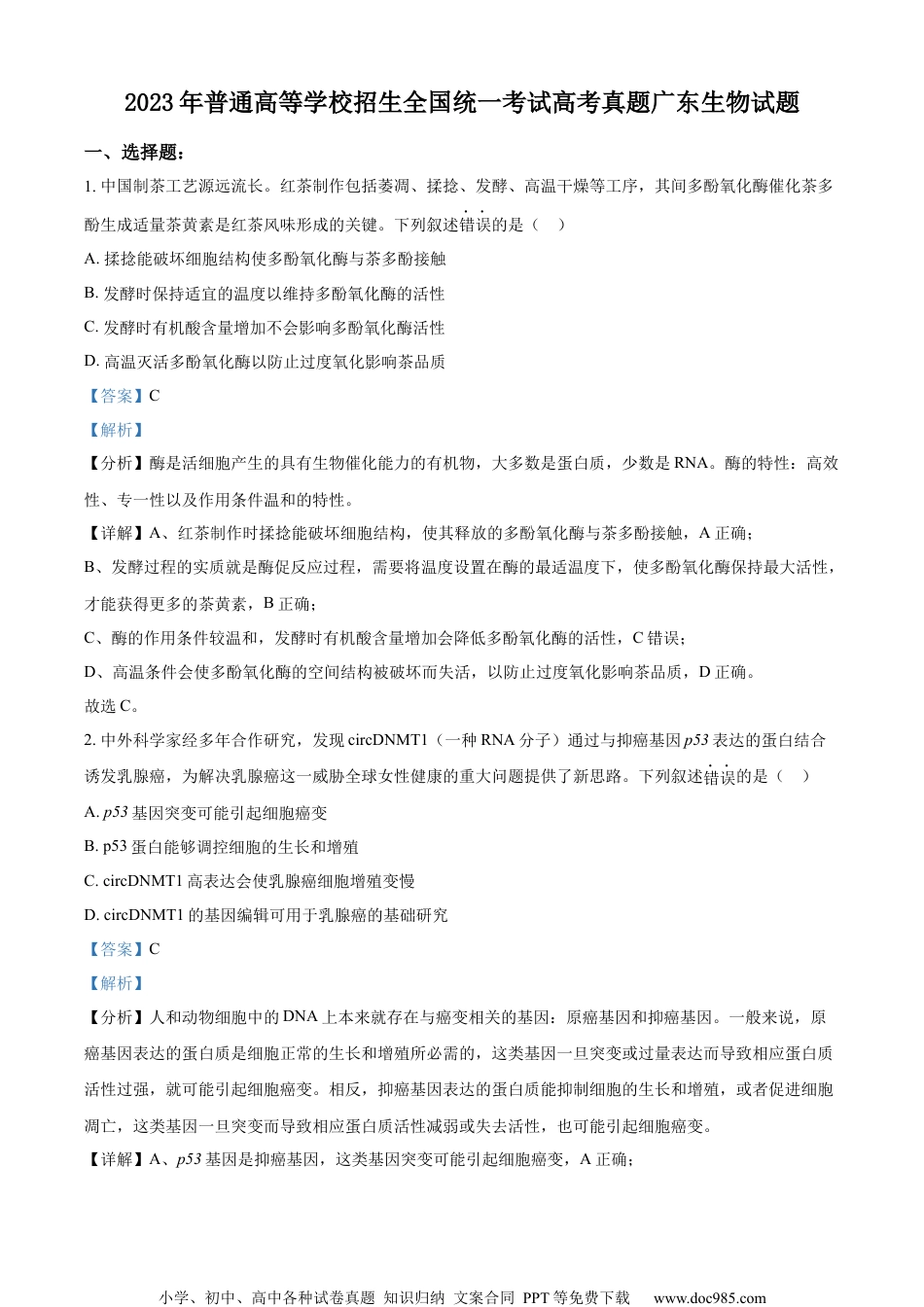 小学、初中、高中各种试卷真题知识归纳文案合同PPT等免费下载www.doc985.com2023年普通高等学校招生全国统一考试高考真题广东生物试题一、选择题:1.中国制茶工艺源远流长。红茶制作包括萎凋、揉捻、发酵、高温干燥等工序,其间多酚氧化酶催化茶多酚生成适量茶黄素是红茶风味形成的关键。下列叙述错误的是()A.揉捻能破坏细胞结构使多酚氧化酶与茶多酚接触B.发酵时保持适宜的温度以维持多酚氧化酶的活性C.发酵时有机酸含量增加不会影响多酚氧化酶活性D.高温灭活多酚氧化酶以防止过度氧化影响茶品质【答案】C【解析】【分析】酶是活细胞产生的具有生物催化能力的有机物,大多数是蛋白质,少数是RNA。酶的特性:高效性、专一性以及作用条件温和的特性。【详解】A、红茶制作时揉捻能破坏细胞结构,使其释放的多酚氧化酶与茶多酚接触,A正确;B、发酵过程的实质就是酶促反应过程,需要将温度设置在酶的最适温度下,使多酚氧化酶保持最大活性,才能获得更多的茶黄素,B正确;C、酶的作用条件较温和,发酵时有机酸含量增加会降低多酚氧化酶的活性,C错误;D、高温条件会使多酚氧化酶的空间结构被破坏而失活,以防止过度氧化影响茶品质,D正确。故选C。2.中外科学家经多年合作研究,发现circDNMT1(一种RNA分子)通过与抑癌基因p53表达的蛋白结合诱发乳腺癌,为解决乳腺癌这一威胁全球女性健康的重大问题提供了新思路。下列叙述错误的是()A.p53基因突变可能引起细胞癌变B.p53蛋白能够调控细胞的生长和增殖C.circDNMT1高表达会使乳腺癌细胞增殖变慢D.circDNMT1的基因编辑可用于乳腺癌的基础研究【答案】C【解析】【分析】人和动物细胞中的DNA上本来就存在与癌变相关的基因:原癌基因和抑癌基因。一般来说,原癌基因表达的蛋白质是细胞正常的生长和增殖所必需的,这类基因一旦突变或过量表达而导致相应蛋白质活性过强,就可能引起细胞癌变。相反,抑癌基因表达的蛋白质能抑制细胞的生长和增殖,或者促进细胞凋亡,这类基因一旦突变而导致相应蛋白质活性减弱或失去活性,也可能引起细胞癌变。【详解】A、p53基因是抑癌基因,这类基因突变可能引起细胞癌变,A正确;小学、初中、高中各种试卷真题知识归纳文案合同PPT等免费下载www.doc985.comB、p53基因是抑癌基因,抑癌基因表达的蛋白质能抑制细胞的生长和增殖,或促进细胞凋亡,B正确;C、依据题意,circDNMT1通过与抑癌基因p53表达的蛋白结合诱发乳腺癌,则circDNMT1高表达会使乳腺癌细胞增殖变快,C错误;D、circDNMT1的基因编辑可用于乳腺癌的基础研究,D正确。故选C。3.科学家采用体外受精技术获得紫羚羊胚胎,并将其移植到长角羚羊体内,使后者成功妊娠并产仔,该工作有助于恢复濒危紫羚羊的种群数量。此过程不涉及的操作是()A.超数排卵B.精子获能处理C.细胞核移植D.胚胎培养【答案】C【解析】【分析】体外受精主要包括:卵母细胞的采集和培养、精子的采集和获能、受精。(1)卵母细胞的采集和培养①主要方法是:用促性腺激素处理,使其超数排卵,然后,从输卵管中冲取卵子。②第二种方法:从已屠宰母畜的卵巢中采集卵母细胞或直接从活体动物的卵巢中吸取卵母细胞。(2)精子的采集和获能①收集精子的方法:假阴道法、手握法和电刺激法;②对精子进行获能处理:包括培养法和化学诱导法。(3)受精:在获能溶液或专用的受精溶液中完成受精过程。【详解】由题干信息可知,该过程通过体外受精获得胚胎,再通过胚胎移植,使长角羚羊成功妊娠并产仔,因此需要进行超数排卵、精子获能处理,并对获得的受精卵进行胚胎培养;由于该过程为有性生殖,因此不需要涉及细胞核移植,所以C正确、ABD错误。故选C。4.下列叙述中,能支持将线粒体用于生物进化研究的是()A.线粒体基因遗传时遵循孟德尔定律B.线粒体DNA复制时可能发生突变C.线粒体存在于各地质年代生物细胞中D.线粒体通过有丝分裂的方式进行增殖【答案】B【解析】【分析】线粒体属于真核细胞的细胞器,有外膜和内膜,内膜向内折叠形成嵴。线粒体中含有DNA和RNA,能合成部分蛋白质,属于半自主细胞器。【详解】A、孟德尔遗传定律适用于真核生物核基因的遗传,线粒体基因属于质基因,A错...