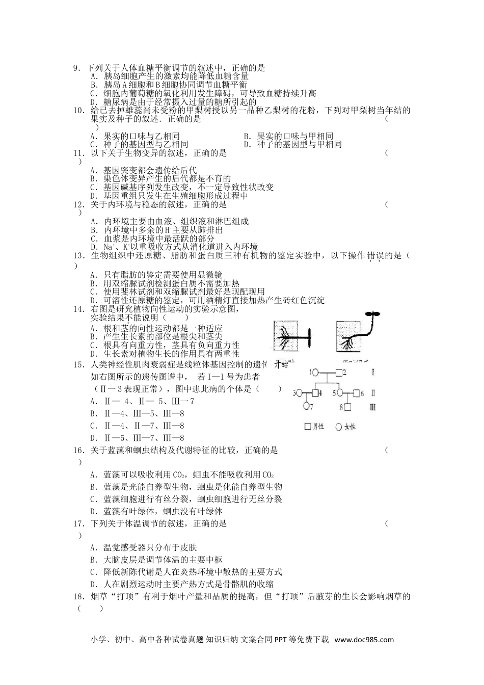 2005年广东高考生物真题及答案本试卷分第Ⅰ卷(选择题)和第Ⅱ卷(非选择)题两部分,满分150分.考试用时120分钟.注意事项:1.答卷前,考生务必用黑色字迹的钢笔或签字笔将自己的姓名和考生号填写在答题卡上。用2B铅笔将答题卡试卷类型(B)填涂在答题卡上。并在答题卡右上角的“试室号”和“座位号”栏填写试室号、座位号,将相应的试室号、座位号信息点涂黑。2.选择题每小题选出答案后,用2B铅笔把答题卡上对应题目的答案标号涂黑,如需改动,用橡皮擦干净后,再选涂其他答案,答案不能答在试卷上。3.非选择题必须用黑色字迹钢笔或签字笔作答,答案必须写在答题卡各题目指定区域内相应位置上;如需改动,先划掉原来的答案,然后再写上新的答案;不准使用铅笔和涂改液。不按以上要求作答的答案无效。4.考生必须保持答题卡的整洁,考试结束后,将试卷和答题卡一并交回。第Ⅰ卷(选择题,共70分)一、选择题:本题共26小题,每小题2分,共52分。每小题给出的四个选项中,只有一个选项最符合题目要求。1.细胞有丝分裂完成后.平均分配到两个子细胞的物质是()A.叶绿体DNAB.线粒体DNAC.细胞核DNAD.核糖体RNA2.下列选项中,全部属于植物必需的大量矿质元素是()A.P、N、Mn、KB.Ca、N、P、KC.Fe、S、P、ND.N、S、H、P3.甲(〇)乙(●)两种物质在细胞膜两侧的分布情况如右图(颗粒的多少表示浓度的高低),在进行跨膜运输时,下列说法正确的是()A.甲进入细胞一定需要能量B.甲运出细胞一定不需要能量C.乙进入细胞一定有载体蛋白的参与D.乙运出细胞一定有载体蛋白的参与4.叶绿体色素的纸层析结果显示.叶绿素b位于层析滤纸的最下端,原因是()A.在层祈液中的溶解度最小B.在层析液中的溶解度最大C.分子量最小D.分子量最大5.关于单克隆抗体,下列叙述不正确的是()A.可以制成诊断盒.用于疾病的诊断B.可以在生物体内生产,不能体外生产C.可以利用基因工程技术生产D.可以与药物结合,用于病变细胞的定向治疗6.植物扦插繁殖时,需要对插枝进行去除成熟叶片、保留芽和幼叶等处理,这样可以促进插枝成活。其原因是()①芽和幼叶生长迅速.容易成活②芽和幼叶储存较多的营养物质③芽和幼叶能产生生长素,促进生根④去除成熟叶片可降低蒸腾作用A.①②B.③④C.①④D.②③7.SARS病原体是一种冠状病毒,其遗传物质是一条单链RNA,下列关于SARS病毒的叙述中,正确的是()A.能在寄主细胞内合成多种蛋白质B.DNA和RNA同时存在C.可独立生活和复制D.含有简单的细胞器8.下列关于种群、群落和生态系统的描述,不正确的是()A.生物群落的结构是随着时间的推移而不断变化的B.研究海洋鱼类种群数量变化规律有利于确定合理的捕捞量C.北极苔原生态系统的抵抗力稳定性较低D.农田生态系统对太阳能的利用率高于森林生态系统小学、初中、高中各种试卷真题知识归纳文案合同PPT等免费下载www.doc985.com9.下列关于人体血糖平衡调节的叙述中,正确的是A.胰岛细胞产生的激素均能降低血糖含量B.胰岛A细胞和B细胞协同调节血糖平衡C.细胞内葡萄糖的氧化利用发生障碍,可导致血糖持续升高D.糖尿病是由于经常摄入过量的糖所引起的10.给已去掉雄蕊尚未受粉的甲梨树授以另一品种乙梨树的花粉,下列对甲梨树当年结的果实及种子的叙述.正确的是()A.果实的口味与乙相同B.果实的口味与甲相同C.种子的基因型与乙相同D.种子的基因型与甲相同11.以下关于生物变异的叙述,正确的是()A.基因突变都会遗传给后代B.染色体变异产生的后代都是不育的C.基因碱基序列发生改变,不一定导致性状改变D.基因重组只发生在生殖细胞形成过程中12.关于内环境与稳态的叙述,正确的是()A.内环境主要由血液、组织液和淋巴组成B.内环境中多余的H+主要从肺排出C.血浆是内环境中最活跃的部分D.Na+、K+以重吸收方式从消化道进入内环境13.生物组织中还原糖、脂肪和蛋白质三种有机物的鉴定实验中,以下操作错误的是()A.只有脂肪的鉴定需要使用显微镜B.用双缩脲试剂检测蛋白质不需要加热C.使用斐林试剂和双缩脲试剂最好是现配现用D.可溶性还原糖的鉴定,可用酒精灯直接加热...
