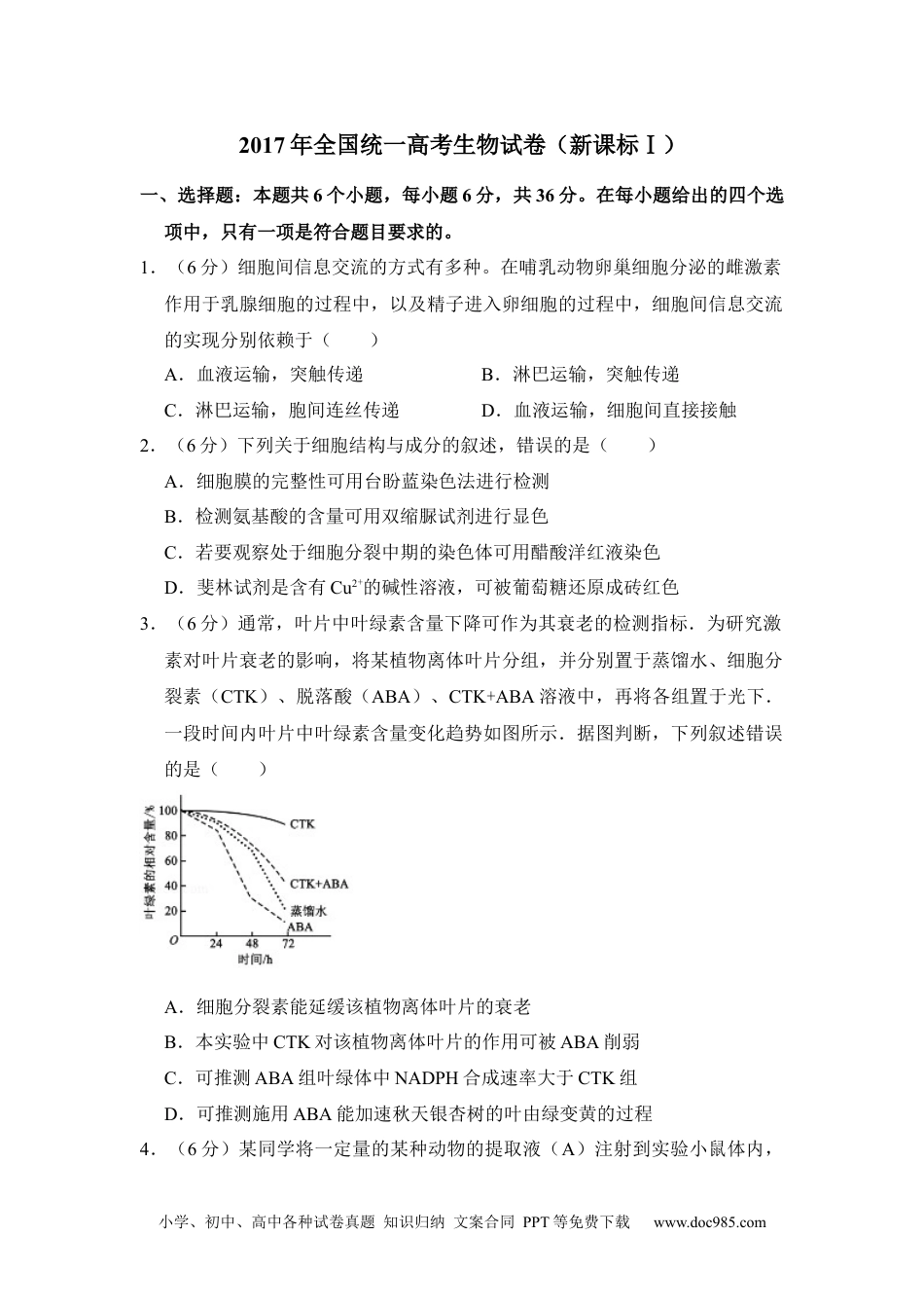 小学、初中、高中各种试卷真题知识归纳文案合同PPT等免费下载www.doc985.com2017年全国统一高考生物试卷(新课标Ⅰ)一、选择题:本题共6个小题,每小题6分,共36分。在每小题给出的四个选项中,只有一项是符合题目要求的。1.(6分)细胞间信息交流的方式有多种。在哺乳动物卵巢细胞分泌的雌激素作用于乳腺细胞的过程中,以及精子进入卵细胞的过程中,细胞间信息交流的实现分别依赖于()A.血液运输,突触传递B.淋巴运输,突触传递C.淋巴运输,胞间连丝传递D.血液运输,细胞间直接接触2.(6分)下列关于细胞结构与成分的叙述,错误的是()A.细胞膜的完整性可用台盼蓝染色法进行检测B.检测氨基酸的含量可用双缩脲试剂进行显色C.若要观察处于细胞分裂中期的染色体可用醋酸洋红液染色D.斐林试剂是含有Cu2+的碱性溶液,可被葡萄糖还原成砖红色3.(6分)通常,叶片中叶绿素含量下降可作为其衰老的检测指标.为研究激素对叶片衰老的影响,将某植物离体叶片分组,并分别置于蒸馏水、细胞分裂素(CTK)、脱落酸(ABA)、CTK+ABA溶液中,再将各组置于光下.一段时间内叶片中叶绿素含量变化趋势如图所示.据图判断,下列叙述错误的是()A.细胞分裂素能延缓该植物离体叶片的衰老B.本实验中CTK对该植物离体叶片的作用可被ABA削弱C.可推测ABA组叶绿体中NADPH合成速率大于CTK组D.可推测施用ABA能加速秋天银杏树的叶由绿变黄的过程4.(6分)某同学将一定量的某种动物的提取液(A)注射到实验小鼠体内,小学、初中、高中各种试卷真题知识归纳文案合同PPT等免费下载www.doc985.com注射后若干天,未见小鼠出现明显的异常表现。将小鼠分成两组,一组注射少量的A,小鼠很快发生了呼吸困难等症状;另一组注射生理盐水,未见小鼠有异常表现。对实验小鼠在第二次注射A后的表现,下列解释合理的是()A.提取液中含有胰岛素,导致小鼠血糖浓度降低B.提取液中含有乙酰胆碱,使小鼠骨骼肌活动减弱C.提取液中含有过敏原,引起小鼠发生了过敏反应D.提取液中含有呼吸抑制剂,可快速作用于小鼠呼吸系统5.(6分)假设某草原上散养的某种家畜种群呈S型增长,该种群的增长率随种群数量的变化趋势如图所示。若要持续尽可能多地收获该种家畜,则应在种群数量合适时开始捕获,下列四个种群数量中合适的是()A.甲点对应的种群数量B.乙点对应的种群数量C.丙点对应的种群数量D.丁点对应的种群数量6.(6分)果蝇的红眼基因(R)对白眼基因(r)为显性,位于X染色体上;长翅基因(B)对残翅基因(b)为显性,位于常染色体上.现有一只红眼长翅果蝇与一只白眼长翅果蝇交配,F1雄蝇中有为白眼残翅,下列叙述错误的是()A.亲本雌蝇的基因型是BbXRXrB.F1中出现长翅雄蝇的概率为C.雌、雄亲本产生含Xr配子的比例相同D.白眼残翅雌蝇可形成基因型为bXr的极体二、非选择题:共54分。第7~10题为必考题,每个试题考生都必须作答。第11~12为选考题,考生根据要求作答。小学、初中、高中各种试卷真题知识归纳文案合同PPT等免费下载www.doc985.com7.(10分)根据遗传物质的化学组成,可将病毒分为RNA病毒和DNA病毒两种类型。有些病毒对人类健康会造成很大危害。通常,一种新病毒出现后需要确定该病毒的类型。假设在宿主细胞内不发生碱基之间的相互转换。请利用放射性同位素标记的方法,以体外培养的宿主细胞等为材料,设计实验以确定一种新病毒的类型。简要写出(1)实验思路,(2)预期实验结果及结论即可。(要求:实验包含可相互印证的甲、乙两个组)。8.(9分)植物的CO2补偿点是指由于CO2的限制,光合速率与呼吸速率相等时环境中的CO2浓度.已知甲种植物的CO2补偿点大于乙种植物的.回答下列问题:(1)将正常生长的甲、乙两种植物放置在同一密闭小室中,适宜条件下照光培养.培养后发现两种植物的光合速率都降低,原因是.甲种植物净光合速率为0时,乙种植物净光合速率(填“大于0”“等于0”“小于0”).(2)若将甲种植物密闭在无O2、但其他条件适宜的小室中,照光培养一段时间后,发现植物的有氧呼吸增加,原因是.9.(8分)血浆渗透压可分为胶体渗透压和晶体渗透压,其中,由蛋白质等大分...