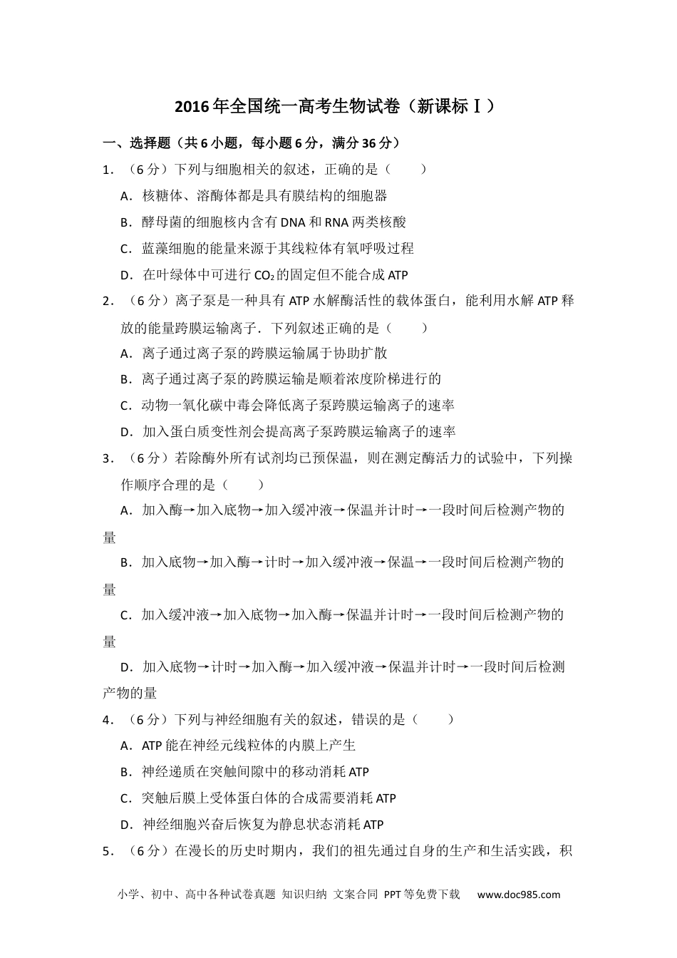 小学、初中、高中各种试卷真题知识归纳文案合同PPT等免费下载www.doc985.com2016年全国统一高考生物试卷(新课标Ⅰ)一、选择题(共6小题,每小题6分,满分36分)1.(6分)下列与细胞相关的叙述,正确的是()A.核糖体、溶酶体都是具有膜结构的细胞器B.酵母菌的细胞核内含有DNA和RNA两类核酸C.蓝藻细胞的能量来源于其线粒体有氧呼吸过程D.在叶绿体中可进行CO2的固定但不能合成ATP2.(6分)离子泵是一种具有ATP水解酶活性的载体蛋白,能利用水解ATP释放的能量跨膜运输离子.下列叙述正确的是()A.离子通过离子泵的跨膜运输属于协助扩散B.离子通过离子泵的跨膜运输是顺着浓度阶梯进行的C.动物一氧化碳中毒会降低离子泵跨膜运输离子的速率D.加入蛋白质变性剂会提高离子泵跨膜运输离子的速率3.(6分)若除酶外所有试剂均已预保温,则在测定酶活力的试验中,下列操作顺序合理的是()A.加入酶→加入底物→加入缓冲液→保温并计时→一段时间后检测产物的量B.加入底物→加入酶→计时→加入缓冲液→保温→一段时间后检测产物的量C.加入缓冲液→加入底物→加入酶→保温并计时→一段时间后检测产物的量D.加入底物→计时→加入酶→加入缓冲液→保温并计时→一段时间后检测产物的量4.(6分)下列与神经细胞有关的叙述,错误的是()A.ATP能在神经元线粒体的内膜上产生B.神经递质在突触间隙中的移动消耗ATPC.突触后膜上受体蛋白体的合成需要消耗ATPD.神经细胞兴奋后恢复为静息状态消耗ATP5.(6分)在漫长的历史时期内,我们的祖先通过自身的生产和生活实践,积小学、初中、高中各种试卷真题知识归纳文案合同PPT等免费下载www.doc985.com累了对生态方面的感性认识和经验,并形成了一些生态学思想,如:自然与人和谐统一的思想.根据这一思想和生态学知识,下列说法错误的是()A.生态系统的物质循环和能量流动有其自身的运行规律B.若人与自然和谐统一,生产者固定的能量便可反复利用C.“退耕还林、还草”是体现自然与人和谐统一思想的实例D.人类应以保持生态系统相对稳定为原则,确定自己的消耗标准6.(6分)理论上,下列关于人类单基因遗传病的叙述,正确的是()A.常染色体隐性遗传病在男性中的发病率等于该病致病基因的基因频率B.常染色体显性遗传病在女性中的发病率等于该病致病基因的基因频率C.X染色体显性遗传病在女性中的发病率等于该病致病基因的基因频率D.X染色体隐性遗传病在男性中的发病率等于该病致病基因的基因频率二、解答题(共4小题,满分39分)7.(10分)有关DNA分子的研究中,常用32P来标记DNA分子.用α、β和γ表示ATP或dATP(d表示脱氧)上三个磷酸基团所处的位置(APα﹣~Pβ~Pγ或dAPα﹣~Pβ~Pγ).回答下列问题;(1)某种酶可以催化ATP的一个磷酸基团转移到DNA末端上,同时产生ADP.若要用该酶把32P标记到DNA末端上,那么带有32P的磷酸基团应在ATP的(填“α”“β”或γ”)位上.(2)若用带有32P标记的dATP作为DNA生物合成的原料,将32P标记到新合成的DNA分子上,则带有32P的磷酸基团应在dATP的(填“α”“β”或γ”)位上.(3)将一个带有某种噬菌体DNA分子的两条链用32P进行标记,并使其感染大肠杆菌,在不含有32P的培养基中培养一段时间.若得到的所有噬菌体双链DNA分子都装配成噬菌体(n个)并释放,则其中含有32P的噬菌体所占比例为,原因是.8.(8分)为了探究生长条件对植物光合作用的影响,某研究小组将某品种植小学、初中、高中各种试卷真题知识归纳文案合同PPT等免费下载www.doc985.com物的盆栽苗分成甲、乙两组,置于人工气候室中,甲组模拟自然光照,乙组提供低光照,其他培养条件相同。培养较长一段时间(T)后,测定两组植株叶片随光照强度变化的光合作用强度(即单位时间、单位面积吸收CO2的量),光合作用强度随光照强度的变化趋势如图所示。回答下列问题:(1)据图判断,光照强度低于a时,影响甲组植物光合作用的限制因子是;(2)b光照强度下,要使甲组的光合作用强度升高,可以考虑的措施是提高(填“CO2浓度”或“O2浓度”)(3)播种乙组植株产生的种子,得到的盆栽按照甲组的条件培养T时间后,再...