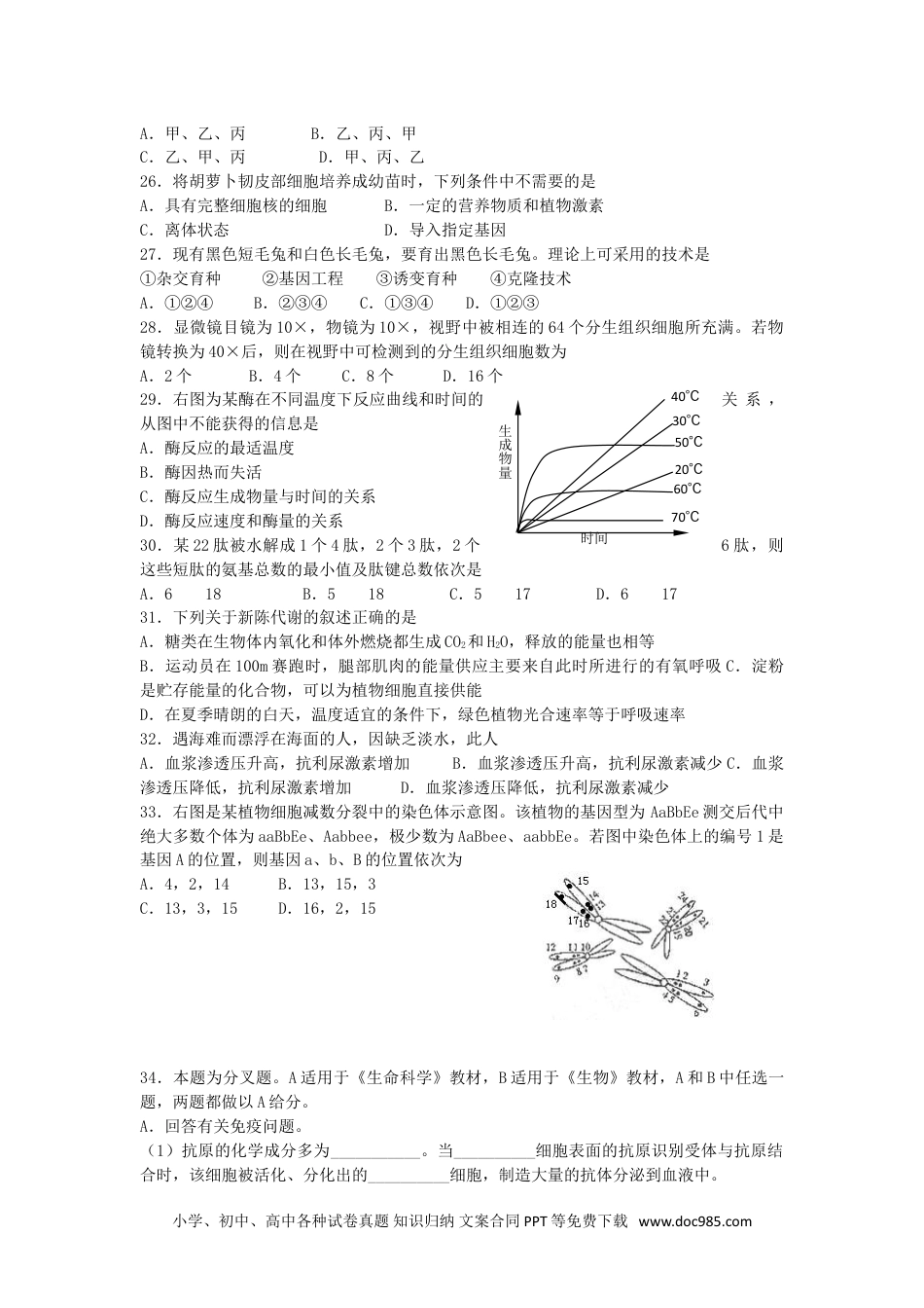 2005年上海高考生物真题及答案一、单选题(共60分,每小题只有一个正确选项)1.1921年弗雷德里克·班廷从狗的体内分离得到天然胰岛素。40多年后,首次人工合成结晶牛胰岛素的科学家是A.中国人B.加拿大人C.美国人D.德国人2.轴突是神经细胞的A.一种细胞器B.保护结构C.分泌物D.突起3.组成DNA的结构的基本成分是①核糖②脱氧核糖③磷酸④腺嘌呤、鸟嘌呤、胞嘧啶⑤胸腺嘧啶⑥尿嘧啶A.①③④⑤B.①②④⑥C.②③④⑤D.②③④⑥4.氧气透过肺泡进入毛细血管的过程是A.全部为主动运输B.大部分为扩散作用,少部分为主动运输C.全部为扩散作用D.少部分为扩散作用,大部分为主动运输5.tRNA与mRNA碱基互补配对现象可出现在真核细胞的A.细胞核中B.核糖体上C.核膜上D.核孔处6.在正常情况下,下列有关X染色体的叙述错误的是A.女性体细胞内有两条X染色体B.男性体细胞内有一条X染色体C.X染色体上的基因均与性别决定有关D.黑猩猩等哺乳动物也有X染色体7.将盛有一定浓度蔗糖溶液的透析袋口扎紧后浸于蒸馏水中,下图表示透析袋中蔗糖溶液浓度与时间的关系,正确的是8.将B型血人的红细胞和另一个人的血清混合,不发生凝集,则此血清供应者的血型可能为A.只可能是B型B.A型或AB型C.B型或AB型D.B型或O型9.从生态学角度分析,生态系统中流动的能量最初来源于A.光合作用B.高能化学键C.绿色植物D.太阳光能10.下列激素的生理作用相互拮抗的是A.胰岛素与胰高血糖素B.甲状腺素与肾上腺素C.肾上腺素与胰高血糖素D.生长激素与甲状腺素11.含有2000个碱基的DNA,每条链上的碱基排列方式有A.42000个B.41000个C.22000个D.21000个小学、初中、高中各种试卷真题知识归纳文案合同PPT等免费下载www.doc985.com时间蔗糖溶液浓度A时间蔗糖溶液浓度B时间蔗糖溶液浓度C时间蔗糖溶液浓度D12.人体细胞有丝分裂时,产生的四分体个数是A.46B.23C.4D.013.右图是一个哺乳动物细胞的示意图,它属于A.精巢中的细胞B.受精卵C.骨髓干细胞D.雄配子14.一段原核生物的mRNA通过翻译可合成一条含有11个肽键的多肽,则此mRNA分子至少含有的碱基个数及合成这段多肽需要的tRNA个数,依次为A.3311B.3612C.1236D.113615.雌性家兔体细胞中高尔基体数量最多的是A.神经细胞B.心肌细胞C.乳腺细胞D.红细胞16.下列关于脑和脊髓的叙述中正确的是A.脑外包有骨骼,脊髓外无骨骼B.脑和脊髓都与反射有关C.反射仅与脊髓有关D.神经元细胞体位于脑和脊髓表面17.某单细胞生物,体内不具有叶绿体但有叶绿素,它最可能是A.真核生物B.异养生物C.无核膜的生物D.有线粒体的生物18.下列关于顶端优势的叙述中错误的是A.顶芽生长衰弱,促进侧芽生长B.除去顶芽,侧芽生长被抑制C.顶芽优先生长时,侧芽生长受到抑制D.切除顶芽,切口涂以高浓度生长素,侧芽生长抑制19.酵母菌发酵产生CO2的摩尔数为N,在安静情况下,人消耗同样数量的葡萄糖可以产生的CO2量是A.1/3NmolB.3NmolC.6NmolD.12Nmol20.生长在自然保护区北坡的野生稻,其叶片的两个主要生理功能是A.吸收矿质元素和呼吸作用B.光合作用和蒸腾作用C.吸收水分和光合作用D.吸收水分和蒸腾作用21.右图为患红绿色盲的某家族系谱图,该病为隐性伴性遗传,其中7号的致病基因来自A.1号B.2号C.3号D.4号22.蝌蚪变态成青蛙时,尾部消失的机制是A.青蛙个体大,尾部相对小B.青蛙上岸后,尾部组织脱水缩小C.尾部功能被四肢代替D.尾部细胞产生水解酶,细胞自溶23.下列生命现象中不伴有ATP消耗的是A.神经冲动的传导B.含羞草受到刺激小叶合拢C.葡萄糖在小肠中被吸收D.根尖生长点细胞有丝分裂24.在不断增长的癌组织中,癌细胞A.通过减数分裂不断增殖B.都有染色单体C.都在合成蛋白质D.DNA量都相等25.右图为三种蜂的生存曲线。叶蜂产卵于叶上;泥蜂贮存其他昆虫的幼虫为子代的食物;蜜蜂的幼虫由工蜂直接喂养。这三种蜂的生存曲线依次是小学、初中、高中各种试卷真题知识归纳文案合同PPT等免费下载www.doc985.com1234567男患者女患者100500生存率(%)卵→成虫甲乙丙A.甲、乙、丙B.乙、丙、甲C.乙、甲、丙D.甲、丙、...