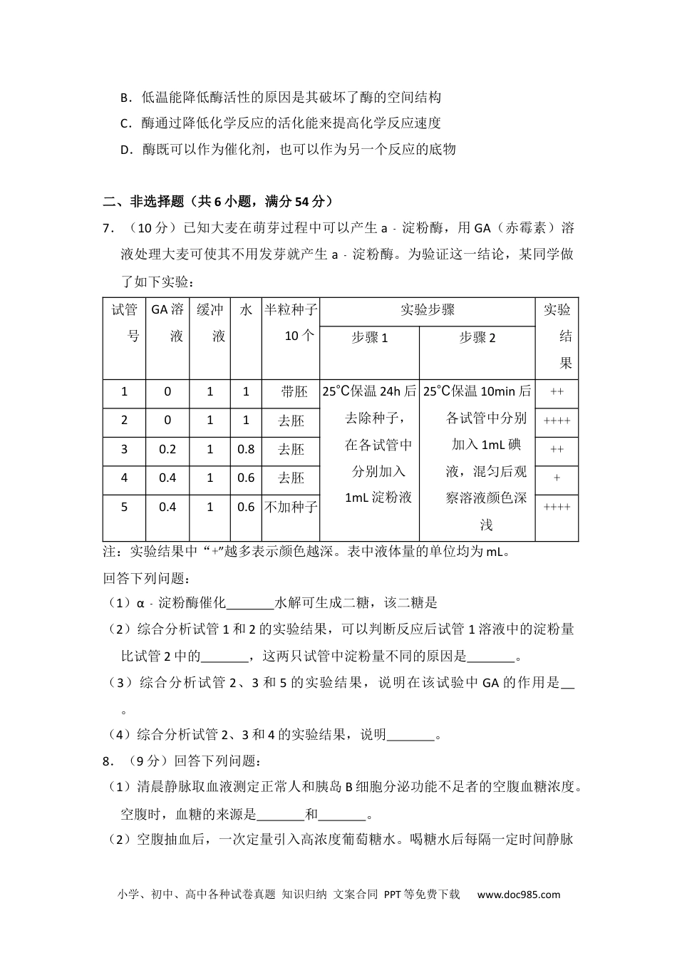 小学、初中、高中各种试卷真题知识归纳文案合同PPT等免费下载www.doc985.com2013年全国统一高考生物试卷(新课标Ⅱ)一、选择题(共6小题,每小题6分,满分36分)1.(6分)关于DNA和RNA的叙述,正确的是()A.DNA有氢键,RNA没有氢键B.一种病毒同时含有DNA和RNAC.大肠杆菌和酵母菌中既有DNA也有RNAD.叶绿体、线粒体和核糖体都含有DNA2.(6分)关于叶绿素的叙述,错误的是()A.叶绿素a和叶绿素b都含有镁元素B.叶绿素吸收的光可能用于光合作用C.叶绿素a和叶绿素b在红光区的吸收峰值不同D.植物呈现绿色是由于叶绿素能有效地吸收绿光3.(6分)下列与微生物呼吸有关的叙述,错误的是()A.肺炎双球菌无线粒体,但能进行有氧呼吸B.与细菌呼吸有关的酶由拟核中的基因编码C.破伤风芽孢杆菌适宜生活在有氧的环境中D.有氧和无氧时,酵母菌呼吸作用产物不同4.(6分)关于免疫细胞的叙述,错误的是()A.淋巴细胞包括B细胞、T细胞和吞噬细胞B.血液和淋巴液中都含有T细胞和B细胞C.吞噬细胞和B细胞都属于免疫细胞D.浆细胞通过胞吐作用分泌抗体5.(6分)在生命科学发展过程中,证明DNA是遗传物质的实验是()①孟德尔的豌豆杂交实验②摩尔根的果蝇杂交实验③肺炎双球菌转化实验④T2噬菌体侵染大肠杆菌实验⑤DNA的X光衍射实验。A.①②B.②③C.③④D.④⑤6.(6分)关于酶的叙述,错误的是()A.同一种酶可存在于分化程度不同的活细胞中小学、初中、高中各种试卷真题知识归纳文案合同PPT等免费下载www.doc985.comB.低温能降低酶活性的原因是其破坏了酶的空间结构C.酶通过降低化学反应的活化能来提高化学反应速度D.酶既可以作为催化剂,也可以作为另一个反应的底物二、非选择题(共6小题,满分54分)7.(10分)已知大麦在萌芽过程中可以产生a﹣淀粉酶,用GA(赤霉素)溶液处理大麦可使其不用发芽就产生a﹣淀粉酶。为验证这一结论,某同学做了如下实验:试管号GA溶液缓冲液水半粒种子10个实验步骤实验结果步骤1步骤21011带胚25℃保温24h后去除种子,在各试管中分别加入1mL淀粉液25℃保温10min后各试管中分别加入1mL碘液,混匀后观察溶液颜色深浅++2011去胚++++30.210.8去胚++40.410.6去胚+50.410.6不加种子++++注:实验结果中“+”越多表示颜色越深。表中液体量的单位均为mL。回答下列问题:(1)α﹣淀粉酶催化水解可生成二糖,该二糖是(2)综合分析试管1和2的实验结果,可以判断反应后试管1溶液中的淀粉量比试管2中的,这两只试管中淀粉量不同的原因是。(3)综合分析试管2、3和5的实验结果,说明在该试验中GA的作用是。(4)综合分析试管2、3和4的实验结果,说明。8.(9分)回答下列问题:(1)清晨静脉取血液测定正常人和胰岛B细胞分泌功能不足者的空腹血糖浓度。空腹时,血糖的来源是和。(2)空腹抽血后,一次定量引入高浓度葡萄糖水。喝糖水后每隔一定时间静脉小学、初中、高中各种试卷真题知识归纳文案合同PPT等免费下载www.doc985.com取血,测定血糖浓度(整个过程禁食、禁水,不做剧烈运动),发现正常人与胰岛B细胞分泌功能不足者血糖浓度的变化趋势都是先上升,再下降,但下降的速率不同。下降速率不同原因是。(3)胰岛B细胞分泌的激素是在该细胞的和这两种细胞器中进行加工的。9.(10分)回答与草原生态系统相关的问题;(1)草原上鼠的天敌从鼠获得的能量最终来自于固定的能量。(2)草原上,某种鼠的种群密度除了受迁入率和迁出率的影响外,还受该鼠种群的、、年龄组成和性别比例等因素的影响。(3)用样方法调查某种子双子叶植物种群密度时,为避免调查者主观因素的影响,要做到。(4)草原生物群落的空间结构包括和。10.(10分)已知果蝇长翅和小翅、红眼和棕眼各为一对相对性状,分别受一对等位基因控制,且两对等位基因位于不同的染色体上。为了确定这两对相对性状的显隐性关系,以及控制它们的等位基因是位于常染色体上,还是位于X染色体上(表现为伴性遗传),某同学让一只雌性长翅红眼果蝇与一只雄性长翅棕眼果蝇杂交,发现子一代中表现型及其分离比为长翅红眼:长翅棕眼:小翅红眼:小翅棕眼=3:3:1:1。回答下列问题:(1)在确定性状显...