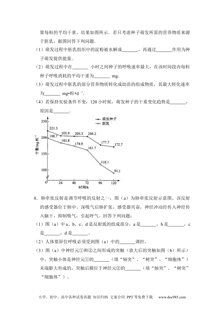 小学、初中、高中各种试卷真题知识归纳文案合同PPT等免费下载www.doc985.com2012年全国统一高考生物试卷(新课标)一、选择题:每小题6分,共36分1.(6分)同一物种的两类细胞各产生一种分泌蛋白,组成这两种蛋白质的各种氨基酸含量相同,但排列顺序不同。其原因是参与这两种蛋白质合成的()A.tRNA种类不同B.mRNA碱基序列不同C.核糖体成分不同D.同一密码子所决定的氨基酸不同2.(6分)下列关于细胞癌变的叙述,错误的是()A.癌细胞在适宜条件时可无限增殖B.癌变前后,细胞的形态和结构有明显差别C.病毒癌基因可整合到宿主基因组诱发癌变D.原癌基因的主要功能是阻止细胞发生异常增殖3.(6分)哺乳动物因长时间未饮水导致机体脱水时,会发生的生理现象是()A.血浆渗透压降低B.抗利尿激素分泌增加C.下丘脑渗透压感受器受到的刺激减弱D.肾小管和集合管对水的重吸收作用减弱4.(6分)当人看见酸梅时唾液分泌会大量增加.对此现象的分析,错误的是()A.这一反射过程需要大脑皮层的参与B.这是一种反射活动,其效应器是唾液腺C.酸梅色泽直接刺激神经中枢引起唾液分泌D.这一过程中有“电﹣化学﹣电”信号的转化5.(6分)取生长状态一致的燕麦胚芽鞘,分为a、b、c、d四组,将a、b两组胚芽鞘尖端下方的一段切除,再从c、d两组胚芽鞘中的相应位置分别切取等长的一段,并按图中所示分别接入a、b两组胚芽鞘被切除的位置,得到小学、初中、高中各种试卷真题知识归纳文案合同PPT等免费下载www.doc985.coma′、b′两组胚芽鞘.然后用单侧光照射,发现a′组胚芽鞘向光弯曲生长,b′组胚芽鞘无弯曲生长,其原因是()A.c组尖端能合成生长素,d组尖端不能B.a′组尖端能合成生长素,b′组尖端不能C.c组尖端的生长素能向胚芽鞘基部运输,d组尖端的生长素不能D.a′组尖端的生长素能向胚芽鞘基部运输,b′组尖端的生长素不能6.(6分)某岛屿上生活着一种动物,其种群数量多年维持相对稳定.该动物个体从出生到性成熟需要6个月.图为某年该动物种群在不同月份的年龄结构(每月最后一天统计种群各年龄组的个体数).关于该种群的叙述,错误的是()A.该种群10月份的出生率不可能为零B.天敌的迁入可影响该种群的年龄结构C.该种群的年龄结构随着季节更替而变化D.大量诱杀雄性个体会影响该种群的密度二、非选择题7.(11分)将玉米种植置于25℃、黑暗、水分适宜的条件下萌发,每天定时取相同数量的萌发种子,一半直接烘干称重,另一半切取胚乳烘干称重,计小学、初中、高中各种试卷真题知识归纳文案合同PPT等免费下载www.doc985.com算每粒的平均干重,结果如图所示.若只考虑种子萌发所需的营养物质来源于胚乳,据图回答下列问题.(1)萌发过程中胚乳组织中的淀粉被水解成,再通过作用为种子萌发提供能量.(2)萌发过程中在小时之间种子的呼吸速率最大,在该时间段内每粒种子呼吸消耗的平均干重为mg.(3)萌发过程中胚乳的部分营养物质转化成幼苗的组成物质,其最大转化速率为mg•粒•d1﹣.(4)若保持实验条件不变,120小时候,萌发种子的干重变化趋势是,原因是.8.肺牵张反射是调节呼吸的反射之一,图(a)为肺牵张反射示意图。该反射的感受器位于肺中。深吸气后肺扩张,感受器兴奋,神经冲动经传入神经传入脑干,抑制吸气,引起呼气。回答下列问题:(1)图(a)中a、b、c、d是反射弧的组成部分,a是,b是,c是,d是。(2)人体要屏住呼吸必须受到图(a)中的调控。(3)图(a)中神经元①和②之间形成的突触(放大后的突触如图(b)所示)中,突触小体是神经元①的(填“轴突”、“树突”、“细胞体”)末端膨大形成的,突触后膜位于神经元②的(填“轴突”、“树突”“细胞体”)。小学、初中、高中各种试卷真题知识归纳文案合同PPT等免费下载www.doc985.com9.(10分)一对毛色正常的鼠交配,产下多只鼠,其中一只雄鼠的毛色异常,分析认为,鼠毛色出现异常的原因有两种:一是基因突变的直接结果(控制毛色基因的显隐性未知,突变只涉及一个亲本常染色体上一对等位基因中的一个基因);二是隐性基因携带者之间交配的结果(只涉及亲本常染色体上一对等位基因).假...