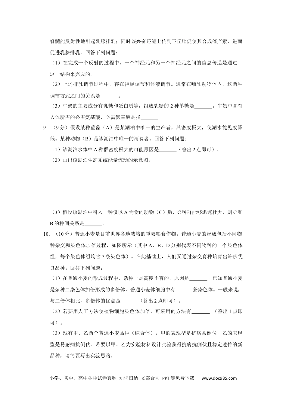 小学、初中、高中各种试卷真题知识归纳文案合同PPT等免费下载www.doc985.com2020年全国统一高考生物试卷(新课标Ⅲ)一、选择题:本题共6小题,每小题6分,共36分。在每小题给出的四个选项中,只有一项是符合题目要求的。1.(6分)关于真核生物的遗传信息及其传递的叙述,错误的是()A.遗传信息可以从DNA流向RNA,也可以从RNA流向蛋白质B.细胞中以DNA的一条单链为模板转录出的RNA均可编码多肽C.细胞中DNA分子的碱基总数与所有基因的碱基数之和不相等D.染色体DNA分子中的一条单链可以转录出不同的RNA分子2.(6分)取燕麦胚芽鞘切段,随机分成三组,第1组置于一定浓度的蔗糖(Suc)溶液中(蔗糖能进入胚芽鞘细胞),第2组置于适宜浓度的生长素(IAA)溶液中,第3组置于IAA+Suc溶液中,一定时间内测定胚芽鞘长度的变化,结果如图所示。用KCl代替蔗糖进行上述实验可以得到相同的结果。下列说法不合理的是()A.KCl可进入胚芽鞘细胞中调节细胞的渗透压B.胚芽鞘伸长生长过程中,伴随细胞对水分的吸收C.本实验中Suc是作为能源物质来提高IAA作用效果的D.IAA促进胚芽鞘伸长的效果可因加入Suc或KCl而提高3.(6分)细胞内有些tRNA分子的反密码子中含有稀有碱基次黄嘌呤(I)。含有I的反密码子在与mRNA中的密码子互补配对时,存在如图所示的配对方式(Gly表示甘氨酸)。下列说法错误的是()小学、初中、高中各种试卷真题知识归纳文案合同PPT等免费下载www.doc985.comA.一种反密码子可以识别不同的密码子B.密码子与反密码子的碱基之间通过氢键结合C.tRNA分子由两条链组成,mRNA分子由单链组成D.mRNA中的碱基改变不一定造成所编码氨基酸的改变4.(6分)下列有关人体免疫调节的叙述,合理的是()A.若病原体不具有细胞结构,就不会使人体产生抗体B.病原体裂解后再注射到人体,就不会使人体产生抗体C.病原体表面若不存在蛋白质分子,就不会使人体产生抗体D.病原体经吞噬细胞处理后暴露出的抗原可使人体产生抗体5.(6分)新冠病毒是一种RNA病毒。新冠肺炎疫情给人们的生活带来了巨大影响。下列与新冠肺炎疫情防控相关的叙述,错误的是()A.新冠病毒含有核酸和蛋白质,通过核酸检测可排查新冠病毒感染者B.教室经常开窗通风可以促进空气流动,降低室内病原微生物的密度C.通常新冠肺炎患者的症状之一是发烧,因此可以通过体温测量初步排查D.每天适量饮酒可以预防新冠肺炎,因为酒精可以使细胞内的病毒蛋白变性6.(6分)生态系统的物质循环包括碳循环和氮循环等过程。下列有关碳循环的叙述,错误的是()A.消费者没有参与碳循环的过程B.生产者的光合作用是碳循环的重要环节C.土壤中微生物的呼吸作用是碳循环的重要环节D.碳在无机环境与生物群落之间主要以CO2形式循环二、非选择题:共54分。第7~10题为必考题,每个试题考生都必须作答。第11、12题为选考题,考生根据要求作答。(一)必考题:共39分。7.(10分)参照表中内容,围绕真核细胞中ATP的合成来完成下表。反应部位(1)叶绿体的类囊体膜线粒体反应物葡萄糖/丙酮酸等反应名称(2)光合作用的光反应有氧呼吸的部分过程合成ATP的能量来源化学能(3)化学能终产物(除ATP外)乙醇、CO2(4)(5)8.(10分)给奶牛挤奶时其乳头上的感受器会受到刺激,产生的兴奋沿着传入神经传到小学、初中、高中各种试卷真题知识归纳文案合同PPT等免费下载www.doc985.com脊髓能反射性地引起乳腺排乳;同时该兴奋还能上传到下丘脑促使其合成催产素,进而促进乳腺排乳。回答下列问题:(1)在完成一个反射的过程中,一个神经元和另一个神经元之间的信息传递是通过这一结构来完成的。(2)上述排乳调节过程中,存在神经调节和体液调节。通常在哺乳动物体内,这两种调节方式之间的关系是。(3)牛奶的主要成分有乳糖和蛋白质等,组成乳糖的2种单糖是。牛奶中含有人体所需的必需氨基酸,必需氨基酸是指。9.(9分)假设某种蓝藻(A)是某湖泊中唯一的生产者,其密度极大,使湖水能见度降低。某种动物(B)是该湖泊中唯一的消费者。回答下列问题:(1)该湖泊水体中A种群密度极大的可能原因是(答出2点即可)。(2)画出该湖泊生态系统...