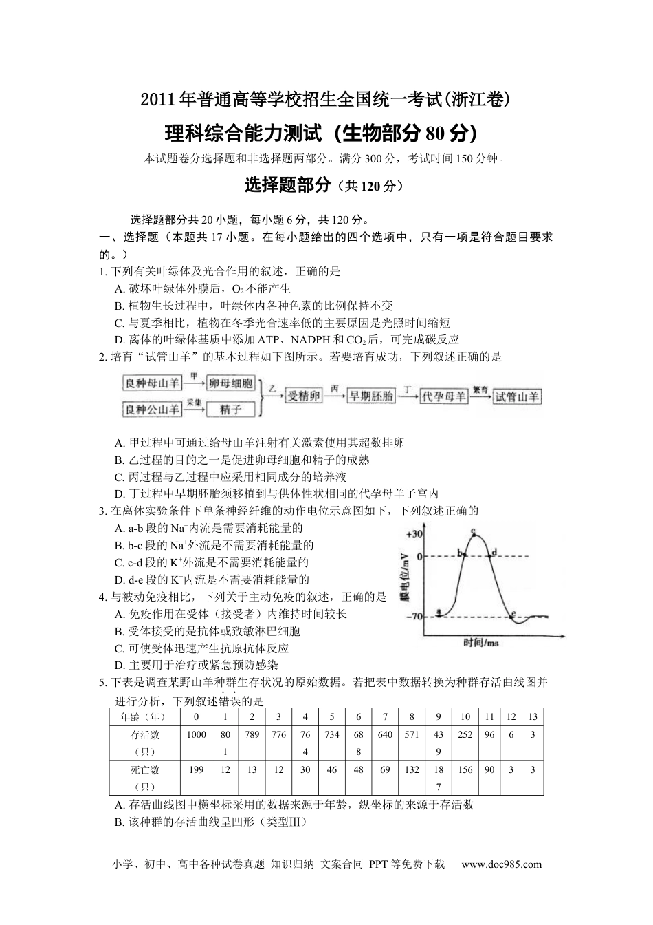 小学、初中、高中各种试卷真题知识归纳文案合同PPT等免费下载www.doc985.com2011年普通高等学校招生全国统一考试(浙江卷)理科综合能力测试(生物部分80分)本试题卷分选择题和非选择题两部分。满分300分,考试时间150分钟。选择题部分(共120分)选择题部分共20小题,每小题6分,共120分。一、选择题(本题共17小题。在每小题给出的四个选项中,只有一项是符合题目要求的。)1.下列有关叶绿体及光合作用的叙述,正确的是A.破坏叶绿体外膜后,O2不能产生B.植物生长过程中,叶绿体内各种色素的比例保持不变C.与夏季相比,植物在冬季光合速率低的主要原因是光照时间缩短D.离体的叶绿体基质中添加ATP、NADPH和CO2后,可完成碳反应2.培育“试管山羊”的基本过程如下图所示。若要培育成功,下列叙述正确的是A.甲过程中可通过给母山羊注射有关激素使用其超数排卵B.乙过程的目的之一是促进卵母细胞和精子的成熟C.丙过程与乙过程中应采用相同成分的培养液D.丁过程中早期胚胎须移植到与供体性状相同的代孕母羊子宫内3.在离体实验条件下单条神经纤维的动作电位示意图如下,下列叙述正确的A.a-b段的Na+内流是需要消耗能量的B.b-c段的Na+外流是不需要消耗能量的C.c-d段的K+外流是不需要消耗能量的D.d-e段的K+内流是不需要消耗能量的4.与被动免疫相比,下列关于主动免疫的叙述,正确的是A.免疫作用在受体(接受者)内维持时间较长B.受体接受的是抗体或致敏淋巴细胞C.可使受体迅速产生抗原抗体反应D.主要用于治疗或紧急预防感染5.下表是调查某野山羊种群生存状况的原始数据。若把表中数据转换为种群存活曲线图并进行分析,下列叙述错误的是年龄(年)012345678910111213存活数(只)10008017897767647346886405714392529663死亡数(只)199121312304648691321871569033A.存活曲线图中横坐标采用的数据来源于年龄,纵坐标的来源于存活数B.该种群的存活曲线呈凹形(类型Ⅲ)小学、初中、高中各种试卷真题知识归纳文案合同PPT等免费下载www.doc985.comC.该种群中大多数个体在平均生理年龄后死亡D.分析存活曲线可知该种群对环境有较强的适应能力6.将ada(腺苷酸脱氨酶基因)通过质粒pET28b导入大肠杆菌并成功表达腺苷酸脱氨酶。下列叙述错误的是A.每个大肠杆菌细胞至少含一个重组质粒B.每个重组质粒至少含一个限制性核酸内切酶识别位点C.每个限制性核酸内切酶识别位点至少插入一个adaD.每个插入的ada至少表达一个腺苷酸脱氨酶分子非选择题部分(共12题共180分)30.(14分)研究人员进行了多种植物激素对豌豆植株侧芽生长影响的实验,结果见下图。请回答:(1)比较曲线1、2、3与4,可知对侧芽的生长有抑制作用,其中起作用的主要激素是,而且(激素)能解除这种激素的抑制作用。在保留顶芽的情况下,除了曲线3所采用的措施外,还可通过喷施的化合物促进侧芽生长。(2)比较曲线4与5,可知赤霉素能明显促进,而在完整豌豆植株的顶芽中,赤霉素产生于组织。(3)分析上图,推测侧芽生长速度不同的原因是侧芽内浓度或比例的改变。31.(12分)为了探究某物质(X)的作用,研究者提出了以下实验思路:(1)实验分组:甲组:培养液+Y细胞+3H-TdR(3H标记的胸腺嘧啶脱氧核苷)+生理盐水乙组:培养液+Y细胞+3H-TdR+X(用生理盐水配制)每组设置若干个重复样品。(2)分别测定两组的CRD(细胞内的放射性强度),求每组的平均值。(3)将各样品在适宜条件下培养合适时间后,测定其CRD,求每组平均值并进行统计分析。(要求与说明:答题时用X、CRD、3H-TdR表示相关名词;Y细胞是能增殖的高等动物体细胞)请回答:(1)实验目的:。(2)预测实验结果及结论:小学、初中、高中各种试卷真题知识归纳文案合同PPT等免费下载www.doc985.com。(3)实验中采用3H-TdR的原因是:。32.(18分)以下为某家族甲病(设基因为B、b)和乙病(设基因为D、d)的遗传家系图,其中II1,不携带乙病的致病基因。请回答:(1)甲病的遗传方式为,乙病的遗传方式为。I1的基因型是。(2)在仅考虑乙病的情况下,III2与一男性为双亲,生育了一个患乙病的女孩。若这对夫妇再生育,请推测子女的可能情况,用遗传图解表示。(3)B基因可编码瘦...