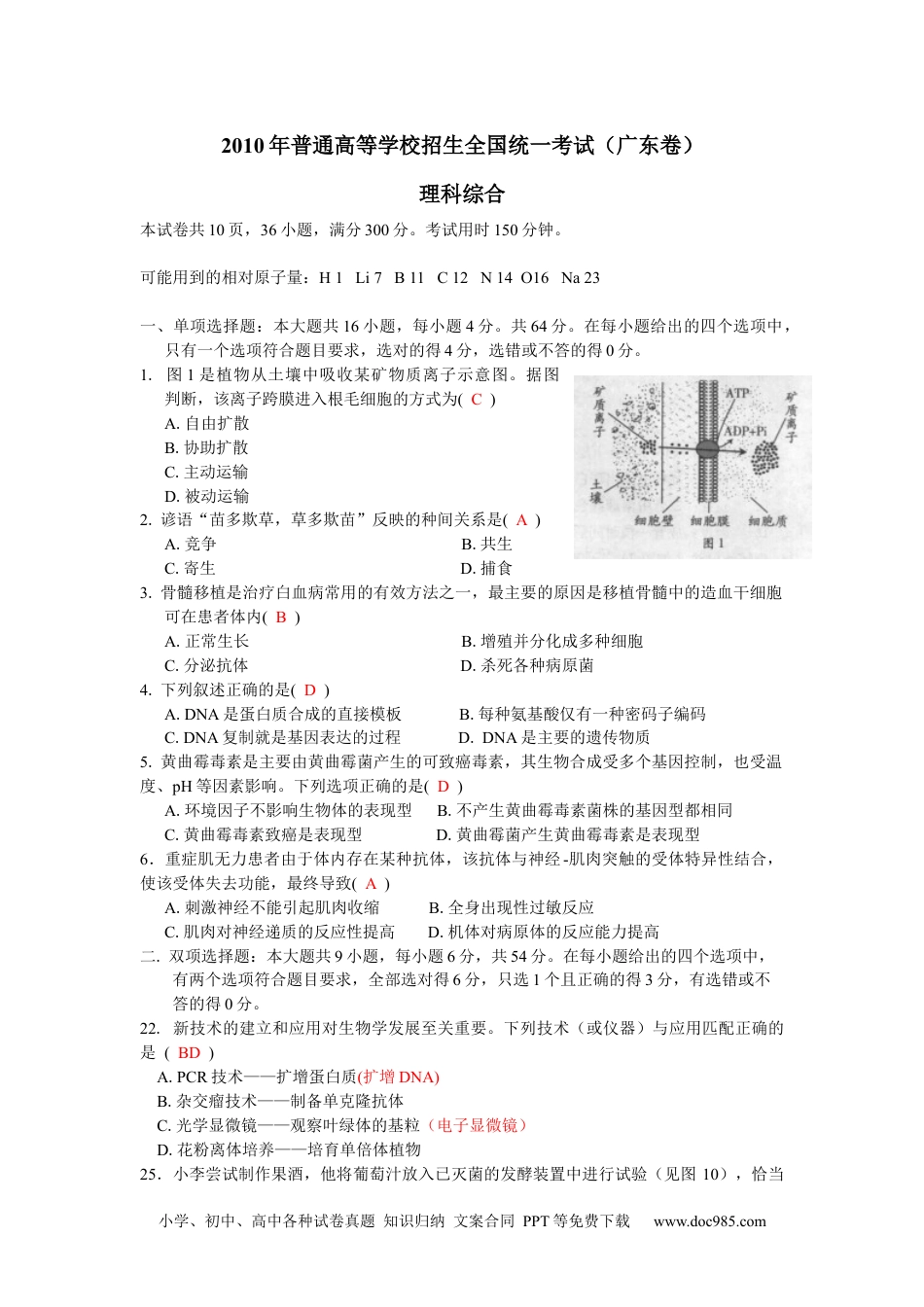 小学、初中、高中各种试卷真题知识归纳文案合同PPT等免费下载www.doc985.com2010年普通高等学校招生全国统一考试(广东卷)理科综合本试卷共10页,36小题,满分300分。考试用时150分钟。可能用到的相对原子量:H1Li7B11C12N14O16Na23一、单项选择题:本大题共16小题,每小题4分。共64分。在每小题给出的四个选项中,只有一个选项符合题目要求,选对的得4分,选错或不答的得0分。1.图1是植物从土壤中吸收某矿物质离子示意图。据图判断,该离子跨膜进入根毛细胞的方式为(C)A.自由扩散B.协助扩散C.主动运输D.被动运输2.谚语“苗多欺草,草多欺苗”反映的种间关系是(A)A.竞争B.共生C.寄生D.捕食3.骨髓移植是治疗白血病常用的有效方法之一,最主要的原因是移植骨髓中的造血干细胞可在患者体内(B)A.正常生长B.增殖并分化成多种细胞C.分泌抗体D.杀死各种病原菌4.下列叙述正确的是(D)A.DNA是蛋白质合成的直接模板B.每种氨基酸仅有一种密码子编码C.DNA复制就是基因表达的过程D.DNA是主要的遗传物质5.黄曲霉毒素是主要由黄曲霉菌产生的可致癌毒素,其生物合成受多个基因控制,也受温度、pH等因素影响。下列选项正确的是(D)A.环境因子不影响生物体的表现型B.不产生黄曲霉毒素菌株的基因型都相同C.黄曲霉毒素致癌是表现型D.黄曲霉菌产生黄曲霉毒素是表现型6.重症肌无力患者由于体内存在某种抗体,该抗体与神经-肌肉突触的受体特异性结合,使该受体失去功能,最终导致(A)A.刺激神经不能引起肌肉收缩B.全身出现性过敏反应C.肌肉对神经递质的反应性提高D.机体对病原体的反应能力提高二.双项选择题:本大题共9小题,每小题6分,共54分。在每小题给出的四个选项中,有两个选项符合题目要求,全部选对得6分,只选1个且正确的得3分,有选错或不答的得0分。22.新技术的建立和应用对生物学发展至关重要。下列技术(或仪器)与应用匹配正确的是(BD)A.PCR技术——扩增蛋白质(扩增DNA)B.杂交瘤技术——制备单克隆抗体C.光学显微镜——观察叶绿体的基粒(电子显微镜)D.花粉离体培养——培育单倍体植物25.小李尝试制作果酒,他将葡萄汁放入已灭菌的发酵装置中进行试验(见图10),恰当小学、初中、高中各种试卷真题知识归纳文案合同PPT等免费下载www.doc985.com的做法是(AC)A.加入适量的酵母菌B.一直打开阀b通气C.一直关紧阀a,偶尔打开阀b几秒钟D.把发酵装置放到4℃冰箱中进行试验三、非选择题:本大题共11小题,共182分。按题目要求作答。解答题应写出必要的文字说明、方程式和重要演算步骤,只写出最后答案的不能得分。有数值计算的题,答案中必须明确写出数值和单位。26.(16分)气候变化与生态系统的碳循环密切相关。下表为A、B两个不同时期陆地生态系统与大气环境的碳交换情况。(1)生态系统碳的吸收主要是通过光合作用实现的,碳的释放主要是通过呼吸作用实现的。(2)表中_B__时期的生态系统处于稳定状态,原因是碳释放量和碳吸收量达到了动态平衡_(3)由于过度的人工碳排放,破坏了生态系统的碳循环,导致大气中二氧化碳增加并引起全球气候变化。(4)人们正在积极开发新能源以减少碳排放。如“叶绿素太阳能电池”是模仿类囊体吸收光能的特征而制造的,类囊体吸收光能的过程发生在光合作用的光反应阶段又如经改造的蓝藻能在细胞内将光合作用产生的葡萄糖直接发酵转化为燃料乙醇。27.(16分)血糖平衡对机体生命活动具有重要作用。图11是血糖调控模式图,据图回答:(1)当机体处于低血糖状态时,如果机体通过途径①→②→③使血糖水平恢复正常,其主要机理是胰高血糖素分泌增多,促进了肝糖原_分解成葡萄糖,使血糖水平升高。(2)如果机体长期处于高血糖状态,可能的原因是胰岛_B_细胞受损,导致体内_胰岛素_分泌减少。(3)胰腺中调控血糖水平的主要激素的化学本质是蛋白质或多肽,它们的合成和加工过程需要核糖体、内质网和高尔基体(或线粒体)等细胞器直接参与。激素合成时所需的能量,只要由细胞呼吸产生的ATP直接提供。28、(16分)克氏综合征是一种性染色体数目异常的疾病。现有一对表现型正常的夫妇生了一个患克氏综合征并伴有色盲的男孩,该男孩的染色体组成为44+XXY。请回答:(1)...