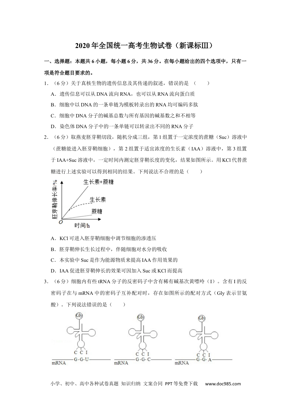 小学、初中、高中各种试卷真题知识归纳文案合同PPT等免费下载www.doc985.com2020年全国统一高考生物试卷(新课标Ⅲ)一、选择题:本题共6小题,每小题6分,共36分。在每小题给出的四个选项中,只有一项是符合题目要求的。1.(6分)关于真核生物的遗传信息及其传递的叙述,错误的是()A.遗传信息可以从DNA流向RNA,也可以从RNA流向蛋白质B.细胞中以DNA的一条单链为模板转录出的RNA均可编码多肽C.细胞中DNA分子的碱基总数与所有基因的碱基数之和不相等D.染色体DNA分子中的一条单链可以转录出不同的RNA分子2.(6分)取燕麦胚芽鞘切段,随机分成三组,第1组置于一定浓度的蔗糖(Suc)溶液中(蔗糖能进入胚芽鞘细胞),第2组置于适宜浓度的生长素(IAA)溶液中,第3组置于IAA+Suc溶液中,一定时间内测定胚芽鞘长度的变化,结果如图所示。用KCl代替蔗糖进行上述实验可以得到相同的结果。下列说法不合理的是()A.KCl可进入胚芽鞘细胞中调节细胞的渗透压B.胚芽鞘伸长生长过程中,伴随细胞对水分的吸收C.本实验中Suc是作为能源物质来提高IAA作用效果的D.IAA促进胚芽鞘伸长的效果可因加入Suc或KCl而提高3.(6分)细胞内有些tRNA分子的反密码子中含有稀有碱基次黄嘌呤(I)。含有I的反密码子在与mRNA中的密码子互补配对时,存在如图所示的配对方式(Gly表示甘氨酸)。下列说法错误的是()小学、初中、高中各种试卷真题知识归纳文案合同PPT等免费下载www.doc985.comA.一种反密码子可以识别不同的密码子B.密码子与反密码子的碱基之间通过氢键结合C.tRNA分子由两条链组成,mRNA分子由单链组成D.mRNA中的碱基改变不一定造成所编码氨基酸的改变4.(6分)下列有关人体免疫调节的叙述,合理的是()A.若病原体不具有细胞结构,就不会使人体产生抗体B.病原体裂解后再注射到人体,就不会使人体产生抗体C.病原体表面若不存在蛋白质分子,就不会使人体产生抗体D.病原体经吞噬细胞处理后暴露出的抗原可使人体产生抗体5.(6分)新冠病毒是一种RNA病毒。新冠肺炎疫情给人们的生活带来了巨大影响。下列与新冠肺炎疫情防控相关的叙述,错误的是()A.新冠病毒含有核酸和蛋白质,通过核酸检测可排查新冠病毒感染者B.教室经常开窗通风可以促进空气流动,降低室内病原微生物的密度C.通常新冠肺炎患者的症状之一是发烧,因此可以通过体温测量初步排查D.每天适量饮酒可以预防新冠肺炎,因为酒精可以使细胞内的病毒蛋白变性6.(6分)生态系统的物质循环包括碳循环和氮循环等过程。下列有关碳循环的叙述,错误的是()A.消费者没有参与碳循环的过程B.生产者的光合作用是碳循环的重要环节C.土壤中微生物的呼吸作用是碳循环的重要环节D.碳在无机环境与生物群落之间主要以CO2形式循环二、非选择题:共54分。第7~10题为必考题,每个试题考生都必须作答。第11、12题为选考题,考生根据要求作答。(一)必考题:共39分。7.(10分)参照表中内容,围绕真核细胞中ATP的合成来完成下表。反应部位(1)叶绿体的类囊体膜线粒体反应物葡萄糖/丙酮酸等反应名称(2)光合作用的光反应有氧呼吸的部分过程合成ATP的能量来源化学能(3)化学能终产物(除ATP外)乙醇、CO2(4)(5)8.(10分)给奶牛挤奶时其乳头上的感受器会受到刺激,产生的兴奋沿着传入神经传到小学、初中、高中各种试卷真题知识归纳文案合同PPT等免费下载www.doc985.com脊髓能反射性地引起乳腺排乳;同时该兴奋还能上传到下丘脑促使其合成催产素,进而促进乳腺排乳。回答下列问题:(1)在完成一个反射的过程中,一个神经元和另一个神经元之间的信息传递是通过这一结构来完成的。(2)上述排乳调节过程中,存在神经调节和体液调节。通常在哺乳动物体内,这两种调节方式之间的关系是。(3)牛奶的主要成分有乳糖和蛋白质等,组成乳糖的2种单糖是。牛奶中含有人体所需的必需氨基酸,必需氨基酸是指。9.(9分)假设某种蓝藻(A)是某湖泊中唯一的生产者,其密度极大,使湖水能见度降低。某种动物(B)是该湖泊中唯一的消费者。回答下列问题:(1)该湖泊水体中A种群密度极大的可能原因是(答出2点即可)。(2)画出该湖泊生态系统...