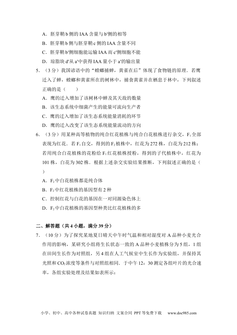 小学、初中、高中各种试卷真题知识归纳文案合同PPT等免费下载www.doc985.com2016年全国统一高考生物试卷(新课标Ⅲ)一、选择题(共6小题,每小题3分,满分18分)1.(3分)下列有关细胞膜的叙述,正确的是()A.细胞膜两侧的离子浓度差是通过自由扩散实现的B.细胞膜与线粒体膜、核膜中所含蛋白质的功能相同C.分泌蛋白分泌到细胞外的过程存在膜脂的流动现象D.膜中的磷脂分子是由胆固醇、脂肪酸和磷酸组成的2.(3分)在前人进行的下列研究中,采用的核心技术相同(或相似)的一组是()①证明光合作用所释放的氧气来自于水②用紫外线等处理青霉菌选育高产青霉素菌株③用T2噬菌体浸染大肠杆菌证明DNA是遗传物质④用甲基绿和吡罗红对细胞染色,观察核酸的分布。A.①②B.①③C.②④D.③④3.(3分)下列有关动物水盐平衡调节的叙述,错误的是()A.细胞外液渗透压的改变可影响垂体释放抗利尿激素的量B.肾小管通过主动运输吸收水的过程受抗利尿激素的调节C.摄盐过多后饮水量的增加有利于维持细胞外液渗透压相对恒定D.饮水增加导致尿生成增加有利于维持细胞外液渗透压相对恒定4.(3分)为了探究生长素的作用,将去尖端的玉米胚芽鞘切段随机分成两组,实验组胚芽鞘上端一侧放置含有适宜浓度IAA的琼脂块,对照组胚芽鞘上端同侧放置不含IAA的琼脂块,两组胚芽鞘在同样条件下,在黑暗中放置一段时间后,对照组胚芽鞘无弯曲生长,实验组胚芽鞘发生弯曲生长,如图所示.根据实验结果判断,下列叙述正确的是()小学、初中、高中各种试卷真题知识归纳文案合同PPT等免费下载www.doc985.comA.胚芽鞘b侧的IAA含量与b′侧的相等B.胚芽鞘b侧与胚芽鞘c侧的IAA含量不同C.胚芽鞘b′侧细胞能运输IAA而c′侧细胞不能D.琼脂块d′从a′中获得IAA量小于a′的输出量5.(3分)我国谚语中的“螳螂捕蝉,黄雀在后”体现了食物链的原理.若鹰迁入了蝉,螳螂和黄雀所在的树林中,捕食黄雀并在栖息于林中,下列叙述正确的是()A.鹰的迁入增加了该树林中蝉及其天敌的数量B.该生态系统中细菌产生的能量可流向生产者C.鹰的迁入增加了该生态系统能量消耗的环节D.鹰的迁入改变了该生态系统能量流动的方向6.(3分)用某种高等植物的纯合红花植株与纯合白花植株进行杂交,F1全部表现为红花.若F1自交,得到的F2植株中,红花为272株,白花为212株;若用纯合白花植株的花粉给F1红花植株授粉,得到的子代植株中,红花为101株,白花为302株.根据上述杂交实验结果推断,下列叙述正确的是()A.F2中白花植株都是纯合体B.F2中红花植株的基因型有2种C.控制红花与白花的基因在一对同源染色体上D.F2中白花植株的基因型种类比红花植株的多二、解答题(共4小题,满分39分)7.(10分)为了探究某地夏日晴天中午时气温和相对湿度对A品种小麦光合作用的影响,某研究小组将生长状态一致的A品种小麦植株分为5组,1组在田间生长作为对照组,另4组在人工气候室中生长作为实验组,并保持其光照和CO2浓度等条件与对照组相同.于中午12:30测定各组叶片的光合速率,各组实验处理及结果如表所示:小学、初中、高中各种试卷真题知识归纳文案合同PPT等免费下载www.doc985.com对照组实验组一实验组二实验组三实验组四实验处理温度/℃3636363125相对湿度/%1727525252实验结果光合速/mgCO2•dm2﹣•h1﹣11.115.122.123.720.7回答下列问题:(1)根据实验结果,可以推测中午时对小麦光合速率影响较大的环境因素是,其依据是.并可推测,(填“增加”或“降低”)麦田环境的相对湿度可降低小麦光合作用“午休”的程度.(2)在实验组中,若适当提高第组的环境温度能提高小麦的光合速率,其原因是.(3)小麦叶片气孔开放时,CO2进入叶肉细胞的过程(填“需要”或“不需要”)载体蛋白,(填“需要”或“不需要”)消耗ATP.8.(9分)回答下列问题:(1)正常人在饥饿且无外源能源物质摄入的情况下,与其在进食后的情况相比,血液中胰高血糖素与胰岛素含量的比值,其原因是。(2)在饥饿条件下,一段时间内人体血浆中葡萄糖和酮体浓度变化的趋势如图所示。酮体是脂肪酸分解代谢的中间产物,其酸性较强。人在某些情况下不能...