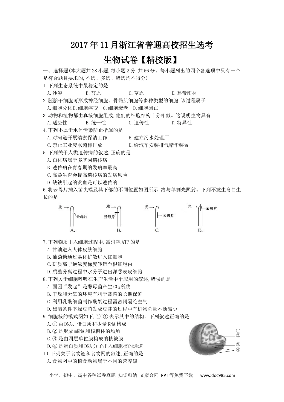 小学、初中、高中各种试卷真题知识归纳文案合同PPT等免费下载www.doc985.com2017年11月浙江省普通高校招生选考生物试卷【精校版】一、选择题(本大题共28小题,每小题2分,共56分。每小题列出的四个备选项中只有一个是符合题目要求的,不选、多选、错选均不得分)1.下列生态系统中最稳定的是A.沙漠B.苔原C.草原D.热带雨林2.胚胎干细胞可形成神经细胞、骨骼肌细胞等多种类型的细胞,该过程属于A.细胞分化B.细胞癌变C.细胞衰老D.细胞凋亡3.动物和植物都由真核细胞组成,他们的细胞结构十分相似。这说明生物具有A.适应性B.统一性C.遗传性D.特异性4.下列不属于水体污染防止措施的是A.对河道开展清淤保洁工作B.建立污水处理厂C.禁止工业废水超标排放D.给汽车安装排气精华装置5.下列关于人类遗传病的叙述,正确的是A.白化病属于多基因遗传病B.遗传病在青春期的发病率最高C.高龄生育会提高遗传病的发病风险D.缺铁引起的贫血是可以遗传的6.将云母片插入苗尖端及其下部的不同位置如图所示,给与单侧光照射。下列不发生弯曲生长的是7.下列物质出入细胞过程中,需消耗ATP的是A.甘油进入人体皮肤细胞B.葡萄糖通过易化扩散进入红细胞C.矿质离子逆浓度梯度转运至根细胞内D.质壁分离过程中水分子进出洋葱表皮细胞8.下列关于细胞呼吸在生产生活中个应用的叙述,错误的是A.面团“发起”是酵母菌产生CO2所致B.干燥和无氧的环境有利于蔬菜的长期保鲜C.利用乳酸细菌制作酸奶过程需密闭隔绝空气D.黑暗条件下绿豆萌发成豆芽的过程中有机物总量不断减少9.细胞核的模式图如下,①~④表示其中的结构。下列叙述正确的是A.①由DNA、蛋白质和少量RNA构成B.②是形成mRNA和核糖体的场所C.③是由四层单位膜构成的核被膜D.④是蛋白质和DNA分子出入细胞核的通道10.下列关于食物链和食物网的叙述,正确的是A.食物网中的植食动物属于不同的营养级④③②①小学、初中、高中各种试卷真题知识归纳文案合同PPT等免费下载www.doc985.comB.陆地生态系统中通常以捕食食物链为主C.捕食食物链由生产者、消费者和分解者组成D.难降解的有害物质会沿着食物链转移和富集11.人类的镰刀形细胞贫血症是由于血红蛋白基因中一个碱基对A-T替换成了T-A,引起血红蛋白结构改变所致。该实例不能说明的是A.该变异属于致死突变B.基因突变是可逆的C.碱基对替换会导致遗传信息改变D.基因控制生物性状12.下列关于脂质的叙述,错误的是A.胆固醇参与动物细胞膜的构成B.植物物蜡可以减少植物细胞水分的散失C.油脂中氧原子的相对含量高于葡萄糖D.“检测生物组织中的油脂”实验中可用乙醇洗去多余的染料13.下列关于能量流动的叙述,正确的是A.动物同化的能量中包括其粪便中的能量B.生产者能将约10%的太阳能转化为化学能C.相同条件下恒温动物的体重净增长低于变温动物D.消费者营养级具有的能量与该消费者的平均体重成正相关14.下列关于观察小鼠骨髓细胞有丝分裂的叙述,正确的是A.前期,分开的中心体之间有纺锤丝相连B.中期,伸展延长的染色质排列在赤道面上C.后期,可观察到核被膜逐渐解体形成小泡D.末期,可观察到由许多囊泡聚集形成的细胞板15.下列关于质膜的叙述,错误的是A.脂双层两层中的磷脂分子含量不同B.细胞之间的识别主要取决于磷脂分子C.膜中磷脂和蛋白质分子是不断运动的D.蓝细菌进行需氧呼吸的主要场所位于质膜16.下列关于人体细胞与周围环境之间进行物质交换的叙述,正确的是A.消化道中的营养素经内环境进入细胞B.尿素在排泄系统中被重新吸收进入血液C.肝细胞通过细胞膜直接与血液进行物质交换D.经呼吸系统进入血液的氧气与血浆蛋白结合并运输17.噬菌体侵染细菌的实验证明了DNA是遗传物质。下列关于该实验的叙述,正确的是A.噬菌体内可以合成mRNAB.搅拌的目的是使噬菌体与细菌充分混合C.噬菌体与细菌混合培养的时间越长,实验效果越好D.噬菌体侵染细菌后,产生许多遗传信息相同的子代噬菌体18.运动神经元的结构示意图如下,下列叙述正确的是第18题图小学、初中、高中各种试卷真题知识归纳文案合同PPT等免费下载www.doc985.comA.图中①、②属于神经末梢B.该神经元有多个轴突和多个树突C.该神经元位于膝反射的反射中枢D.刺激该神经元轴突产生的负电波沿神经纤维传播19....