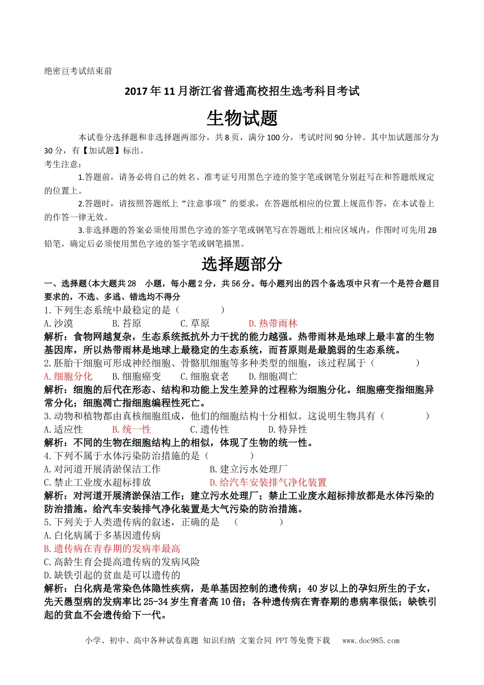 小学、初中、高中各种试卷真题知识归纳文案合同PPT等免费下载www.doc985.com绝密考试结束前2017年11月浙江省普通高校招生选考科目考试生物试题本试卷分选择题和非选择题两部分,共8页,满分100分,考试时间90分钟。其中加试题部分为30分,有【加试题】标出。考生注意:1.答题前,请务必将自己的姓名、准考证号用黑色字迹的签字笔或钢笔分别赶写在和答题纸规定的位置上。2.答题时,请按照答题纸上“注意事项”的要求,在答题纸相应的位置上规范作答,在本试卷上的作答一律无效。3.非选择题的答案必须使用黑色字迹的签字笔或钢笔写在答题纸上相应区域内,作图时可先用2B铅笔,确定后必须使用黑色字迹的签字笔或钢笔描黑。选择题部分一、选择题(本大题共28小題,每小题2分,共56分。每小题列出的四个备选项中只有一个是符合题目要求的,不选、多逃、错选均不得分1.下列生态系统中最稳定的是()A.沙漠B.苔原C.草原D.热带雨林解析:食物网越复杂,生态系统抵抗外力干扰的能力越强。热带雨林是地球上最丰富的生物基因库,所以热带雨林是地球上最稳定的生态系统,而苔原则是最脆弱的生态系统。2.胚胎干细胞可形成神经细胞、骨骼肌细胞等多种类型的细胞,该过程属于()A.细胞分化B.细胞癌变C.细胞衰老D.细胞凋亡解析:细胞的后代在形态、结构和功能上发生差异的过程称为细胞分化。细胞癌变指细胞异常分化;细胞凋亡指细胞编程性死亡。3.动物和植物都由真核细胞组成,他们的细胞结构十分相似。这说明生物具有()A.适应性B.统一性C.遗传性D.特异性解析:不同的生物在细胞结构上的相似,体现了生物的统一性。4.下列不属于水体污染防治措施的是()A.对河道开展清淤保洁工作B.建立污水处理厂C.禁止工业废水超标排放D.给汽车安装排气净化装置解析:对河道开展清淤保洁工作;建立污水处理厂;禁止工业废水超标排放都是水体污染的防治措施。给汽车安装排气净化装置是大气污染的防治措施。5.下列关于人类遗传病的叙述,正确的是()A.白化病属于多基因遗传病B.遗传病在青春期的发病率最高C.高龄生育会提高遗传病的发病风险D.缺铁引起的贫血是可以遗传的解析:白化病是常染色体隐性疾病,是单基因控制的遗传病;40岁以上的孕妇所生的子女,先天愚型病的发病率比25-34岁生育者高10倍;各种遗传病在青春期的患病率很低;缺铁引起的贫血不会遗传给下一代。小学、初中、高中各种试卷真题知识归纳文案合同PPT等免费下载www.doc985.com6.将云母片插入苗尖端及其下部的不同位置如图所示,给与单侧光照射,下列不发的是发生弯曲生长的是()解析:各个处理的苗尖端分别会向左、向右、向右和直立生长。答案:D7.下列物质出入细胞过程中,需消耗ATP的是()A.甘油进入人体皮肤细胞B.葡萄糖通过易化扩散进入红细胞C.矿物质离子逆浓度梯度转运至根细胞内D.质壁分离过程中水分子进出洋葱表皮细胞解析:甘油进入人体皮肤的方式为简单扩散,不需要消耗能量;易化扩散需要载体,不需要消耗能量;质壁分离过程中,水分子通过渗透进出细胞,不需要消耗能量。8.下列关于细胞呼吸在生产生活中应用的叙述,错误的是()A.面团“发起”是酵母菌产生CO2所致B.干燥和无氧的环境有利于蔬菜的长期保鲜C.利用乳酸细菌制作酸奶过程需密闭隔绝空气D.黑暗条件下绿豆萌发成豆芽的过程中有机物总量不断减少解析:酵母菌进行乙醇发酵,产生乙醇和CO2,使面团发起;蔬菜保鲜需要高湿和低氧的环境;乳酸菌进行乳酸发酵产生乳酸,这个过程为厌氧呼吸过程,不能通氧气;黑暗条件下,绿豆芽只进行细胞呼吸,不能进行光合作用,有机物不断消耗减少。9.细胞核的模式图如下,①~④表示其中的结构。下列叙述正确的是()A.①由DNA、蛋白质和少量RNA构成B.②是形成mRNA和核糖体的场所C.③是由四层单位膜构成的核被膜D.④是蛋白质和DNA分子出入细胞核的通道解析:①为染色质,有DNA、蛋白质和少量RNA组成;②为核仁,与核糖体的合成有关,核糖体的成分为rRNA和蛋白质;③为核膜,由两层单位膜构成;④为核孔,是蛋白质、RNA等大分子物质进出细胞核的通道,但DNA不能通过核孔。10.下列关于食物链和食物网的叙述,正确的是()A.食物网中的植食动物...