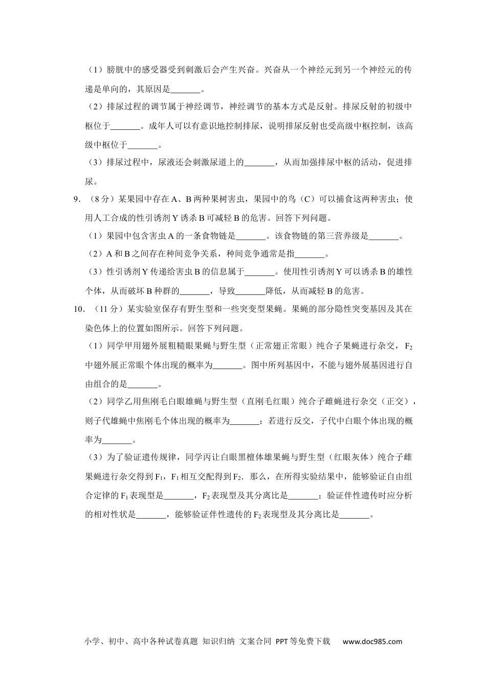 小学、初中、高中各种试卷真题知识归纳文案合同PPT等免费下载www.doc985.com2019年全国统一高考生物试卷(新课标Ⅰ)一、选择题:本题共6小题,每小题6分,共36分。在每小题给出的四个选项中,只有一项是符合题目要求的。1.(6分)细胞凋亡是细胞死亡的一种类型。下列关于人体中细胞凋亡的叙述,正确的是()A.胎儿手的发育过程中不会发生细胞凋亡B.小肠上皮细胞的自然更新过程中存在细胞凋亡现象C.清除被病原体感染细胞的过程中不存在细胞凋亡现象D.细胞凋亡是基因决定的细胞死亡过程,属于细胞坏死2.(6分)用体外实验的方法可合成多肽链。已知苯丙氨酸的密码子是UUU,若要在体外合成同位素标记的多肽链,所需的材料组合是()①同位素标记的tRNA②蛋白质合成所需的酶③同位素标记的苯丙氨酸④人工合成的多聚尿嘧啶核苷酸⑤除去了DNA和mRNA的细胞裂解液A.①②④B.②③④C.③④⑤D.①③⑤3.(6分)将一株质量为20g的黄瓜幼苗栽种在光照等适宜的环境中,一段时间后植株达到40g,其增加的质量来自于()A.水、矿质元素和空气B.光、矿质元素和水C.水、矿质元素和土壤D.光、矿质元素和空气4.(6分)动物受到惊吓刺激时,兴奋经过反射弧中的传出神经作用于肾上腺髓质,使其分泌肾上腺素;兴奋还通过传出神经作用于心脏。下列相关叙述错误的是()A.兴奋是以电信号的形式在神经纤维上传导的B.惊吓刺激可以作用于视觉、听觉或触觉感受器C.神经系统可直接调节、也可通过内分泌活动间接调节心脏活动D.肾上腺素分泌增加会使动物警觉性提高、呼吸频率减慢、心率减慢5.(6分)某种二倍体高等植物的性别决定类型为XY型。该植物有宽叶和窄叶两种叶形,宽叶对窄叶为显性。控制这对相对性状的基因(B/b)位于X染色体上,含有基因b的花粉不育。下列叙述错误的是()小学、初中、高中各种试卷真题知识归纳文案合同PPT等免费下载www.doc985.comA.窄叶性状只能出现在雄株中,不可能出现在雌株中B.宽叶雌株与宽叶雄株杂交,子代中可能出现窄叶雄株C.宽叶雌株与窄叶雄株杂交,子代中既有雌株又有雄株D.若亲本杂交后子代雄株均为宽叶,则亲本雌株是纯合子6.(6分)某实验小组用细菌甲(异养生物)作为材料来探究不同条件下种群增长的特点,设计了三个实验组,每组接种相同数量的细菌甲后进行培养,培养过程中定时更新培养基,三组的更新时间间隔分别为3h、10h、23h,得到a、b、c三条种群增长曲线,如图所示。下列叙述错误的是()A.细菌甲能够将培养基中的有机物分解成无机物B.培养基更换频率的不同,可用来表示环境资源量的不同C.在培养到23h之前,a组培养基中的营养和空间条件都是充裕的D.培养基更新时间间隔为23h时,种群增长不会出现J型增长阶段二、非选择题:共54分。第7~10题为必考题,每个试题考生都必须作答。第11~12题为选考题,考生根据要求作答。(一)必考题:共39分。7.(12分)将生长在水分正常土壤中的某植物通过减少浇水进行干旱处理,该植物根细胞中溶质浓度增大,叶片中的脱落酸(ABA)含量增高,叶片气孔开度减小。回答下列问题。(1)经干旱处理后,该植物根细胞的吸水能力。(2)与干旱处理前相比,干旱处理后该植物的光合速率会,出现这种变化的主要原因是。(3)有研究表明:干旱条件下气孔开度减小不是由缺水直接引起的,而是由ABA引起的。请以该种植物的ABA缺失突变体(不能合成ABA)植株为材料,设计实验来验证这一结论。要求简要写出实验思路和预期结果。。8.(8分)人的排尿是一种反射活动。回答下列问题。小学、初中、高中各种试卷真题知识归纳文案合同PPT等免费下载www.doc985.com(1)膀胱中的感受器受到刺激后会产生兴奋。兴奋从一个神经元到另一个神经元的传递是单向的,其原因是。(2)排尿过程的调节属于神经调节,神经调节的基本方式是反射。排尿反射的初级中枢位于。成年人可以有意识地控制排尿,说明排尿反射也受高级中枢控制,该高级中枢位于。(3)排尿过程中,尿液还会刺激尿道上的,从而加强排尿中枢的活动,促进排尿。9.(8分)某果园中存在A、B两种果树害虫,果园中的鸟(C)可以捕食这两种害虫;使用人工合成的性引诱剂Y...