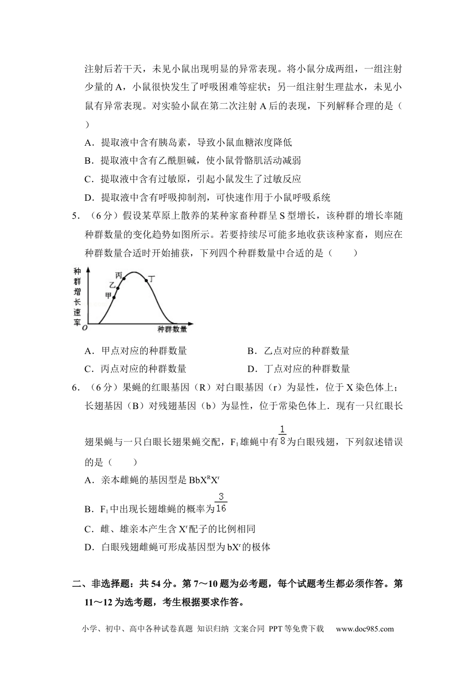 小学、初中、高中各种试卷真题知识归纳文案合同PPT等免费下载www.doc985.com2017年全国统一高考生物试卷(新课标Ⅰ)一、选择题:本题共6个小题,每小题6分,共36分。在每小题给出的四个选项中,只有一项是符合题目要求的。1.(6分)细胞间信息交流的方式有多种。在哺乳动物卵巢细胞分泌的雌激素作用于乳腺细胞的过程中,以及精子进入卵细胞的过程中,细胞间信息交流的实现分别依赖于()A.血液运输,突触传递B.淋巴运输,突触传递C.淋巴运输,胞间连丝传递D.血液运输,细胞间直接接触2.(6分)下列关于细胞结构与成分的叙述,错误的是()A.细胞膜的完整性可用台盼蓝染色法进行检测B.检测氨基酸的含量可用双缩脲试剂进行显色C.若要观察处于细胞分裂中期的染色体可用醋酸洋红液染色D.斐林试剂是含有Cu2+的碱性溶液,可被葡萄糖还原成砖红色3.(6分)通常,叶片中叶绿素含量下降可作为其衰老的检测指标.为研究激素对叶片衰老的影响,将某植物离体叶片分组,并分别置于蒸馏水、细胞分裂素(CTK)、脱落酸(ABA)、CTK+ABA溶液中,再将各组置于光下.一段时间内叶片中叶绿素含量变化趋势如图所示.据图判断,下列叙述错误的是()A.细胞分裂素能延缓该植物离体叶片的衰老B.本实验中CTK对该植物离体叶片的作用可被ABA削弱C.可推测ABA组叶绿体中NADPH合成速率大于CTK组D.可推测施用ABA能加速秋天银杏树的叶由绿变黄的过程4.(6分)某同学将一定量的某种动物的提取液(A)注射到实验小鼠体内,小学、初中、高中各种试卷真题知识归纳文案合同PPT等免费下载www.doc985.com注射后若干天,未见小鼠出现明显的异常表现。将小鼠分成两组,一组注射少量的A,小鼠很快发生了呼吸困难等症状;另一组注射生理盐水,未见小鼠有异常表现。对实验小鼠在第二次注射A后的表现,下列解释合理的是()A.提取液中含有胰岛素,导致小鼠血糖浓度降低B.提取液中含有乙酰胆碱,使小鼠骨骼肌活动减弱C.提取液中含有过敏原,引起小鼠发生了过敏反应D.提取液中含有呼吸抑制剂,可快速作用于小鼠呼吸系统5.(6分)假设某草原上散养的某种家畜种群呈S型增长,该种群的增长率随种群数量的变化趋势如图所示。若要持续尽可能多地收获该种家畜,则应在种群数量合适时开始捕获,下列四个种群数量中合适的是()A.甲点对应的种群数量B.乙点对应的种群数量C.丙点对应的种群数量D.丁点对应的种群数量6.(6分)果蝇的红眼基因(R)对白眼基因(r)为显性,位于X染色体上;长翅基因(B)对残翅基因(b)为显性,位于常染色体上.现有一只红眼长翅果蝇与一只白眼长翅果蝇交配,F1雄蝇中有为白眼残翅,下列叙述错误的是()A.亲本雌蝇的基因型是BbXRXrB.F1中出现长翅雄蝇的概率为C.雌、雄亲本产生含Xr配子的比例相同D.白眼残翅雌蝇可形成基因型为bXr的极体二、非选择题:共54分。第7~10题为必考题,每个试题考生都必须作答。第11~12为选考题,考生根据要求作答。小学、初中、高中各种试卷真题知识归纳文案合同PPT等免费下载www.doc985.com7.(10分)根据遗传物质的化学组成,可将病毒分为RNA病毒和DNA病毒两种类型。有些病毒对人类健康会造成很大危害。通常,一种新病毒出现后需要确定该病毒的类型。假设在宿主细胞内不发生碱基之间的相互转换。请利用放射性同位素标记的方法,以体外培养的宿主细胞等为材料,设计实验以确定一种新病毒的类型。简要写出(1)实验思路,(2)预期实验结果及结论即可。(要求:实验包含可相互印证的甲、乙两个组)。8.(9分)植物的CO2补偿点是指由于CO2的限制,光合速率与呼吸速率相等时环境中的CO2浓度.已知甲种植物的CO2补偿点大于乙种植物的.回答下列问题:(1)将正常生长的甲、乙两种植物放置在同一密闭小室中,适宜条件下照光培养.培养后发现两种植物的光合速率都降低,原因是.甲种植物净光合速率为0时,乙种植物净光合速率(填“大于0”“等于0”“小于0”).(2)若将甲种植物密闭在无O2、但其他条件适宜的小室中,照光培养一段时间后,发现植物的有氧呼吸增加,原因是.9.(8分)血浆渗透压可分为胶体渗透压和晶体渗透压,其中,由蛋白质等大分...