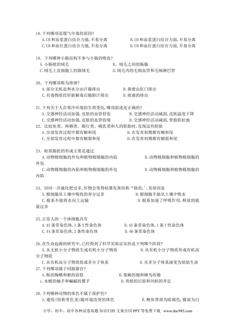 1991年宁夏高考生物真题一、选择题:(本大题共35个小题,每小题1分,共35分。在每小题给出的四个选项中,只有一项是符合题目要求的。把所选项前的字母填在括号内。)1.人的皮肤痛觉感受器位于A.角质层B.生发层C.真皮D.皮下组织2.下列哪一组物质是DNA的组成成分?A.脱氧核糖、核酸和磷酸B.脱氧核糖、碱基和磷酸c.核糖、碱基和磷酸D.核糖、嘧啶、嘌呤和磷酸3.在人体血液循环系统中,下列哪条血管的血液中氧的压力最高?A.股动脉B.肺动脉C.上腔静脉D.下腔静脉4.下列哪种神经结构属于神经中枢?A.交感神经节B.胼胝体C.脊髓灰质D.脑垂体5.下列不属于结缔组织的是A.皮下脂肪B.皮脂腺C.真皮D.血液6.人的卵子和精子结合成为受精卵是发生在A、阴道B.子宫C.输卵管D.卵巢7.在正常情况下,构成黄骨髓的主要成分是A.造血细胞B.脂肪细胞C.胶质细胞D.上皮细胞8.在剧烈运动时,人体骨胳肌所需要的能量直接来源于A、肌糖元B.磷酸肌酸C.葡萄糖D.三磷酸腺苷9.在不损伤高等植物细胞内部结构的情况下,下列哪种物质适用于去除其细胞壁?A.蛋白酶B.盐酸C.纤维素酶D.淀粉酶10.下图表示用云母片(具不透水性)插入燕麦胚芽鞘的尖端部分.从不同方向照光,培养一段时间后,胚芽鞘的生长情况是小学、初中、高中各种试卷真题知识归纳文案合同PPT等免费下载www.doc985.comA、甲向右弯、乙不弯曲、丙不弯曲B、甲向左弯、乙向右弯、丙不弯曲C、甲向左弯、乙不弯曲、丙向左弯D、甲不弯曲、乙不弯曲、丙向右弯11.DNA的一个单链中A+G/T+C=0.4,上边比例在其互补链和整个DNA分子中分别是A.0.4和0.6B.2.5和1.OC.0.4和0.4D.O.6和1.012.某种自花授粉植物连续几代只开红花,一次开出一朵白花,该花的各自交子代全开白花,其原因是A.基因突变B.基因分离C、基因互换D、基因重组13.水稻某些品种茎杆的高矮是由一对等位基因控制的,对一个纯合显性亲本与一个纯合隐性亲本杂交产生的F1进行测交,其后代中杂合体的几率是A.0%B.25%C.50%D.75%14.一个转运RNA的一端三个碱基是CGA,此RNA运载的氨基酸是A.酪氨酸(UAC)B.谷氨酸(GAG)C.精氨酸(CGA)D.丙氨酸(GCU)15.下列哪项于是蛋白质在人体内的生理功能?A.细胞成分的更新物质B.酶的主要成分C.组织修复的原料D.能量的主要来源16.下列哪项属于非特异性免疫?A.白细胞吞噬侵入人体的病菌B.接种卡芥苗预防结核菌感染C.新生婴儿从母体获得抗体D.患过麻疹的人不会再患此病17.下列哪项是甲状腺激素功能的正确叙述?A.甲状腺激素分泌过少,身体逐渐消瘦B.甲状腺激素分泌过少,代谢缓慢、心跳减慢C.甲状腺激素分泌过多,使神经系统兴奋性减弱D.甲状腺激素分泌过多,呼吸困难、心跳减慢小学、初中、高中各种试卷真题知识归纳文案合同PPT等免费下载www.doc985.com18.下列哪项是煤气中毒的原因?A.C0和血浆蛋白结合力强,不易分离B.C0和血浆蛋白结合力弱,不易分离C.C0和血红蛋白结合力强,不易分离D.C0和血红蛋白结合力弱,不易分离19.下列哪种小肠结构不参与小肠的吸收?A.小肠壁的绒毛B、绒毛之间的肠腺C.绒毛上皮细胞上的微绒毛D.绒毛内的毛细血管和毛细淋巴管20、下列哪项称为排泄?A.部分无机盐和水分由汗腺排出B.粪便由肛门排出C.有毒物质经肝脏解毒后随胆汁排出D.痰液的排出21.下列关于人在寒冷环境的生理变化,哪项叙述是正确的?A.交感神经活动加强,皮肤的血管舒张B.交感神经活动减弱,皮肤温度下降C.交感神经活动加强,皮肤的血管收缩D.交感神经活动减弱,骨胳肌松弛22.比较鱼类、两栖类、爬行类、哺乳类和人的胚胎时,发现这些胚胎A.全部发育过程中都有鳃和尾B.在发育初期都有鳃和尾C.全部发育过程中都有鳃裂和尾D.在发育初期都有鳃裂和尾23.蛙原肠腔的形成主要是通过A.动物极细胞的外包和植物极细胞的内陷B.动物极细胞和植物极细胞的外包C.动物极细胞的内陷和植物极细胞的外包D.动物极细胞和植物极细胞的内陷24.田间一次施化肥过多,作物会变得枯萎发黄俗称“烧苗,',其原因是A.根细胞从土壤中吸收的养分过多B.根细胞不能从土壤中吸水C.根系不能将水向上运输D.根系加速了呼吸作用,释放的能量过多25.正常人的一个体细胞具有A.45条常染色体,1条X性染色体B.45条常染色体,1条Y性染色体C.44条常染色体,2条性染色体D.46条常染色...