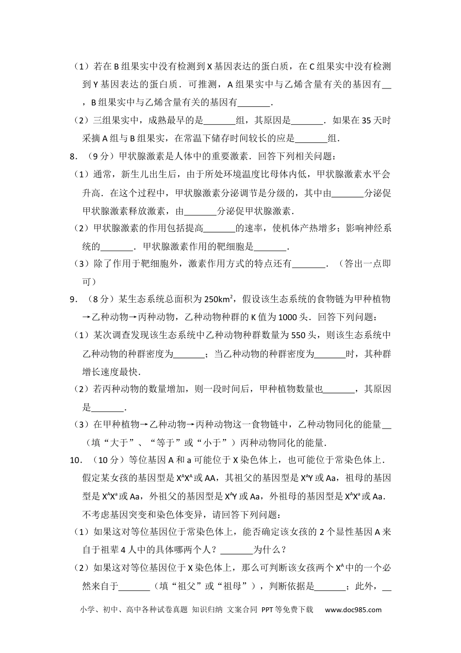 小学、初中、高中各种试卷真题知识归纳文案合同PPT等免费下载www.doc985.com2015年全国统一高考生物试卷(新课标Ⅱ)一、选择题(本题共6小题,每小题6分,在每小题给出的四个选项中,只有一项是符合题目要求的)1.(6分)将三组生理状态相同的某植物幼根分别培养在含有相同培养液的密闭培养瓶中,一段时间后,测定根吸收某一矿质元素离子的量。培养条件及实验结果见下表:培养瓶中气体温度(℃)离子相对吸收量(%)空气17100氮气1710空气328下列分析正确的是()A.有氧条件有利于该植物幼根对该离子的吸收B.该植物幼根对该离子的吸收与温度的变化无关C.氮气环境中该植物幼根细胞吸收该离子不消耗ATPD.与空气相比,氮气环境有利于该植物幼根对该离子的吸收2.(6分)端粒酶由RNA和蛋白质组成,该酶能结合到端粒子上,以自身的RNA为模板合成端粒子DNA的一条链.下列叙述正确的是()A.大肠杆菌拟核的DNA中含有端粒B.端粒酶中的蛋白质为RNA聚合酶C.正常人细胞的每条染色体两端都含有端粒DNAD.正常体细胞的端粒DNA随细胞分裂次数增加而变长3.(6分)下列过程中不属于胞吐作用的是()A.浆细胞分泌抗体到细胞外的作用B.mRNA从细胞核到细胞质的过程C.分泌蛋白从胰腺的腺泡细胞到胞外的过程D.突触小泡中的神经递质释放到突触间隙的过程4.(6分)下列有关生态系统的叙述,错误的是()A.生态系统的组成成分中含有非生物成分小学、初中、高中各种试卷真题知识归纳文案合同PPT等免费下载www.doc985.comB.生态系统相对稳定时无能量输入和散失C.生态系统持续相对稳定离不开信息传递D.负反馈调节有利于生态系统保持相对稳定5.(6分)下列与病原体有关的叙述,正确的是()A.抗体可以进入细胞消灭寄生在其中的结核杆菌B.抗体抵抗病毒的机制与溶菌酶杀灭细菌的机制相同C.Rous肉瘤病毒不是致瘤因子,与人的细胞癌变无关D.人感染HIV后的症状与体内该病毒浓度和T细胞数量有关6.(6分)下列关于人类猫叫综合征的叙述,正确的是()A.该病是由于特定的染色体片段缺失造成的B.该病是由于特定染色体的数目增加造成的C.该病是由于染色体组数目成倍增加造成的D.该病是由于染色体中增加某一片段引起的二、非选择题:包括必考题和选考题两部分.第22题~第32题为必做题,每个考题考生都必须作答,第33~40为选考题,考生根据要求作答.(一)必考题(共129分)7.(12分)某基因的反义基因可抑制该基因的表达.为研究番茄的X基因和Y基因对其果实成熟的影响,某研究小组以番茄的非转基因植株(A组,即对照组)、反义X基因的转基因植株(B组)和反义Y基因的转基因植株(C组)为材料进行试验,在番茄植株长出果实后的不同天数(d),分别检测各组果实的乙烯释放量(果实中乙烯含量越高,乙烯的释放量就越大),结果如下表:组别乙烯释放量(μL•kg1﹣•h1﹣)20d35d40d45dA0271715B0952C0000回答下列问题:小学、初中、高中各种试卷真题知识归纳文案合同PPT等免费下载www.doc985.com(1)若在B组果实中没有检测到X基因表达的蛋白质,在C组果实中没有检测到Y基因表达的蛋白质.可推测,A组果实中与乙烯含量有关的基因有,B组果实中与乙烯含量有关的基因有.(2)三组果实中,成熟最早的是组,其原因是.如果在35天时采摘A组与B组果实,在常温下储存时间较长的应是组.8.(9分)甲状腺激素是人体中的重要激素.回答下列相关问题:(1)通常,新生儿出生后,由于所处环境温度比母体内低,甲状腺激素水平会升高.在这个过程中,甲状腺激素分泌调节是分级的,其中由分泌促甲状腺激素释放激素,由分泌促甲状腺激素.(2)甲状腺激素的作用包括提高的速率,使机体产热增多;影响神经系统的.甲状腺激素作用的靶细胞是.(3)除了作用于靶细胞外,激素作用方式的特点还有.(答出一点即可)9.(8分)某生态系统总面积为250km2,假设该生态系统的食物链为甲种植物→乙种动物→丙种动物,乙种动物种群的K值为1000头.回答下列问题:(1)某次调查发现该生态系统中乙种动物种群数量为550头,则该生态系统中乙种动物的种群密度为;当乙种动物的种群密度为时,其种群增长速度最快.(2)若...