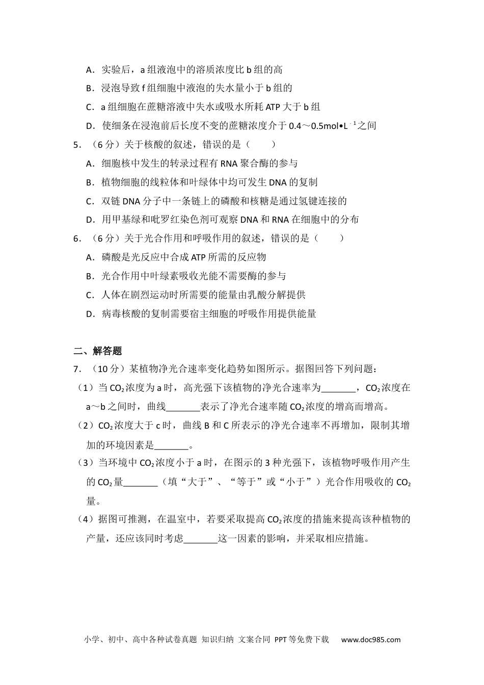 小学、初中、高中各种试卷真题知识归纳文案合同PPT等免费下载www.doc985.com2014年全国统一高考生物试卷(新课标Ⅱ)一、选择题:本题共6小题,每小题6分,在每小题给出的四个选项中,只有一项是符合题目要求的.1.(6分)关于细胞的叙述,错误的是()A.植物细胞的胞间连丝具有物质运输的作用B.动物细胞间的黏着性与细胞膜上的糖蛋白有关C.ATP水解释放的能量可用于细胞内的吸能反应D.哺乳动物的细胞可以合成蔗糖,也可以合成乳糖2.(6分)同一动物个体的神经细胞与肌细胞在功能上是不同的,造成这种差异的主要原因是()A.二者所处的细胞周期不同B.二者合成的特定蛋白不同C.二者所含有的基因组不同D.二者核DNA的复制方式不同3.(6分)关于正常情况下组织液生成与回流的叙述,错误的是()A.生成与回流的组织液中氧气的含量相等B.组织液不断生成与回流,并保持动态平衡C.血浆中的有些物质经毛细血管动脉端进入组织液D.组织液中的有些物质经毛细血管静脉端进入血液4.(6分)将某植物花冠切成大小和形状相同的细条,分为a、b、c、d、e和f组(每组的细条数相等),取上述6组细条分别置于不同浓度的蔗糖溶液中,浸泡相同时间后测量各组花冠细条的长度,结果如图所示。假如蔗糖溶液与花冠细胞之间只有水分交换,则()小学、初中、高中各种试卷真题知识归纳文案合同PPT等免费下载www.doc985.comA.实验后,a组液泡中的溶质浓度比b组的高B.浸泡导致f组细胞中液泡的失水量小于b组的C.a组细胞在蔗糖溶液中失水或吸水所耗ATP大于b组D.使细条在浸泡前后长度不变的蔗糖浓度介于0.4~0.5mol•L1﹣之间5.(6分)关于核酸的叙述,错误的是()A.细胞核中发生的转录过程有RNA聚合酶的参与B.植物细胞的线粒体和叶绿体中均可发生DNA的复制C.双链DNA分子中一条链上的磷酸和核糖是通过氢键连接的D.用甲基绿和吡罗红染色剂可观察DNA和RNA在细胞中的分布6.(6分)关于光合作用和呼吸作用的叙述,错误的是()A.磷酸是光反应中合成ATP所需的反应物B.光合作用中叶绿素吸收光能不需要酶的参与C.人体在剧烈运动时所需要的能量由乳酸分解提供D.病毒核酸的复制需要宿主细胞的呼吸作用提供能量二、解答题7.(10分)某植物净光合速率变化趋势如图所示。据图回答下列问题:(1)当CO2浓度为a时,高光强下该植物的净光合速率为,CO2浓度在a~b之间时,曲线表示了净光合速率随CO2浓度的增高而增高。(2)CO2浓度大于c时,曲线B和C所表示的净光合速率不再增加,限制其增加的环境因素是。(3)当环境中CO2浓度小于a时,在图示的3种光强下,该植物呼吸作用产生的CO2量(填“大于”、“等于”或“小于”)光合作用吸收的CO2量。(4)据图可推测,在温室中,若要采取提高CO2浓度的措施来提高该种植物的产量,还应该同时考虑这一因素的影响,并采取相应措施。小学、初中、高中各种试卷真题知识归纳文案合同PPT等免费下载www.doc985.com8.(9分)为了探究某种复方草药对某种细菌性乳腺炎的疗效是否与机体免疫功能增强有关,某研究小组将细菌性乳腺炎模型小鼠随机分为实验组(草药灌胃)、空白对照组(蒸馏水灌胃)和阳性对照组(免疫增强剂A灌胃),并检测免疫指标。回答下列问题:(1)研究发现:实验组小鼠吞噬细胞的吞噬能力显著高于阳性对照组,极显著高于空白对照组,这一结果至少可说明该草药增强了小鼠的非特异性免疫功能,非特异性免疫的特点是。(2)研究还发现:实验组小鼠的T细胞含量显著高于空白对照组,与阳性对照组相近。这一结果说明:该草药可能通过提高小鼠T细胞含量来增强其特异性免疫功能。通常,在细胞免疫中,效应T细胞的作用是。(3)在特异性免疫中,T细胞可产生因子,受到抗原刺激的细胞可在该因子的作用下,增殖分化为浆细胞,浆细胞产生,参与体液免疫过程。9.(9分)某陆地生态系统中,除分解者外,仅有甲、乙、丙、丁、戊5个种群,调查得知,该生态系统有4个营养级,营养级之间的能量传递效率为10%~20%,且每个种群只处于一个营养级。一年内输入各种群的能量数值如表所示,表中能量数值的单位相同。回答下列问题:种群甲乙丙丁戊能量3.5612.8010.300.48226.5...