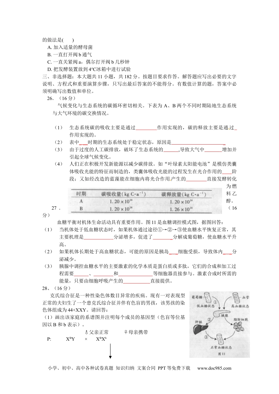 小学、初中、高中各种试卷真题知识归纳文案合同PPT等免费下载www.doc985.com2010年普通高等学校招生全国统一考试(广东卷)理科综合本试卷共10页,36小题,满分300分。考试用时150分钟。可能用到的相对原子量:H1Li7B11C12N14O16Na23一、单项选择题:本大题共16小题,每小题4分。共64分。在每小题给出的四个选项中,只有一个选项符合题目要求,选对的得4分,选错或不答的得0分。1.图1是植物从土壤中吸收某矿物质离子示意图。据图判断,该离子跨膜进入根毛细胞的方式为()A.自由扩散B.协助扩散C.主动运输D.被动运输2.谚语“苗多欺草,草多欺苗”反映的种间关系是()A.竞争B.共生C.寄生D.捕食3.骨髓移植是治疗白血病常用的有效方法之一,最主要的原因是移植骨髓中的造血干细胞可在患者体内()A.正常生长B.增殖并分化成多种细胞C.分泌抗体D.杀死各种病原菌4.下列叙述正确的是()A.DNA是蛋白质合成的直接模板B.每种氨基酸仅有一种密码子编码C.DNA复制就是基因表达的过程D.DNA是主要的遗传物质5.黄曲霉毒素是主要由黄曲霉菌产生的可致癌毒素,其生物合成受多个基因控制,也受温度、pH等因素影响。下列选项正确的是()A.环境因子不影响生物体的表现型B.不产生黄曲霉毒素菌株的基因型都相同C.黄曲霉毒素致癌是表现型D.黄曲霉菌产生黄曲霉毒素是表现型6.重症肌无力患者由于体内存在某种抗体,该抗体与神经-肌肉突触的受体特异性结合,使该受体失去功能,最终导致()A.刺激神经不能引起肌肉收缩B.全身出现性过敏反应C.肌肉对神经递质的反应性提高D.机体对病原体的反应能力提高二.双项选择题:本大题共9小题,每小题6分,共54分。在每小题给出的四个选项中,有两个选项符合题目要求,全部选对得6分,只选1个且正确的得3分,有选错或不答的得0分。22.新技术的建立和应用对生物学发展至关重要。下列技术(或仪器)与应用匹配正确的是()A.PCR技术——扩增蛋白质B.杂交瘤技术——制备单克隆抗体C.光学显微镜——观察叶绿体的基粒D.花粉离体培养——培育单倍体植物25.小李尝试制作果酒,他将葡萄汁放入已灭菌的发酵装置中进行试验(见图10),恰当小学、初中、高中各种试卷真题知识归纳文案合同PPT等免费下载www.doc985.com的做法是()A.加入适量的酵母菌B.一直打开阀b通气C.一直关紧阀a,偶尔打开阀b几秒钟D.把发酵装置放到4℃冰箱中进行试验三、非选择题:本大题共11小题,共182分。按题目要求作答。解答题应写出必要的文字说明、方程式和重要演算步骤,只写出最后答案的不能得分。有数值计算的题,答案中必须明确写出数值和单位。26.(16分)气候变化与生态系统的碳循环密切相关。下表为A、B两个不同时期陆地生态系统与大气环境的碳交换情况。(1)生态系统碳的吸收主要是通过作用实现的,碳的释放主要是通过作用实现的。(2)表中___时期的生态系统处于稳定状态,原因是_(3)由于过度的人工碳排放,破坏了生态系统的,导致大气中增加并引起全球气候变化。(4)人们正在积极开发新能源以减少碳排放。如“叶绿素太阳能电池”是模仿类囊体吸收光能的特征而制造的,类囊体吸收光能的过程发生在光合作用的阶段;又如经改造的蓝藻能在细胞内将光合作用产生的直接发酵转化为燃料乙醇。27.(16分)血糖平衡对机体生命活动具有重要作用。图11是血糖调控模式图,据图回答:(1)当机体处于低血糖状态时,如果机体通过途径①→②→③使血糖水平恢复正常,其主要机理是分泌增多,促进了_分解成葡萄糖,使血糖水平升高。(2)如果机体长期处于高血糖状态,可能的原因是胰岛__细胞受损,导致体内__分泌减少。(3)胰腺中调控血糖水平的主要激素的化学本质是蛋白质或多肽,它们的合成和加工过程需要、和等细胞器直接参与。激素合成时所需的能量,只要由细胞呼吸产生的直接提供。28、(16分)克氏综合征是一种性染色体数目异常的疾病。现有一对表现型正常的夫妇生了一个患克氏综合征并伴有色盲的男孩,该男孩的染色体组成为44+XXY。请回答:(1)画出该家庭的系谱图并注明每个成员的基因型(色盲等位基因以B和b表示)。♂父亲正常♀母亲携带P:XBY×XBXb小学、初中、高中各种试卷真题知识归纳文案合同PPT等免费下载...
