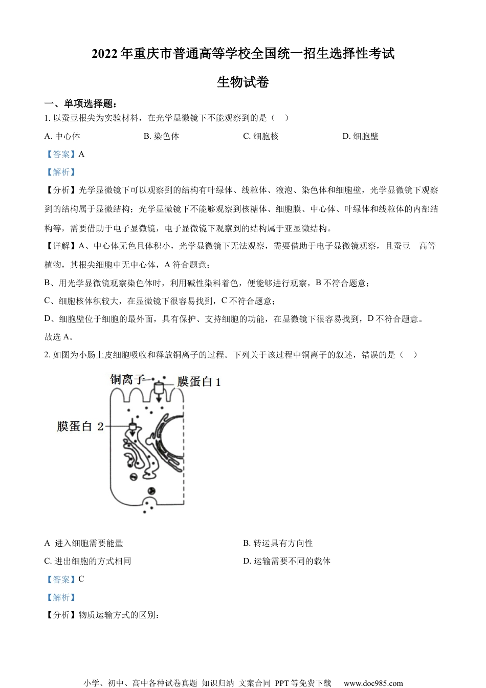 小学、初中、高中各种试卷真题知识归纳文案合同PPT等免费下载www.doc985.com2022年重庆市普通高等学校全国统一招生选择性考试生物试卷一、单项选择题:1.以蚕豆根尖为实验材料,在光学显微镜下不能观察到的是()A.中心体B.染色体C.细胞核D.细胞壁【答案】A【解析】【分析】光学显微镜下可以观察到的结构有叶绿体、线粒体、液泡、染色体和细胞壁,光学显微镜下观察到的结构属于显微结构;光学显微镜下不能够观察到核糖体、细胞膜、中心体、叶绿体和线粒体的内部结构等,需要借助于电子显微镜,电子显微镜下观察到的结构属于亚显微结构。【详解】A、中心体无色且体积小,光学显微镜下无法观察,需要借助于电子显微镜观察,且蚕豆是高等植物,其根尖细胞中无中心体,A符合题意;B、用光学显微镜观察染色体时,利用碱性染料着色,便能够进行观察,B不符合题意;C、细胞核体积较大,在显微镜下很容易找到,C不符合题意;D、细胞壁位于细胞的最外面,具有保护、支持细胞的功能,在显微镜下很容易找到,D不符合题意。故选A。2.如图为小肠上皮细胞吸收和释放铜离子的过程。下列关于该过程中铜离子的叙述,错误的是()A.进入细胞需要能量B.转运具有方向性C.进出细胞的方式相同D.运输需要不同的载体【答案】C【解析】【分析】物质运输方式的区别:小学、初中、高中各种试卷真题知识归纳文案合同PPT等免费下载www.doc985.com名称运输方向载体能量实例自由扩散高浓度→低浓度不需不需水,CO2,O2,甘油,苯、酒精等协助扩散高浓度→低浓度需要不需红细胞吸收葡萄糖主动运输低浓度→高浓度需要需要小肠绒毛上皮细胞吸收氨基酸,葡萄糖,K+,Na+等【详解】A、由图示可知,铜离子进入细胞是由低浓度向高浓度运输,需要载体,消耗能量,A正确;B、铜离子转运具有方向性,B正确;C、铜离子进入细胞是主动运输,运出细胞是先通过协助扩散进入高尔基体,然后由高尔基体膜包裹通过胞吐运出细胞,C错误;D、由图示可知进入细胞需要膜蛋白1协助,运出细胞需要膜蛋白2协助,D正确。故选C。3.将人胰岛素A链上1个天冬氨酸替换为甘氨酸,B链末端增加2个精氨酸,可制备出一种人工长效胰岛素。下列关于该胰岛素的叙述,错误的是()A.进入人体后需经高尔基体加工B.比人胰岛素多了2个肽键C.与人胰岛素有相同的靶细胞D.可通过基因工程方法生产【答案】A【解析】【分析】基因工程只能生产已有的蛋白质,人工长胰岛素A链有氨基酸的替换,B链增加了两个氨基酸,需要通过蛋白质工程生产。【详解】A、胰岛素作用于细胞表面的受体,不需要经高尔基体的加工,A错误;B、人工长效胰岛素比人胰岛素的B链上多了两个精氨酸,氨基酸与氨基酸之间通过肽键连接,故多2个肽键,B正确;C、人工胰岛素和人胰岛素作用相同,都是降血糖的作用,故靶细胞相同,C正确;D、人工长效胰岛素是对天然蛋白质的改造,需要通过基因工程生产,D正确。故选A。4.下列发现中,以DNA双螺旋结构模型为理论基础的是()A.遗传因子控制性状B.基因在染色体上小学、初中、高中各种试卷真题知识归纳文案合同PPT等免费下载www.doc985.comC.DNA是遗传物质D.DNA半保留复制【答案】D【解析】【分析】1、DNA分子复制的特点:半保留复制;边解旋边复制。2、DNA分子复制的场所:细胞核、线粒体和叶绿体。3、DNA分子复制的过程:①解旋:在解旋酶的作用下,把两条螺旋的双链解开。②合成子链:以解开的每一条母链为模板,以游离的四种脱氧核苷酸为原料,遵循碱基互补配对原则,在有关酶的作用下,各自合成与母链互补的子链。③形成子代DNA:每条子链与其对应的母链盘旋成双螺旋结构。从而形成2个与亲代DNA完全相同的子代DNA分子。4、DNA分子复制的时间:有丝分裂的间期和减数第一次分裂前的间期。【详解】A、孟德尔利用假说—演绎法提出了生物的性状是由遗传因子控制的,总结出了分离定律,并未以DNA双螺旋结构模型为理论基础,A不符合题意;B、萨顿根据基因与染色体的平行关系,运用类比推理法得出基因位于染色体上的推论,并未以DNA双螺旋结构模型为理论基础,B不符合题意;C、艾弗里、赫尔希和蔡斯等科学家,设法将DNA和蛋白质分开,单独、直接地研究它们的作...