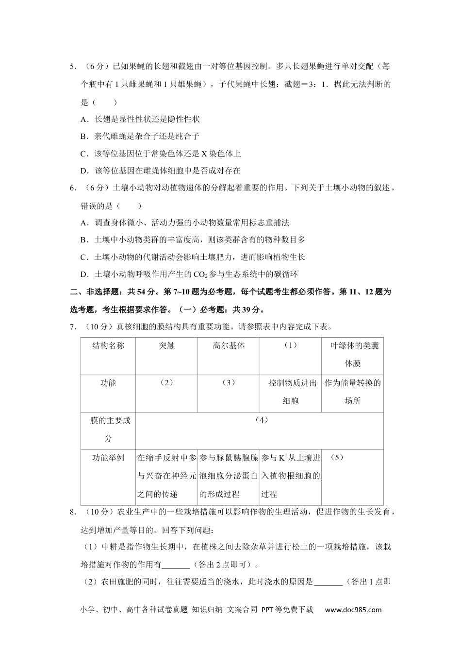 小学、初中、高中各种试卷真题知识归纳文案合同PPT等免费下载www.doc985.com2020年全国统一高考生物试卷(新课标Ⅰ)一、选择题:本题共6小题,每小题6分,共36分。在每小题给出的四个选项中,只有一项是符合题目要求的。1.(6分)新冠肺炎疫情警示人们要养成良好的生活习惯,提高公共卫生安全意识。下列相关叙述错误的是()A.戴口罩可以减少病原微生物通过飞沫在人与人之间的传播B.病毒能够在餐具上增殖,用食盐溶液浸泡餐具可以阻止病毒增殖C.高温可破坏病原体蛋白质的空间结构,煮沸处理餐具可杀死病原体D.生活中接触的物体表面可能存在病原微生物,勤洗手可降低感染风险2.(6分)种子贮藏中需要控制呼吸作用以减少有机物的消耗。若作物种子呼吸作用所利用的物质是淀粉分解产生的葡萄糖,下列关于种子呼吸作用的叙述,错误的是()A.若产生的CO2与乙醇的分子数相等,则细胞只进行无氧呼吸B.若细胞只进行有氧呼吸,则吸收O2的分子数与释放CO2的相等C.若细胞只进行无氧呼吸且产物是乳酸,则无O2吸收也无CO2释放D.若细胞同时进行有氧和无氧呼吸,则吸收O2的分子数比释放CO2的多3.(6分)某研究人员以小鼠为材料进行了与甲状腺相关的实验,下列叙述错误的是()A.切除小鼠垂体,会导致甲状腺激素分泌不足,机体产热减少B.给切除垂体的幼年小鼠注射垂体提取液后,其耗氧量会增加C.给成年小鼠注射甲状腺激素后,其神经系统的兴奋性会增强D.给切除垂体的小鼠注射促甲状腺激素释放激素,其代谢可恢复正常4.(6分)为达到实验目的,需要选用合适的实验材料进行实验。下列实验目的与实验材料的对应,不合理的是()实验材料实验目的A大蒜根尖分生区细胞观察细胞的质壁分离与复原B蝗虫的精巢细胞观察细胞的减数分裂C哺乳动物的红细胞观察细胞的吸水和失水D人口腔上皮细胞观察DNA、RNA在细胞中的分布A.AB.BC.CD.D小学、初中、高中各种试卷真题知识归纳文案合同PPT等免费下载www.doc985.com5.(6分)已知果蝇的长翅和截翅由一对等位基因控制。多只长翅果蝇进行单对交配(每个瓶中有1只雌果蝇和1只雄果蝇),子代果蝇中长翅:截翅=3:1.据此无法判断的是()A.长翅是显性性状还是隐性性状B.亲代雌蝇是杂合子还是纯合子C.该等位基因位于常染色体还是X染色体上D.该等位基因在雌蝇体细胞中是否成对存在6.(6分)土壤小动物对动植物遗体的分解起着重要的作用。下列关于土壤小动物的叙述,错误的是()A.调查身体微小、活动力强的小动物数量常用标志重捕法B.土壤中小动物类群的丰富度高,则该类群含有的物种数目多C.土壤小动物的代谢活动会影响土壤肥力,进而影响植物生长D.土壤小动物呼吸作用产生的CO2参与生态系统中的碳循环二、非选择题:共54分。第7~10题为必考题,每个试题考生都必须作答。第11、12题为选考题,考生根据要求作答。(一)必考题:共39分。7.(10分)真核细胞的膜结构具有重要功能。请参照表中内容完成下表。结构名称突触高尔基体(1)叶绿体的类囊体膜功能(2)(3)控制物质进出细胞作为能量转换的场所膜的主要成分(4)功能举例在缩手反射中参与兴奋在神经元之间的传递参与豚鼠胰腺腺泡细胞分泌蛋白的形成过程参与K+从土壤进入植物根细胞的过程(5)8.(10分)农业生产中的一些栽培措施可以影响作物的生理活动,促进作物的生长发育,达到增加产量等目的。回答下列问题:(1)中耕是指作物生长期中,在植株之间去除杂草并进行松土的一项栽培措施,该栽培措施对作物的作用有(答出2点即可)。(2)农田施肥的同时,往往需要适当的浇水,此时浇水的原因是(答出1点即小学、初中、高中各种试卷真题知识归纳文案合同PPT等免费下载www.doc985.com可)。(3)农业生产常采用间作(同一生长期内,在同一块农田上间隔种植两种作物)的方法提高农田的光能利用率。现有4种作物,在正常条件下生长能达到的株高和光饱和点(光合速率达到最大时所需的光照强度)见下表。从提高光能利用率的角度考虑,最适合进行间作的两种作物是,选择这两种作物的理由是。作物ABCD株高/cm1706559165光饱和点/μmol•m2﹣•s1﹣120011805606239.(10分)某研究人员用药...