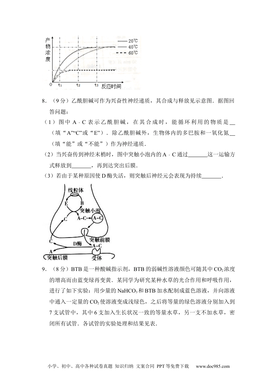 小学、初中、高中各种试卷真题知识归纳文案合同PPT等免费下载www.doc985.com2016年全国统一高考生物试卷(新课标Ⅱ)一、选择题:本大题共6小题,每小题6分。在每小题给出的四个选项中,只有一项是符合题目要求的1.(6分)在细胞的生命历程中,会出现分裂、分化等现象.下列叙述错误的是()A.细胞的有丝分裂对生物性状的遗传有贡献B.哺乳动物的造血干细胞是未经分化的细胞C.细胞分化是细胞内基因选择性表达的结果D.通过组织培养可将植物叶肉细胞培育成新的植株2.(6分)某种物质可插入DNA分子两条链的碱基对之间,使DNA双链不能解开.若在细胞正常生长的培养液中加入适量的该物质,下列相关叙述错误的是()A.随后细胞中的DNA复制发生障碍B.随后细胞中的DNA转录发生障碍C.该物质可将细胞周期阻断在分裂中期D.可推测该物质对癌细胞的增殖有抑制作用3.(6分)下列关于动物激素的叙述,错误的是()A.机体内、外环境的变化可影响激素的分泌B.切除动物垂体后,血液中生长激素的浓度下降C.通过对转录的调节可影响蛋白质类激素的合成量D.血液中胰岛素增加可促进胰岛B细胞分泌胰高血糖素4.(6分)关于高等植物叶绿体中色素的叙述,错误的是()A.叶绿体中的色素能够溶解在有机溶剂乙醇中B.构成叶绿素的镁可以由植物的根从土壤中吸收C.通常,红外光和紫外光可被叶绿体中的色素吸收用于光合作用D.黑暗中生长的植物幼苗叶片呈黄色是由于叶绿素合成受阻引起的5.(6分)如果采用样方法调查某地区(甲地)蒲公英的种群密度,下列做法中正确的是()A.计数甲地内蒲公英的总数,再除以甲地面积,作为甲地蒲公英的种群密小学、初中、高中各种试卷真题知识归纳文案合同PPT等免费下载www.doc985.com度B.计数所有样方内蒲公英总数,除以甲地面积,作为甲地蒲公英的种群密度C.计算出每个样方中蒲公英的密度,求出所有样方蒲公英密度的平均值,作为甲地蒲公英的种群密度D.求出所有样方蒲公英的总数,除以所有样方的面积之和,再乘以甲地面积,作为甲地蒲公英的种群密度6.(6分)果蝇的某对相对性状由等位基因G、g控制,相对于这对性状的表现型而言,G对g完全显性。受精卵中不存在G、g中的某个特定基因时会致死。用一对表现型不同的果蝇进行交配,得到的子一代果蝇中雌:雄=2:1,且雌蝇有两种表现型。据此可推测雌蝇中()A.这对等位基因位于常染色体上,G基因纯合时致死B.这对等位基因位于常染色体上,g基因纯合时致死C.这对等位基因位于X染色体上,g基因纯合时致死D.这对等位基因位于X染色体上,G基因纯合时致死二、非选择题:包括必考题和选考题两部分.第22题~第32题为必考题,每个试题考生都必须作答.第33题~第40题为选考题,考生根据要求作答.(一)必考题(共39分)7.(10分)为了研究温度对某种酶活性的影响,设置三个实验组:A组(20℃)、B组(40℃)和C组(60℃),测定各组在不同反应时间内的产物浓度(其他条件相同),结果如图.回答下列问题:(1)三个温度条件下,该酶活性最高的是组.(2)在时间t1之前,如果A组温度提高10℃,那么A组酶催化反应的速度会.(3)如果在时间t2时,向C组反应体系中增加2倍量的底物,其他条件保持不变,那么在t3时,C组产物总量,原因是.(4)生物体内酶的化学本质是,其特性有(答出两点即可).小学、初中、高中各种试卷真题知识归纳文案合同PPT等免费下载www.doc985.com8.(9分)乙酰胆碱可作为兴奋性神经递质,其合成与释放见示意图.据图回答问题:(1)图中AC﹣表示乙酰胆碱,在其合成时,能循环利用的物质是(填“A”“C”或“E”).除乙酰胆碱外,生物体内的多巴胺和一氧化氮(填“能”或“不能”)作为神经递质.(2)当兴奋传到神经末梢时,图中突触小泡内的AC﹣通过这一运输方式释放到,再到达突出后膜.(3)若由于某种原因使D酶失活,则突触后神经元会表现为持续.9.(8分)BTB是一种酸碱指示剂,BTB的弱碱性溶液颜色可随其中CO2浓度的增高而由蓝变绿再变黄.某同学为研究某种水草的光合作用和呼吸作用,进行了如下实验:用少量的NaHCO3和BTB加水配制成蓝色溶液,并向溶液中通入一定量的CO2使溶液变...