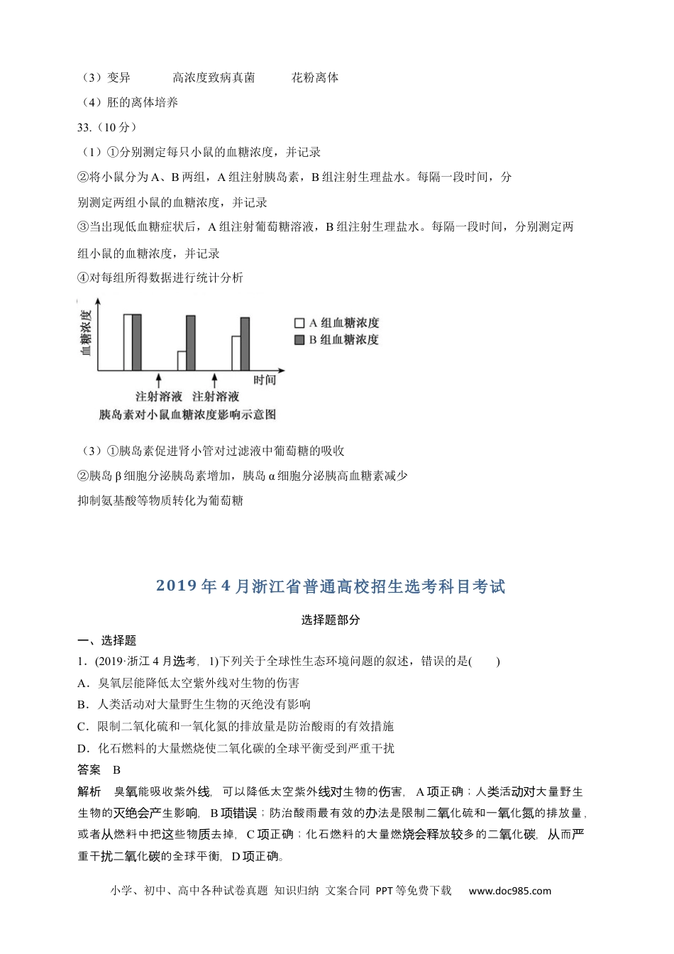 小学、初中、高中各种试卷真题知识归纳文案合同PPT等免费下载www.doc985.com参考答案一、选择题(本大题共28小题,每小题2分,共56分)1.B2.D3.C4.B5.A6.A7.C8.A9.C10.D11.B12.B13.D14.D15.D16.D17.A18.C19.B20.C21.D22.A23.D24.A25.D26.A27.A28.B二、非选择题(本大题共5小题,共44分)29.(6分)(1)生物放大底泥(2)富营养化正反馈(3)自然增长率(4)逻辑斯谛(或S形)30.(7分)(1)增加ATP和NADPH增加基质(2)类胡萝卜素蓝紫光和红低温31.(7分)(1)伴Ⅹ染色体隐性遗传杂交组合甲的亲本均为野生型,F1中雌性个体均为野生型,而雄性个体中出现了朱红眼(2)BbXAXaBbXAY两对等位基因均为隐性时表现为白色(3)32.(14分)(一)(1)腐烂的水果中含产果胶酶的微生物较多(2)涂布分离(或划线分离)(3)水果组织软化疏松及细胞受损95%乙醇(4)提高果胶酶的稳定性固定化的方法固定化所用的介质(二)(1)单克隆抗体基因文库(2)B小学、初中、高中各种试卷真题知识归纳文案合同PPT等免费下载www.doc985.com(3)变异高浓度致病真菌花粉离体(4)胚的离体培养33.(10分)(1)①分别测定每只小鼠的血糖浓度,并记录②将小鼠分为A、B两组,A组注射胰岛素,B组注射生理盐水。每隔一段时间,分别测定两组小鼠的血糖浓度,并记录③当岀现低血糖症状后,A组注射葡萄糖溶液,B组注射生理盐水。每隔一段时间,分别测定两组小鼠的血糖浓度,并记录④对每组所得数据进行统计分析(3)①胰岛素促进肾小管对过滤液中葡萄糖的吸收②胰岛β细胞分泌胰岛素增加,胰岛α细胞分泌胰高血糖素减少抑制氨基酸等物质转化为葡萄糖2019年4月浙江省普通高校招生选考科目考试选择题部分一、选择题1.(2019·浙江4月考,选1)下列关于全球性生态环境问题的叙述,错误的是()A.臭氧层能降低太空紫外线对生物的伤害B.人类活动对大量野生生物的灭绝没有影响C.限制二氧化硫和一氧化氮的排放量是防治酸雨的有效措施D.化石燃料的大量燃烧使二氧化碳的全球平衡受到严重干扰答案B解析臭能吸收紫外,可以降低太空紫外生物的害,氧线线对伤A正确;人活大量野生项类动对生物的生影,灭绝会产响B;防治酸雨最有效的法是限制二化硫和一化的排放量项错误办氧氧氮,或者燃料中把些物去掉,从这质C正确;化石燃料的大量燃放多的二化,而项烧会释较氧碳从严重干二化的全球平衡,扰氧碳D正确。项小学、初中、高中各种试卷真题知识归纳文案合同PPT等免费下载www.doc985.com2.(2019·浙江4月考,选2)人类某遗传病的染色体核型如图所示。该变异类型属于()A.基因突变B.基因重组C.染色体结构变异D.染色体数目变异答案D解析分析病的染色体核型可知,该遗传图21染色体有号3,型于染色体目条这种变异类属数变,故异选D。3.(2019·浙江4月考,选3)细胞学说认为:所有的生物都是由一个或多个细胞组成的;细胞是所有生物的结构和功能的单位;所有的细胞必定是由已存在的细胞产生的。据此分析,下列叙述错误的是()A.生物具有多样性B.生物具有遗传性C.生物能定向变异D.生物具有统一性答案C解析所有的生物都是由一或多胞成的,胞是所有生物的和功能的位,明生个个细组细结构单说物具有一性和多性,统样A、D正确;所有的胞必定是由已存在的胞生的,明生物具有细细产说遗性,传B正确;生物的是不定向的,变异C。错误4.(2019·浙江4月考,选4)下列关于艾滋病的叙述,正确的是()A.HIV只含有一种蛋白质B.患者的血液和精液中均含有HIVC.HIV不会感染脑细胞和巨噬细胞D.艾滋病是一种先天性免疫缺陷病答案B解析HIV含有多蛋白,种质A;艾滋病的播途包括母播、性接和血液播,项错误传径婴传触传明艾滋病患者的血液和精液中均含有说HIV,B正确;项HIV侵入人体后能合助性识别并结辅T淋巴胞表面的受体,入胞行破坏,除助性细进该细进辅T淋巴胞外,细HIV也感染胞和巨会脑细噬胞,细C;艾滋病是一后天得性免疫缺陷病,项错误种获D。项错误5.(2019·浙江4月考,选5)细胞核中与核糖体形成有关的主要结构是()A.核仁B.核基质C.核被膜D.核孔复合体答案A解析胞核中核糖体形成有的主要是核仁,故细与关结构选A。小学、初中、高中各...