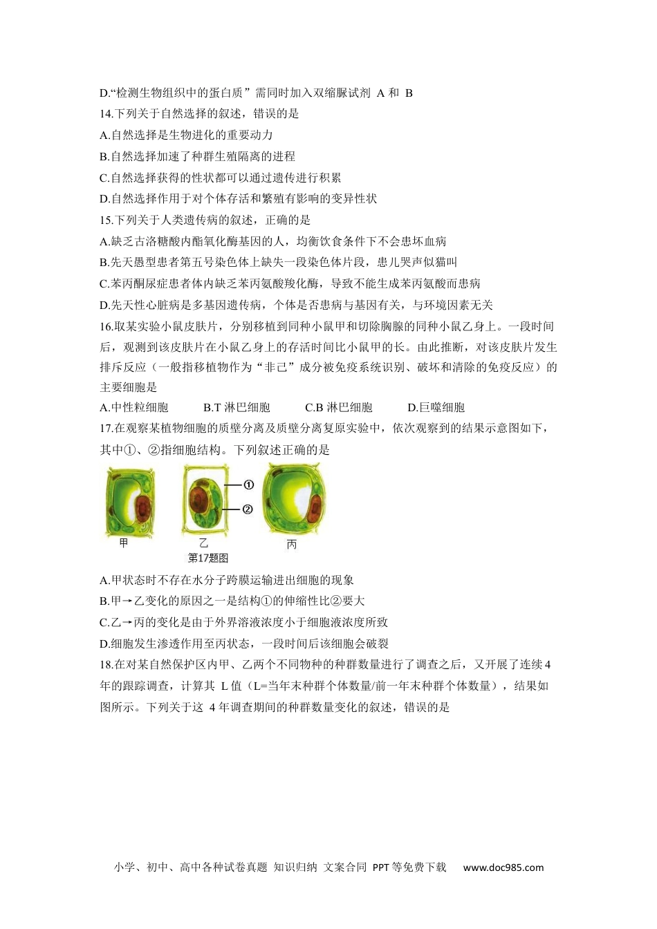 小学、初中、高中各种试卷真题知识归纳文案合同PPT等免费下载www.doc985.com2018年4月浙江省普通高校招生选考科目考试生物试题一、选择题(本大题共28小题,每小题2分,共56分。每小题列出的四个备选项中只有一个是符合题目要求的,不选、多选、错选均不得分)1.与家兔肌肉细胞相比,菠菜叶肉细胞不具有的结构是A.细胞壁B.叶绿体C.液泡D.中心体2.下列属于防止大气圈臭氧减少的措施是A.减少氟利昂的使用B.增加化肥的使用C.增加污染物的排放D.增加汽车尾气的排放3.将某种海鱼的抗冻基因导入西红柿细胞中,培育成耐低温的西红柿新品种。这种导入外源基因的方法属于A.杂交育种B.转基因技术C.单倍体育种D.多倍体育种4.影响水生群落垂直分层的主要因素不包括A.温度B.氧气的垂直分布C.光的穿透性D.大气中颗粒物含量5.一对A血型和B血型的夫妇,生了AB血型的孩子。AB血型的这种显性类型属于A.完全显性B.不完全显性C.共显性D.性状分离6.下列关于人体内性激素的叙述,错误的是A.睾酮促进卵细胞的发生B.雌激素促进女性皮下脂肪的积累C.雌激素增强输卵管和子宫的活动D.雄激素促进男性附属生殖器官的生长7.下列关于细胞癌变与癌细胞的叙述,正确的是A.癌细胞的分裂失去控制,但其增殖是有限的B.癌细胞表面粘连蛋白的增加,使其易化扩散转移C.有些物理射线可诱发基因突变,导致细胞癌变D.癌变是细胞异常分化的结果,此分化大多可逆8.人体细胞内存在一套复杂的膜系统。下列叙述错误的是A.由单位膜包被的溶酶体含多种水解酶B.高尔基体主要进行蛋白质的分拣和转运C.肝脏细胞的光面内质网上含氧化酒精的酶D.核被膜与质膜的相连可通过线粒体来实现9.某同学进行了2,4-D对插枝生根作用的实验,结果如图所示,其中丙是蒸馏水处理组。下列叙述正确的是小学、初中、高中各种试卷真题知识归纳文案合同PPT等免费下载www.doc985.comA.图中纵坐标的名称只能用根数量表示B.2,4-D的浓度时该实验的可变因素C.由图中可知甲组的2,4-D浓度高于乙组D.达到a点的生根效果,甲组处理时间比乙组长10.ATP是细胞中的能量通货。下列叙述正确的是A.ATP中的能量均来自细胞呼吸释放的能量B.ATP-ADP循环使得细胞储存了大量的ATPC.ATP水解形成ADP时释放能量和磷酸基团D.ATP分子中的2个高能磷酸键不易断裂水解11.下列关于人体内环境的叙述,错误的是A.心肌细胞内的CO2浓度低于其生活的内环境B.血管中的药物需经组织液进入肌细胞C.血浆蛋白进入组织液会引起组织肿胀D.内环境的成分中有葡萄糖和无机盐12.以酵母菌和葡萄糖为材料进行“乙醇发酵实验”,装置图如下。下列关于该实验过程与结果的叙述,错误的是A.将温水化开的酵母菌悬液加入盛有葡萄糖液的甲试管后需振荡混匀B.在甲试管内的混合液表面需滴加一薄层液体石蜡以制造富氧环境C.乙试管中澄清的石灰水浑浊可推知酵母菌细胞呼吸产生了CO2D.拔掉装有酵母菌与葡萄糖混合液的甲试管塞子后可闻到酒精的气味13.蛋白质在生物体内具有重要作用。下列叙述正确的是A.蛋白质化学结构的差异只是R基团的不同B.某些化学物质可使蛋白质的空间结构发生改变C.蛋白质控制和决定着细胞及整个生物体的遗传特性小学、初中、高中各种试卷真题知识归纳文案合同PPT等免费下载www.doc985.comD.“检测生物组织中的蛋白质”需同时加入双缩脲试剂A和B14.下列关于自然选择的叙述,错误的是A.自然选择是生物进化的重要动力B.自然选择加速了种群生殖隔离的进程C.自然选择获得的性状都可以通过遗传进行积累D.自然选择作用于对个体存活和繁殖有影响的变异性状15.下列关于人类遗传病的叙述,正确的是A.缺乏古洛糖酸内酯氧化酶基因的人,均衡饮食条件下不会患坏血病B.先天愚型患者第五号染色体上缺失一段染色体片段,患儿哭声似猫叫C.苯丙酮尿症患者体内缺乏苯丙氨酸羧化酶,导致不能生成苯丙氨酸而患病D.先天性心脏病是多基因遗传病,个体是否患病与基因有关,与环境因素无关16.取某实验小鼠皮肤片,分别移植到同种小鼠甲和切除胸腺的同种小鼠乙身上。一段时间后,观测到该皮肤片在小鼠乙身上的存活时间比小鼠甲的长。由此推断,对该皮肤片发生排斥反应(一般指移植物作为“非己”成分被免疫系统识别、破坏和清除的...