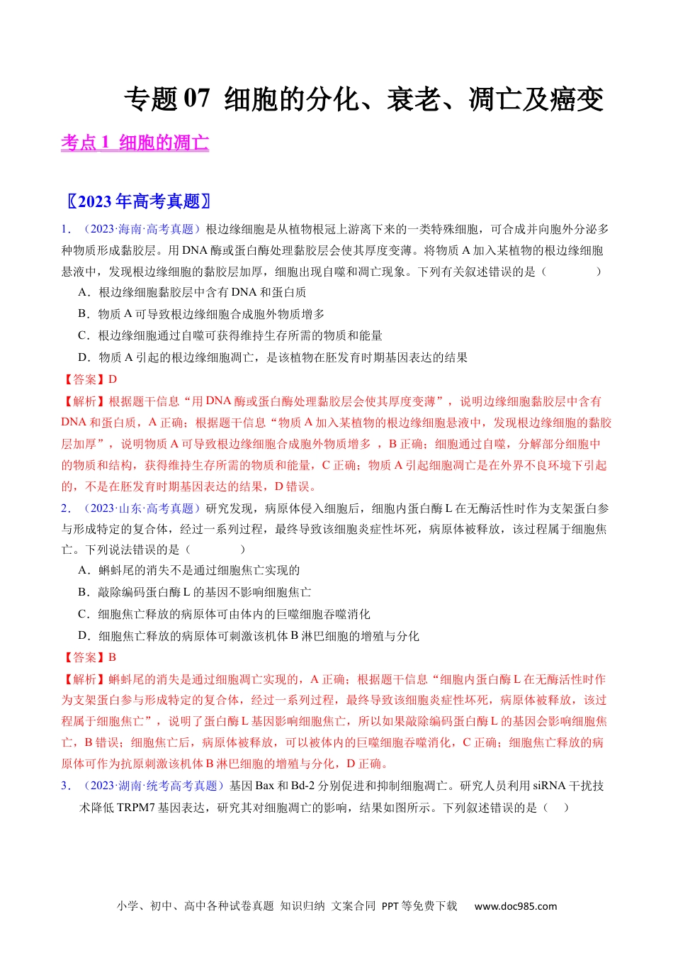 小学、初中、高中各种试卷真题知识归纳文案合同PPT等免费下载www.doc985.com专题07细胞的分化、衰老、凋亡及癌变考点1细胞的凋亡〖2023年高考真题〗1.(2023·海南·高考真题)根边缘细胞是从植物根冠上游离下来的一类特殊细胞,可合成并向胞外分泌多种物质形成黏胶层。用DNA酶或蛋白酶处理黏胶层会使其厚度变薄。将物质A加入某植物的根边缘细胞悬液中,发现根边缘细胞的黏胶层加厚,细胞出现自噬和凋亡现象。下列有关叙述错误的是()A.根边缘细胞黏胶层中含有DNA和蛋白质B.物质A可导致根边缘细胞合成胞外物质增多C.根边缘细胞通过自噬可获得维持生存所需的物质和能量D.物质A引起的根边缘细胞凋亡,是该植物在胚发育时期基因表达的结果【答案】D【解析】根据题干信息“用DNA酶或蛋白酶处理黏胶层会使其厚度变薄”,说明边缘细胞黏胶层中含有DNA和蛋白质,A正确;根据题干信息“物质A加入某植物的根边缘细胞悬液中,发现根边缘细胞的黏胶层加厚”,说明物质A可导致根边缘细胞合成胞外物质增多,B正确;细胞通过自噬,分解部分细胞中的物质和结构,获得维持生存所需的物质和能量,C正确;物质A引起细胞凋亡是在外界不良环境下引起的,不是在胚发育时期基因表达的结果,D错误。2.(2023·山东·高考真题)研究发现,病原体侵入细胞后,细胞内蛋白酶L在无酶活性时作为支架蛋白参与形成特定的复合体,经过一系列过程,最终导致该细胞炎症性坏死,病原体被释放,该过程属于细胞焦亡。下列说法错误的是()A.蝌蚪尾的消失不是通过细胞焦亡实现的B.敲除编码蛋白酶L的基因不影响细胞焦亡C.细胞焦亡释放的病原体可由体内的巨噬细胞吞噬消化D.细胞焦亡释放的病原体可刺激该机体B淋巴细胞的增殖与分化【答案】B【解析】蝌蚪尾的消失是通过细胞凋亡实现的,A正确;根据题干信息“细胞内蛋白酶L在无酶活性时作为支架蛋白参与形成特定的复合体,经过一系列过程,最终导致该细胞炎症性坏死,病原体被释放,该过程属于细胞焦亡”,说明了蛋白酶L基因影响细胞焦亡,所以如果敲除编码蛋白酶L的基因会影响细胞焦亡,B错误;细胞焦亡后,病原体被释放,可以被体内的巨噬细胞吞噬消化,C正确;细胞焦亡释放的病原体可作为抗原刺激该机体B淋巴细胞的增殖与分化,D正确。3.(2023·湖南·统考高考真题)基因Bax和Bd-2分别促进和抑制细胞凋亡。研究人员利用siRNA干扰技术降低TRPM7基因表达,研究其对细胞凋亡的影响,结果如图所示。下列叙述错误的是()小学、初中、高中各种试卷真题知识归纳文案合同PPT等免费下载www.doc985.comA.细胞衰老和细胞凋亡都受遗传信息的调控B.TRPM7基因可能通过抑制Bax基因的表达来抑制细胞凋亡C.TRPM7基因可能通过促进Bcl-2基因的表达来抑制细胞凋亡D.可通过特异性促进癌细胞中TRPM7基因的表达来治疗相关癌症【答案】D【详解】A、细胞衰老和细胞凋亡都是由基因控制的细胞正常的生命活动,都受遗传信息的调控,A正确;B、据题图可知,siRNA干扰TRPM7基因实验组的TRPM7基因表达量下降,Bax基因表达量增加,细胞凋亡率增加,由此可以得出,TRPM7基因可能通过抑制Bas基因的表达来抑制细胞凋亡,B正确;C、siRNA干扰TRPM7基因实验组细胞凋亡率高,Bcl-2基因表达量降低,而Bcl-2基因抑制细胞凋亡,故TRPM7基因可能通过促进Bel-2基因的表达来抑制细胞凋亡,C正确;D、由题图可知,siRNA干扰TRPM7基因实验组,Bax基因表达量增加,Bdl-2基因表达量减少,细胞凋亡率增加,所以可以通过抑制癌细胞中TRPM7基因表达来治疗相关癌症,D错误。故选D。4.(2023·广东·统考高考真题)放射性心脏损伤是由电离辐射诱导的大量心肌细胞凋亡产生的心脏疾病。一项新的研究表明,circRNA可以通过miRNA调控P基因表达进而影响细胞凋亡,调控机制见图。miRNA是细胞内一种单链小分子RNA,可与mRNA靶向结合并使其降解。circRNA是细胞内一种闭合环状RNA,可靶向结合miRNA使其不能与mRNA结合,从而提高mRNA的翻译水平。回答下列问题:(1)放射刺激心肌细胞产生的_________会攻击生物膜的磷脂分子,导致放射性心肌损伤。(2)前体mRNA是通过_________酶以DNA的一条链为模板合成的,可被剪切成circ...