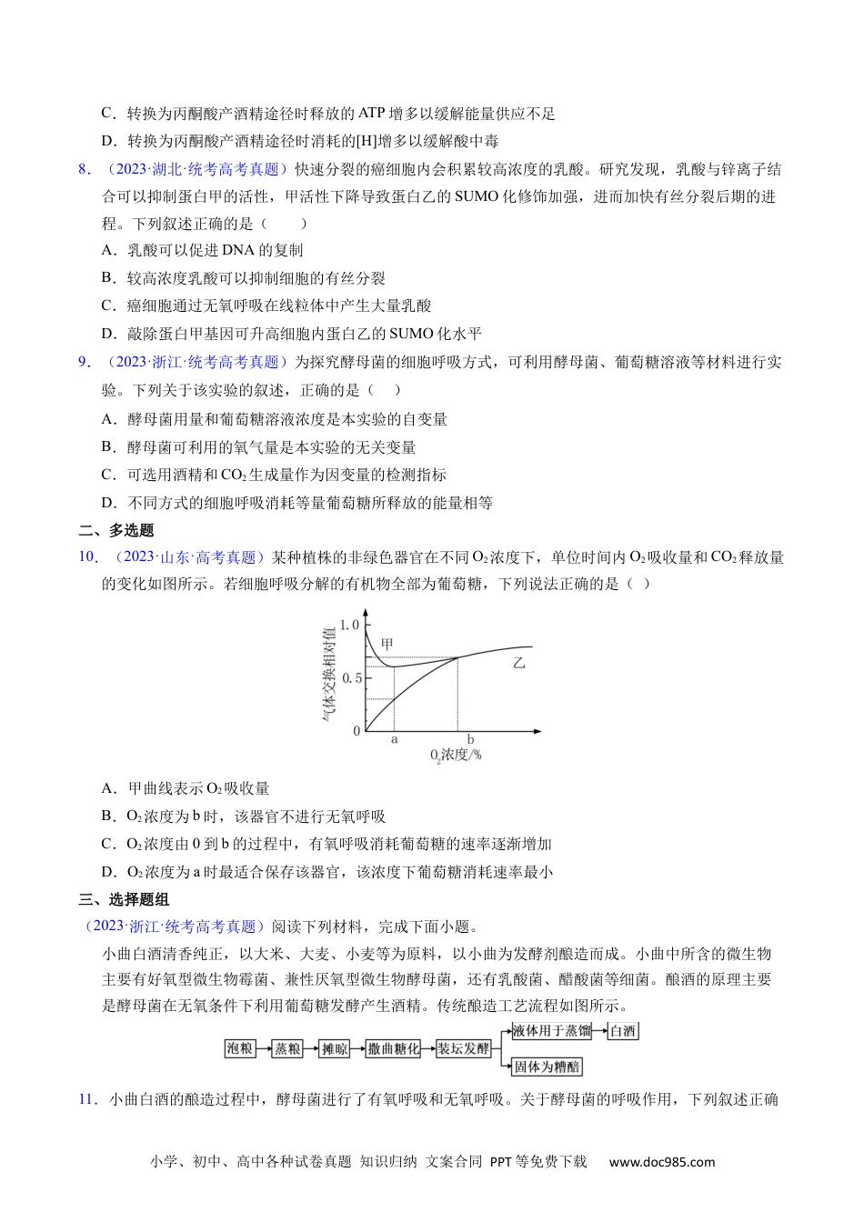 小学、初中、高中各种试卷真题知识归纳文案合同PPT等免费下载www.doc985.com专题05细胞呼吸与光合作用考点1细胞呼吸的过程、影响因素与应用〖2023年高考真题〗1.(2023·全国·统考高考真题)植物可通过呼吸代谢途径的改变来适应缺氧环境。在无氧条件下,某种植物幼苗的根细胞经呼吸作用释放CO2的速率随时间的变化趋势如图所示。下列相关叙述错误的是()A.在时间a之前,植物根细胞无CO2释放,只进行无氧呼吸产生乳酸B.a~b时间内植物根细胞存在经无氧呼吸产生酒精和CO2的过程C.每分子葡萄糖经无氧呼吸产生酒精时生成的ATP比产生乳酸时的多D.植物根细胞无氧呼吸产生的酒精跨膜运输的过程不需要消耗ATP2.(2023·山西·统考高考真题)我国劳动人民在漫长的历史进程中,积累了丰富的生产、生活经验,并在实践中应用。生产和生活中常采取的一些措施如下。①低温储存,即果实、蔬菜等收获后在低温条件下存放②春化处理,即对某些作物萌发的种子或幼苗进行适度低温处理③风干储藏,即小麦、玉米等种子收获后经适当风干处理后储藏④光周期处理,即在作物生长的某一时期控制每天光照和黑暗的相对时长⑤合理密植,即栽种作物时做到密度适当,行距、株距合理⑥间作种植,即同一生长期内,在同一块土地上隔行种植两种高矮不同的作物关于这些措施,下列说法合理的是()A.措施②④分别反映了低温和昼夜长短与作物开花的关系B.措施③⑤的主要目的是降低有机物的消耗C.措施②⑤⑥的主要目的是促进作物的光合作用D.措施①③④的主要目的是降低作物或种子的呼吸作用强度3.(2023·湖北·统考高考真题)为探究环境污染物A对斑马鱼生理的影响,研究者用不同浓度的污染物A溶液处理斑马鱼,实验结果如下表。据结果分析,下列叙述正确的是()A物质浓度(μg·L-1)01050100小学、初中、高中各种试卷真题知识归纳文案合同PPT等免费下载www.doc985.com指标①肝脏糖原含量(mg·g-1)25.0±0.612.1±0.712.0±0.711.1±0.2②肝脏丙酮酸含量(nmol·g-1)23.6±0.717.5±0.215.7±0.28.8±0.4③血液中胰高血糖素含量(mIU·mg·prot-1)43.6±1.787.2±1.8109.1±3.0120.0±2.1A.由②可知机体无氧呼吸减慢,有氧呼吸加快B.由①可知机体内葡萄糖转化为糖原的速率加快C.①②表明肝脏没有足够的丙酮酸来转化成葡萄糖D.③表明机体生成的葡萄糖增多,血糖浓度持续升高4.(2023·广东·统考高考真题)在游泳过程中,参与呼吸作用并在线粒体内膜上作为反应物的是()A.还原型辅酶ⅠB.丙酮酸C.氧化型辅酶ⅠD.二氧化碳5.(2023·北京·统考高考真题)运动强度越低,骨骼肌的耗氧量越少。如图显示在不同强度体育运动时,骨骼肌消耗的糖类和脂类的相对量。对这一结果正确的理解是()A.低强度运动时,主要利用脂肪酸供能B.中等强度运动时,主要供能物质是血糖C.高强度运动时,糖类中的能量全部转变为ATPD.肌糖原在有氧条件下才能氧化分解提供能量6.(2023·湖南·统考高考真题)食品保存有干制、腌制、低温保存和高温处理等多种方法。下列叙述错误的是()A.干制降低食品的含水量,使微生物不易生长和繁殖,食品保存时间延长B.腌制通过添加食盐、糖等制造高渗环境,从而抑制微生物的生长和繁殖C.低温保存可抑制微生物的生命活动,温度越低对食品保存越有利D.高温处理可杀死食品中绝大部分微生物,并可破坏食品中的酶类7.(2023·山东·高考真题)水淹时,玉米根细胞由于较长时间进行无氧呼吸导致能量供应不足,使液泡膜上的H+转运减缓,引起细胞质基质内H+积累,无氧呼吸产生的乳酸也使细胞质基质pH降低。pH降低至一定程度会引起细胞酸中毒。细胞可通过将无氧呼吸过程中的丙酮酸产乳酸途径转换为丙酮酸产酒精途径,延缓细胞酸中毒。下列说法正确的是()A.正常玉米根细胞液泡内pH高于细胞质基质B.检测到水淹的玉米根有CO2的产生不能判断是否有酒精生成小学、初中、高中各种试卷真题知识归纳文案合同PPT等免费下载www.doc985.comC.转换为丙酮酸产酒精途径时释放的ATP增多以缓解能量供应不足D.转换为丙酮酸产酒精途径时消耗的[H]增多以缓解酸中毒8.(2023·...