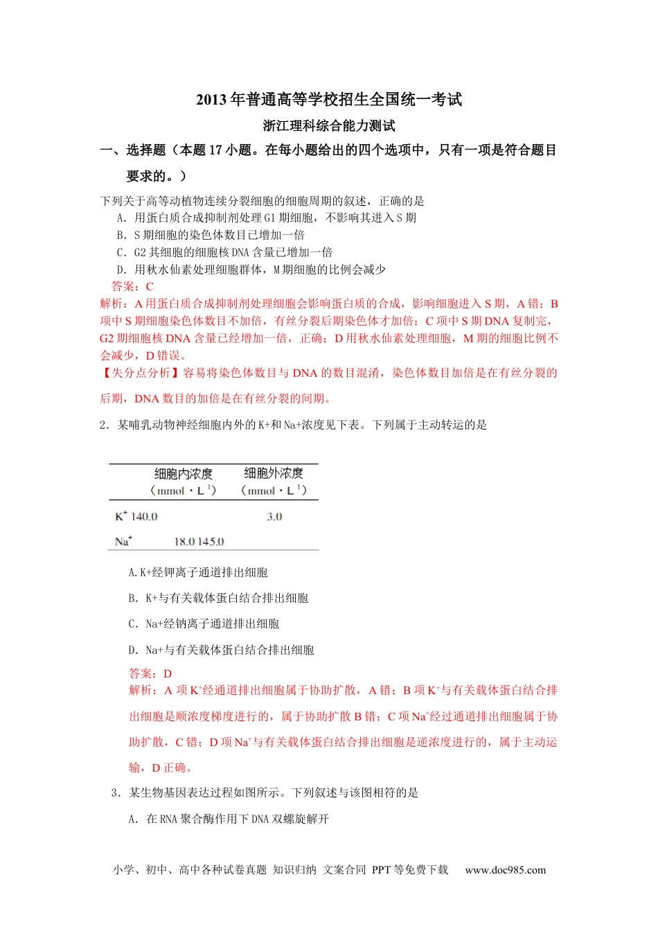 小学、初中、高中各种试卷真题知识归纳文案合同PPT等免费下载www.doc985.com2013年普通高等学校招生全国统一考试浙江理科综合能力测试一、选择题(本题17小题。在每小题给出的四个选项中,只有一项是符合题目要求的。)下列关于高等动植物连续分裂细胞的细胞周期的叙述,正确的是A.用蛋白质合成抑制剂处理G1期细胞,不影响其进入S期B.S期细胞的染色体数目已增加一倍C.G2其细胞的细胞核DNA含量已增加一倍D.用秋水仙素处理细胞群体,M期细胞的比例会减少答案:C解析:A用蛋白质合成抑制剂处理细胞会影响蛋白质的合成,影响细胞进入S期,A错;B项中S期细胞染色体数目不加倍,有丝分裂后期染色体才加倍;C项中S期DNA复制完,G2期细胞核DNA含量已经增加一倍,正确;D用秋水仙素处理细胞,M期的细胞比例不会减少,D错误。【失分点分析】容易将染色体数目与DNA的数目混淆,染色体数目加倍是在有丝分裂的后期,DNA数目的加倍是在有丝分裂的间期。2.某哺乳动物神经细胞内外的K+和Na+浓度见下表。下列属于主动转运的是A.K+经钾离子通道排出细胞B.K+与有关载体蛋白结合排出细胞C.Na+经钠离子通道排出细胞D.Na+与有关载体蛋白结合排出细胞答案:D解析:A项K+经通道排出细胞属于协助扩散,A错;B项K+与有关载体蛋白结合排出细胞是顺浓度梯度进行的,属于协助扩散B错;C项Na+经过通道排出细胞属于协助扩散,C错;D项Na+与有关载体蛋白结合排出细胞是逆浓度进行的,属于主动运输,D正确。3.某生物基因表达过程如图所示。下列叙述与该图相符的是A.在RNA聚合酶作用下DNA双螺旋解开小学、初中、高中各种试卷真题知识归纳文案合同PPT等免费下载www.doc985.comB.DNA-RNA杂交区域中A应与T配对C.mRNA翻译只能得到一条肽链D.该过程发生在真核细胞中答案:A解析:A项RNA聚合酶可以将原核生物DNA双螺旋解开,A正确;B项DNA-RNA杂交区域中A应该与U配对,B错误;C项从图中可以看出mRNA翻译能得到多条肽链,C错误;D项转录和翻译的过程是同时进行的,只能发生在原核生物中D,错误。4.下列关于出生率的叙述,正确的是A.若某一种群年初时的个体数为100,年末时为110,其中新生个体数为20,死亡个体数为10,则该种群的年出生率为10%B.若某动物的婚配制为一雌一雄,生殖期个体的雌雄比例越接近1:1,则出生率越高C.若通过调控环境条件,使某动物的性成熟推迟,则出生率会更高D.若比较三种年龄结构类型的种群,则稳定型的出生率最高答案:B解析:A项中出生率为20/110=2/11,A错误;B项雌雄比例接近1:1且婚配制度为一雌一雄,出生率比较高,B正确;C项性成熟推迟,出生率会降低,C错误;D项增长型的出生率最高,D错误。5.光照、赤霉素和赤霉素合成抑制剂对某种植物茎伸长影响的实验结果如图所示。下列叙述正确的是小学、初中、高中各种试卷真题知识归纳文案合同PPT等免费下载www.doc985.comA.茎伸长受抑制均由赤霉素合成抑制剂引起B.赤霉素是影响茎伸长的主要因素之一C.植物茎伸长与光照时间无关D.该植物是赤霉素缺失突变体答案:B解析:A茎的伸长与赤霉素、赤霉素合成抑制剂、光照等几个因素都有关系,A错误;B没有赤霉素或者加入赤霉素合成抑制剂的植株的茎都比较短,所以B正确;C根据第1组和第4组的数据可以分析出光照对茎的伸长影响较大,C错误;D根据第4组和第5组的数据分析该植物并不缺少赤霉素,D错误。6.实验小鼠皮肤细胞培养(非克隆培养)的基本过程如图所示。下列叙述错误的是A.甲过程需要对实验小鼠进行消毒B.乙过程对皮肤组织可用胰蛋白酶消化C.丙过程得到的细胞大多具有异倍体核型D.丁过程得到的细胞具有异质性案:C解析:A进行细胞培养前需要对细胞进行消毒,A正确;B进行培养的组织细胞用胰蛋白酶消化分散成单个细胞,B正确;C丙过程属于原代培养,细胞的核型稳定,C错误;D丁过程属于传代培养,期间部分细胞会出现异质性,D正确;30.(14分)为研究某植物对盐的耐受性,进行了不同盐浓度对其最大光合速率、呼吸速率及根相对电导率影响的实验,结果见下表。小学、初中、高中各种试卷真题知识归纳文案合同PPT等免费下载www.doc985.com注:相对电导率表示处理细胞与正常细...