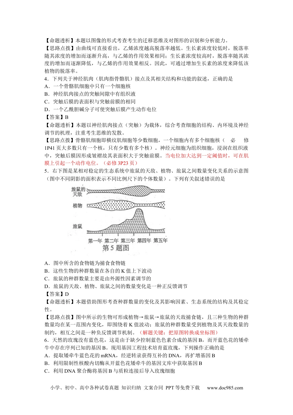 小学、初中、高中各种试卷真题知识归纳文案合同PPT等免费下载www.doc985.com浙江卷参考答案:1.C2.A3.D4.B5.D6.A30.(14分)(1)光合作用运输(2)B气孔开度降低,CO2吸收减少(答出一项即可)(3)叶绿素合成速度变慢或停止(或叶绿素分解),类胡萝卜素的颜色显露出来(答出一项即可)NADPH和ATP(4)脱落酸31.(12分)(1)①A组:培养液中加入体细胞。B组:培养液中加入体细胞,加入W。C组:培养液中加入癌细胞。D组:培养液中加入癌细胞,加入W。②胰蛋白酶④统计并分析所得数据。(其它合理答案均可)(2)(其它合理答案均可)32.(18分)(1)表达有害性基因突变(2)诱变育种基因重组胚状体(3)4(4)小学、初中、高中各种试卷真题知识归纳文案合同PPT等免费下载www.doc985.com2012年普通高等学校招生全国统一考试理综生物部分(浙江卷)1.人体肝细胞内CO2分压和K+浓度高于细胞外,而O2分压和Na+浓度低于细胞外,上述四种物质中通过主动转运进入该细胞的是A.CO2B.O2C.K+D.Na+【答案】C【命题透析】本题考查物质跨膜运输的方式。【思路点拨】可通过肝细胞内外各物质的浓度的关系来迅速作出判断,K+逆浓度从细胞外进入到细胞内部,其跨膜运输的方式为主动运输。审题关键词:“主动转运进入”Na+是出2.下列关于高等哺乳动物受精与胚胎发育的叙述,正确的是A.绝大多数精卵细胞的识别具有物种特异性B.卵裂球细胞的体积随分裂次数增加而不断增大C.囊胚的滋养层细胞具有发育全能性D.原肠胚发育分化形成内外两个胚层【答案】A【命题透析】本题结合受精作用及早期胚胎的发育综合考查胚胎工程。【思路点拨】同种动物精子、卵细胞表面存在的特异性受体蛋白,决定了只有同种动物精卵才能结合;受精卵随着分裂的进行,其细胞的体积在逐渐变小,囊胚期的细胞开始出现分化,其外表的一层细胞即滋养层,将发育成胚胎的附属结构或胚外结构(如胚盘P42页),不具有发育的全能性;囊胚可继续分化为具有三个胚层的原肠胚。3.不同浓度的生长素影响某植物乙烯生成和成熟叶片脱落的实验结果如图所示。下列有关叙述正确的是A.乙烯浓度越高脱落率越高B.脱落率随生长素和乙烯浓度增加而不断提高C.生长素和乙烯对叶片脱落的作用是相互对抗的D.生产上可喷施较高浓度生长素类似物降低脱落率【答案】D小学、初中、高中各种试卷真题知识归纳文案合同PPT等免费下载www.doc985.com【命题透析】本题以图像的形式考查考生的迁移思维及对图形的识别和分析能力。【思路点拨】由曲线可直接看出,乙烯浓度越高脱落率越低。生长素浓度较低时,脱落率随其浓度的增加而逐渐升高,与乙烯的作用效果相同;生长素浓度较高时,脱落率随其浓度的增加而逐渐降低,与乙烯的作用效果相反。因此,可通过增加生长素的浓度来降低该植物的脱落率。4.下列关于神经肌肉(肌肉指骨骼肌)接点及其相关结构和功能的叙述,正确的是A.一个骨骼肌细胞中只有一个细胞核B.神经肌肉接点的突触间隙中有组织液C.突触后膜的表面积与突触前膜的相同D.一个乙酰胆碱分子可使突触后膜产生动作电位【答案】B【命题透析】本题以神经肌肉接点(突触)为载体,综合考查细胞的结构、内环境及神经调节的机理,注重考生思维的发散。【思路点拨】骨骼肌细胞即横纹肌细胞等少数细胞,一个细胞内有多个细胞核(必修1P41页大多数只有一个核,只有少数有多个核)。神经元细胞为组织细胞,浸润在组织液中,突触后膜因形成皱褶故其表面积大于突触前膜。当电位加大达到一定阈值时,可在肌膜上引起一个动作电位。(必修3P23页)5.右下图是某相对稳定的生态系统中旅鼠的天敌、植物、旅鼠之间数量变化关系的示意图(图中不同阴影的面积表示不同比例尺下的个体数量)。下列有关叙述错误的是A.图中所含的食物链为捕食食物链B.这些生物的种群数量在各自的K值上下波动C.旅鼠的种群数量主要是由外源性因素调节的D.旅鼠的天敌、植物、旅鼠之间的数量变化是一种正反馈调节【答案】D【命题透析】本题借助图形考查种群数量的变化及其影响因素、生态系统的结构及其稳定性。【思路点拨】图中所示的生物可形成植物→旅鼠→旅鼠的天敌捕食链,...