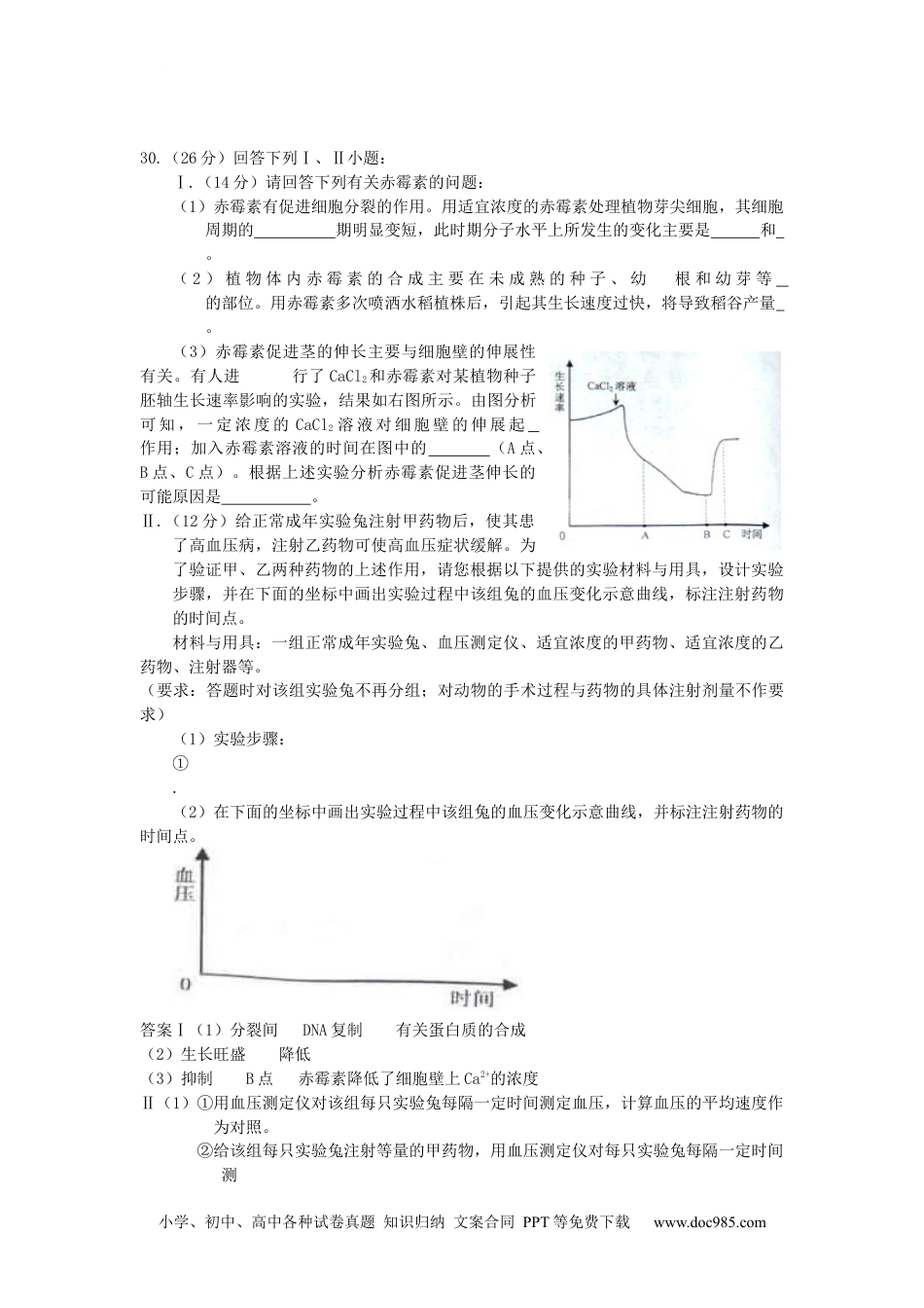 小学、初中、高中各种试卷真题知识归纳文案合同PPT等免费下载www.doc985.com2009年浙江省高考理综生物试题一、选择题(本题共17小题。在每小题给出的四个选项中,只有一项是符合题目要求的。)1.用动、植物成体的体细胞进行离体培养,下列叙述正确的是A.都需用CO2培养箱B.都须用液体培养基C.都要在无菌条件下进行D.都可体现细胞的全能性答案C【解析】动、植物成体的体细胞进行离体培养都要在无菌条件下进行,动物成体的体细胞离体培养用液体培养基,不能体现细胞的全能性,植物成体的体细胞离体培养不一定用液体培养基,能体现细胞的全能性。故C正确。2.破伤风梭状芽孢杆菌侵入了人体深部的组织细胞并大量繁殖,下列关于该菌的细胞呼吸类型和消灭该菌首先要通过的免疫途径的叙述,正确的是A.无氧呼吸和体液免疫B.无氧呼吸和细胞免疫C.有氧呼吸和体液免疫D.有氧呼吸和细胞免疫答案B【解析】破伤风梭状芽孢杆菌侵入了人体深部的组织细胞并大量繁殖,可见该菌的细胞呼吸类型是无氧呼吸,消灭该菌首先要通过细胞免疫的途径。故选B。3.下列关于基因工程的叙述,错误的是A.目的基因和受体细胞均可来自动、植物或微生物B.限制性核算内切酶和DNA连接酶是两类常用的工具酶C.人胰岛素原基因在大肠杆菌中表达的胰岛素原无生物活性D.载体上的抗性基因有利于筛选含重组DNA的细胞和促进目的基因的表达答案D【解析】基因工程中目的基因和受体细胞均可来自动、植物或微生物;常用的工具酶是限制性核酸内切酶和DNA连接酶;人胰岛素原基因在大肠杆菌中表达的胰岛素原无生物活性,只有经过一定的物质激活以后,才有生物活性。载体上的抗性基因主要是有利于筛选含重组DNA的细胞,不能促进目的基因的表达。所以D错误。4.下列关于植物光合作用和细胞呼吸的叙述,正确的是A.无氧和零下低温环境有利于水果的保鲜B.CO2的固定过程发生在叶绿体中,C6H12O6分解成CO2的过程发生在线粒体中C.光合作用过程中光能转变为化学能,细胞呼吸过程中化学能转变为热能和ATPD.夏季连续阴天,大棚中白天适当增加光照,夜晚适当降低温度,可提高作物产量答案D【解析】无氧时细胞会进行无氧呼吸,产生酒精对细胞有毒害作用,零下低温环境会使细胞中的水结冰,破坏水果的营养成分,达不到保鲜的目的。CO2的固定过程发生在叶绿体中,C6H12O6分解发生在细胞质基质中,CO2的生成在线粒体中;光合作用过程中光能转变为化学能,细胞呼吸过程中化学能转变为热能、ATP中的化学能以及其他形式的能(如电能、光能等);夏季连续阴天,大棚中白天适当增加光照(提高光合作用的强度)小学、初中、高中各种试卷真题知识归纳文案合同PPT等免费下载www.doc985.com夜晚适当降低温度(降低酶的活性,从而降低呼吸消耗),以利于作物产量的提高。故D正确。5.对某动物细胞进行荧光标记实验,如下示意图所示,其基本过程:①用某种荧光材料标记该动物细胞,细胞表面出现荧光斑点。②用激光束照射该细胞表面的某一区域,该区域荧光淬灭(消失)。③停止激光束照射一段时间后,该区域的荧光逐渐恢复,即有出现了斑点。上述实验不能说明的是A.细胞膜具有流动性B.荧光染料能与细胞膜组成成分结合C.根据荧光恢复的速率可推算出物质跨膜运输的速率D.根据荧光恢复的速率可推算出膜中蛋白质或脂质的流动速率答案C【解析】该过程说明细胞膜具有流动性、荧光染料能与细胞膜组成成分结合,根据荧光恢复的速率可推算出膜中蛋白质或脂质的流动速率,但不能根据荧光恢复的速率可推算出物质跨膜运输的速率,因为该过程中没有发生物质跨膜运输。所以C不正确。6.经调查,某生态系统中Y、X、Z分别为第一、第二和第三营养级,每个营养级不同物种的个体数量如图甲所示(图中每一柱条代表一个物种)。一段时间后个体数量发生变化,结果如图乙所示。图甲图乙下列叙述正确的是A.X营养级的生物被捕食的压力明显增加B.Z营养级生物个体数量的增加是由捕食对象专一引起的C.Y营养级生物个体数量的变化是由于捕食者对捕食对象有选择的结果D.X营养级的生物之间存在明显的竞争关系,且其中某种生物处于竞争劣势答案A【解析】生物个体数量的变化受气...