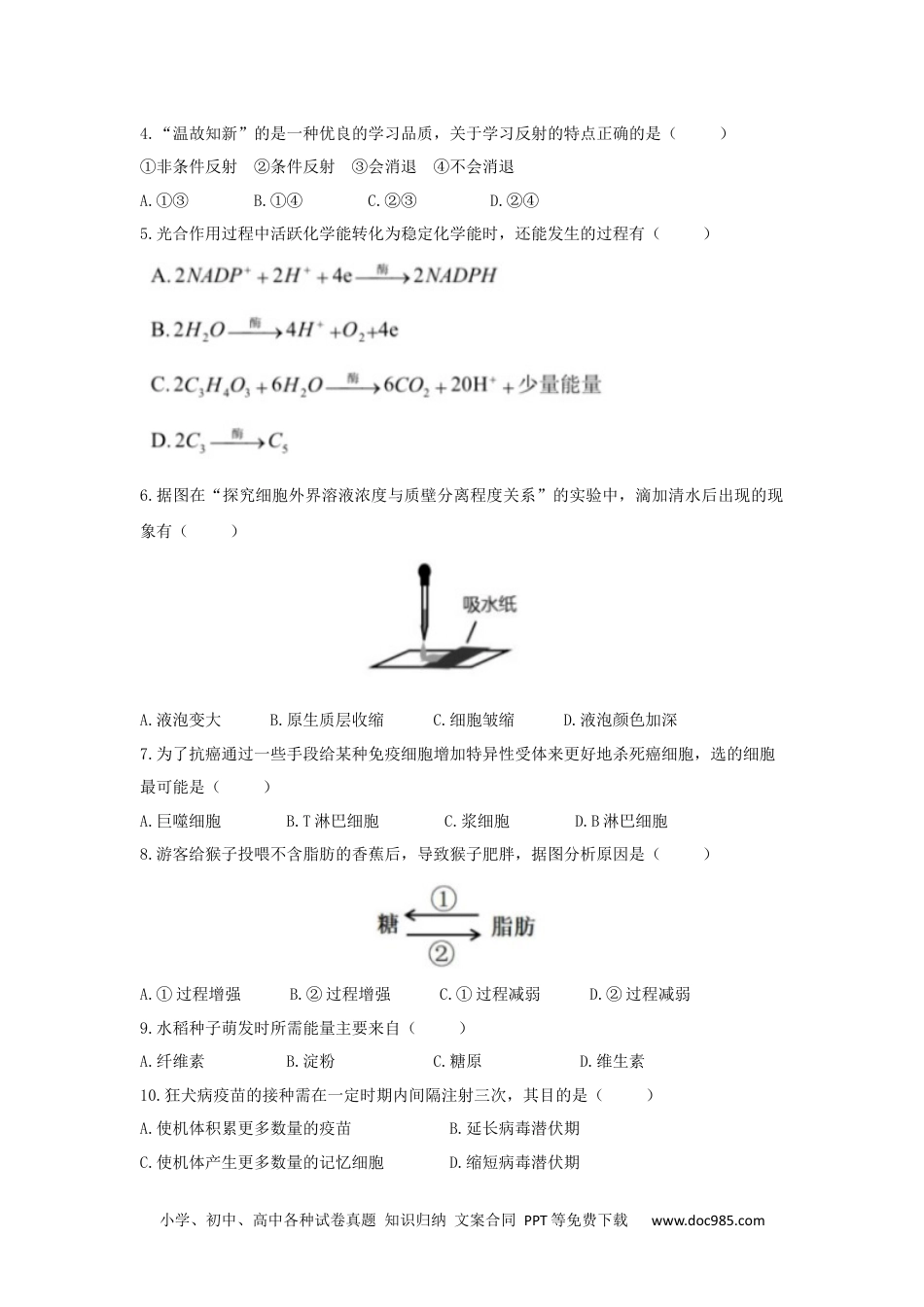 小学、初中、高中各种试卷真题知识归纳文案合同PPT等免费下载www.doc985.com2021年上海市普通高中学业水平等级性考试生物试卷考生注意:1.本试卷满分100分,考试时间60分钟。2.本考试设试卷和答题纸两部分,试卷包括试题与答题要求;所有答题必须涂(选择题)或写(综合题)在答题纸上;做在试卷上一律不得分。3.答题前,考生务必在答题纸上用钢笔或圆珠笔清楚填写姓名、准考证号,并将核对后的条形码贴在指定位置上。4.答题纸与试卷在试题编号上是一一对应的,答题时应特别注意,不能错位。一、选择题(共40分,每小题2分,每小题只有一个正确答案)1.小萌清晰观察到蚕豆叶下表皮细胞如图1,想进一步观察视野中央的细胞,他需要进行的第一步操作是()A.转动转换器B.调节细调节器C.调节粗调节器D.移动玻片2.鸭子毛色有黑色、白色等多种,这体现了()A.生态多样性B.物种多样性C.遗传多样性D.生境多样性3.据下图分析胆固醇转化为胆固醇酯的过程的反应类型为()A.合成反应B.水解反应C.氧化分解反应D.转氨基作用小学、初中、高中各种试卷真题知识归纳文案合同PPT等免费下载www.doc985.com4.“温故知新”的是一种优良的学习品质,关于学习反射的特点正确的是()①非条件反射②条件反射③会消退④不会消退A.①③B.①④C.②③D.②④5.光合作用过程中活跃化学能转化为稳定化学能时,还能发生的过程有()6.据图在“探究细胞外界溶液浓度与质壁分离程度关系”的实验中,滴加清水后出现的现象有()A.液泡变大B.原生质层收缩C.细胞皱缩D.液泡颜色加深7.为了抗癌通过一些手段给某种免疫细胞增加特异性受体来更好地杀死癌细胞,选的细胞最可能是()A.巨噬细胞B.T淋巴细胞C.浆细胞D.B淋巴细胞8.游客给猴子投喂不含脂肪的香蕉后,导致猴子肥胖,据图分析原因是()A.①过程增强B.②过程增强C.①过程减弱D.②过程减弱9.水稻种子萌发时所需能量主要来自()A.纤维素B.淀粉C.糖原D.维生素10.狂犬病疫苗的接种需在一定时期内间隔注射三次,其目的是()A.使机体积累更多数量的疫苗B.延长病毒潜伏期C.使机体产生更多数量的记忆细胞D.缩短病毒潜伏期小学、初中、高中各种试卷真题知识归纳文案合同PPT等免费下载www.doc985.com11.马拉松运动后大量饮用清水会出现的现象是()A.细胞内液渗透压降低B.细胞外液渗透压降低C.细胞内液含量降低D.细胞外液含量降低12.诺如病毒危害性极大,经检测病毒的遗传物质中含有核糖,该病毒含有的基因有()①衣壳蛋白基因②RNA复制酶基因③核糖体蛋白基因④特异性入侵宿主细胞的表面蛋白基因A.①②③B.②③④C.①②④D.①③④13.图为初级精母细胞的染色体组成,则该细胞分裂形成的次级精母细胞的染色体组成可能为()A.1、1'和2、2’B.1、2和3、4C.3、3’和4、4’D.2、2’和4、4’14.下列图示过程能正确表示单链RNA逆转录过程的是()15.颤藻和水绵都是绿色丝状水生生物,将它们放在同一块载玻片上染色后用光学显微镜的高倍镜观察,确认丝状物是水绵的依据是()A.叶绿体B.细胞膜C.细胞壁D.核糖体16.流浪蚁是一种生活在热带的极具危险的入侵物种,由于商贸活动入侵到温带,形成入侵物种,在温带形成的种群基因库变化趋势为()A.持续增大B.持续减小C.先减小后稳定D.先增大后稳定17.原产欧洲南部喷瓜的性别不是由性染色体决定,而是由3个复等位基因aD>a+>ad决定的,其中,aD决定雄性、a+决定两性、ad决定雌性植株,雌花亲本接受哪种基因型个体的花粉子代雌花所占比例最大()小学、初中、高中各种试卷真题知识归纳文案合同PPT等免费下载www.doc985.comA.aDaDB.aDa+C.aDadD.adad18.在a、b、c、d条件下,测得酵母菌呼吸时CO2和O2体积变化的相对值如表。若底物是葡萄糖,下列关于d条件的叙述中正确是()条件abcdCO2释放量77710O2吸收量7777A.有氧呼吸加快B.无氧呼吸加快C.有氧呼吸减慢D.无氧呼吸减慢19.d为隐性基因,决定螺壳左旋,D为显性基因,决定螺壳右旋,两只田螺,母本为dd,父本为DD,子代表现型受母本基因型控制,已知F1代皆为左旋,F1自交后代的表现型比例为()A.全左旋B.右旋:左旋=3:1C.全右旋D.右旋:左旋=1:320.小麦密植容易出现黄叶,通过合理密植后...
