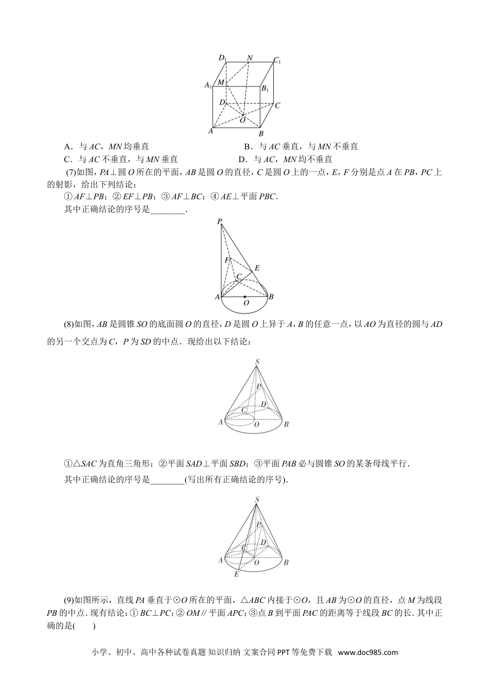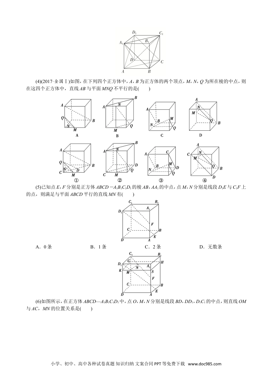 专题03立体几何中空间线、面位置关系的判定(2)【方法总结】判断与空间位置关系有关命题真假的方法(1)借助空间线面平行、面面平行、线面垂直、面面垂直的判定定理和性质定理进行判断.(2)借助空间几何模型,如从长方体模型、四面体模型等模型中观察线面位置关系,结合有关定理,进行肯定或否定.(3)借助于反证法,当从正面入手较难时,可利用反证法,推出与题设或公认的结论相矛盾的命题,进而作出判断.【例题选讲】[例1](1)以下四个命题中,①不共面的四点中,其中任意三点不共线;②若点A,B,C,D共面,点A,B,C,E共面,则点A,B,C,D,E共面;③若直线a,b共面,直线a,c共面,则直线b,c共面;④依次首尾相接的四条线段必共面.正确命题的个数是()A.0B.1C.2D.3(2)(2019·全国Ⅲ)如图,点N为正方形ABCD的中心,△ECD为正三角形,平面ECD⊥平面ABCD,M是线段ED的中点,则()A.BM=EN,且直线BM,EN是相交直线B.BM≠EN,且直线BM,EN是相交直线C.BM=EN,且直线BM,EN是异面直线D.BM≠EN,且直线BM,EN是异面直线(3)(多选)在正方体ABCD-A1B1C1D1中,下列直线或平面与平面ACD1平行的是()A.直线A1BB.直线BB1C.平面A1DC1D.平面A1BC1小学、初中、高中各种试卷真题知识归纳文案合同PPT等免费下载www.doc985.com(4)(2017·全国Ⅰ)如图,在下列四个正方体中,A,B为正方体的两个顶点,M,N,Q为所在棱的中点,则在这四个正方体中,直线AB与平面MNQ不平行的是()(5)已知点E,F分别是正方体ABCD-A1B1C1D1的棱AB,AA1的中点,点M,N分别是线段D1E与C1F上的点,则满足与平面ABCD平行的直线MN有()A.0条B.1条C.2条D.无数条(6)如图所示,在正方体ABCD—A1B1C1D1中,点O,M,N分别是线段BD,DD1,D1C1的中点,则直线OM与AC,MN的位置关系是()小学、初中、高中各种试卷真题知识归纳文案合同PPT等免费下载www.doc985.comA.与AC,MN均垂直B.与AC垂直,与MN不垂直C.与AC不垂直,与MN垂直D.与AC,MN均不垂直(7)如图,PA⊥圆O所在的平面,AB是圆O的直径,C是圆O上的一点,E,F分别是点A在PB,PC上的射影,给出下列结论:①AF⊥PB;②EF⊥PB;③AF⊥BC;④AE⊥平面PBC.其中正确结论的序号是________.(8)如图,AB是圆锥SO的底面圆O的直径,D是圆O上异于A,B的任意一点,以AO为直径的圆与AD的另一个交点为C,P为SD的中点.现给出以下结论:①△SAC为直角三角形;②平面SAD⊥平面SBD;③平面PAB必与圆锥SO的某条母线平行.其中正确结论的序号是________(写出所有正确结论的序号).(9)如图所示,直线PA垂直于⊙O所在的平面,△ABC内接于⊙O,且AB为⊙O的直径,点M为线段PB的中点.现有结论:①BC⊥PC;②OM∥平面APC;③点B到平面PAC的距离等于线段BC的长.其中正确的是()小学、初中、高中各种试卷真题知识归纳文案合同PPT等免费下载www.doc985.comA.①②B.①②③C.①D.②③(10)(多选)已知四棱台ABCD-A1B1C1D1的上、下底面均为正方形,其中AB=2,A1B1=,AA1=BB1=CC1=2,则下列叙述中正确的是()A.该四棱台的高为B.AA1⊥CC1C.该四棱台的表面积为26D.该四棱台外接球的表面积为16π【对点精练】1.给出下列命题,其中正确的命题为________.(填序号)①如果线段AB在平面α内,那么直线AB在平面α内;②两个不同的平面可以相交于不在同一直线上的三个点A,B,C;③若三条直线a,b,c互相平行且分别交直线l于A,B,C三点,则这四条直线共面;④若三条直线两两相交,则这三条直线共面;⑤两组对边相等的四边形是平行四边形.2.在三棱柱ABC-A1B1C1中,E,F分别为棱AA1,CC1的中点,则在空间中与直线A1B1,EF,BC都相交的直线()A.不存在B.有且只有两条C.有且只有三条D.有无数条3.(多选)如图,在四面体A-BCD中,M,N,P,Q,E分别为AB,BC,CD,AD,AC的中点,则下列说法中正确的是()A.M,N,P,Q四点共面B.∠QME=∠CBDC.△BCD∽△MEQD.四边形MNPQ为梯形4.如图,在正方体ABCD-A1B1C1D1中,下列命题正确的是()A.AC与B1C是相交直线且垂直B.AC与A1D是异面直线且垂直C.BD1与BC是相交直线且垂直D.AC与BD1是异面直线且垂直5.如图所示的三棱柱ABC-A1B1C1中,过A1...