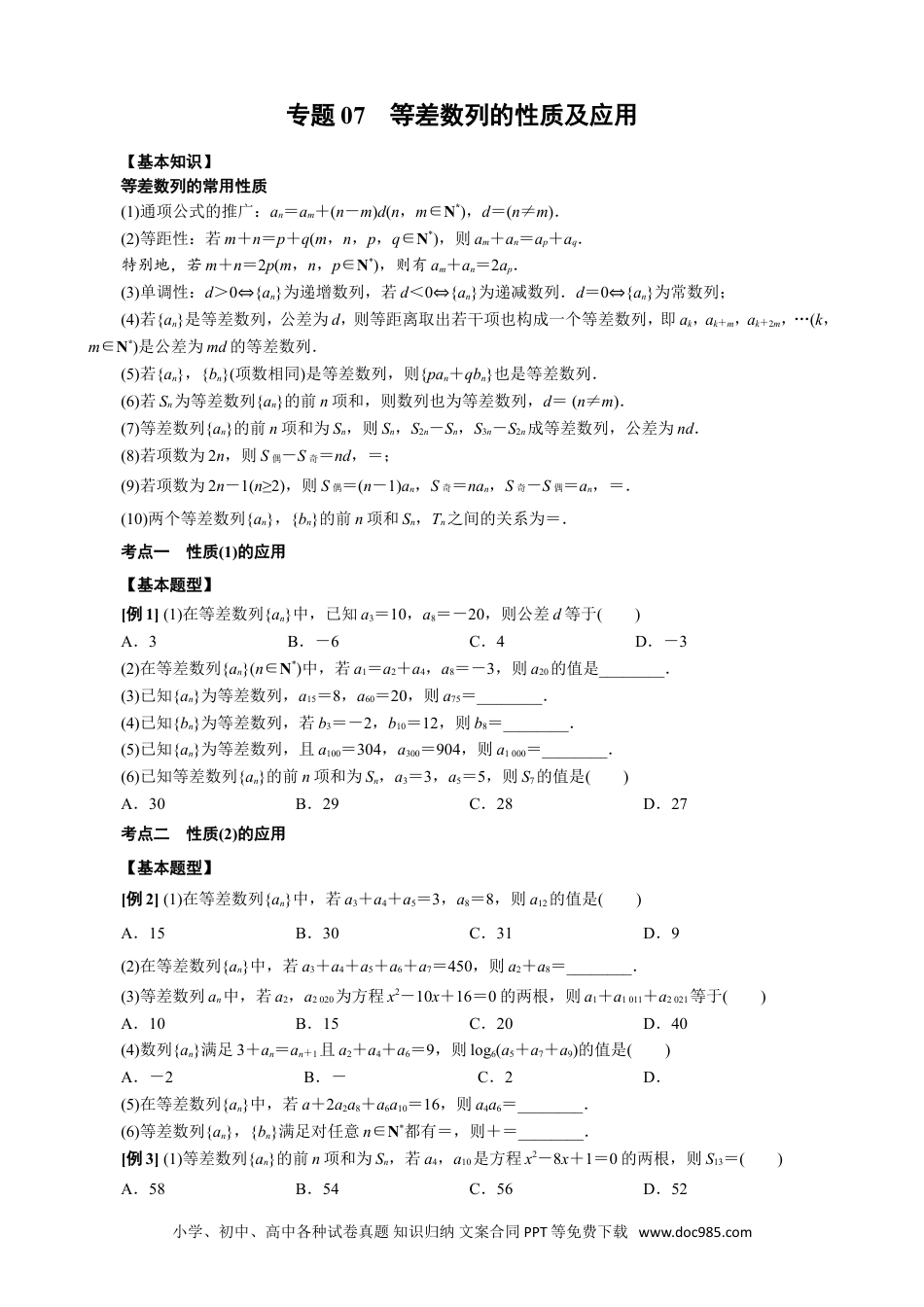 专题07等差数列的性质及应用【基本知识】等差数列的常用性质(1)通项公式的推广:an=am+(n-m)d(n,m∈N*),d=(n≠m).(2)等距性:若m+n=p+q(m,n,p,q∈N*),则am+an=ap+aq.特别地,若m+n=2p(m,n,p∈N*),则有am+an=2ap.(3)单调性:d>0⇔{an}为递增数列,若d<0⇔{an}为递减数列.d=0⇔{an}为常数列;(4)若{an}是等差数列,公差为d,则等距离取出若干项也构成一个等差数列,即ak,ak+m,ak+2m,…(k,m∈N*)是公差为md的等差数列.(5)若{an},{bn}(项数相同)是等差数列,则{pan+qbn}也是等差数列.(6)若Sn为等差数列{an}的前n项和,则数列也为等差数列,d=(n≠m).(7)等差数列{an}的前n项和为Sn,则Sn,S2n-Sn,S3n-S2n成等差数列,公差为nd.(8)若项数为2n,则S偶-S奇=nd,=;(9)若项数为2n-1(n≥2),则S偶=(n-1)an,S奇=nan,S奇-S偶=an,=.(10)两个等差数列{an},{bn}的前n项和Sn,Tn之间的关系为=.考点一性质(1)的应用【基本题型】[例1](1)在等差数列{an}中,已知a3=10,a8=-20,则公差d等于()A.3B.-6C.4D.-3(2)在等差数列{an}(n∈N*)中,若a1=a2+a4,a8=-3,则a20的值是________.(3)已知{an}为等差数列,a15=8,a60=20,则a75=________.(4)已知{bn}为等差数列,若b3=-2,b10=12,则b8=________.(5)已知{an}为等差数列,且a100=304,a300=904,则a1000=________.(6)已知等差数列{an}的前n项和为Sn,a3=3,a5=5,则S7的值是()A.30B.29C.28D.27考点二性质(2)的应用【基本题型】[例2](1)在等差数列{an}中,若a3+a4+a5=3,a8=8,则a12的值是()A.15B.30C.31D.9(2)在等差数列{an}中,若a3+a4+a5+a6+a7=450,则a2+a8=________.(3)等差数列an中,若a2,a2020为方程x2-10x+16=0的两根,则a1+a1011+a2021等于()A.10B.15C.20D.40(4)数列{an}满足3+an=an+1且a2+a4+a6=9,则log6(a5+a7+a9)的值是()A.-2B.-C.2D.(5)在等差数列{an}中,若a+2a2a8+a6a10=16,则a4a6=________.(6)等差数列{an},{bn}满足对任意n∈N*都有=,则+=________.[例3](1)等差数列{an}的前n项和为Sn,若a4,a10是方程x2-8x+1=0的两根,则S13=()A.58B.54C.56D.52小学、初中、高中各种试卷真题知识归纳文案合同PPT等免费下载www.doc985.com(2)等差数列{an}中,a1+a4+a7=39,a3+a6+a9=27,则数列{an}的前9项和S9等于()A.99B.66C.144D.297(3)设等差数列{an}的前n项和为Sn,已知前6项和为36,最后6项的和为180,Sn=324(n>6),则数列{an}的项数为________.(4)在等差数列{an}中,S10=100,S100=10,则S110=________.(5)已知函数y=f(x+1)的图象关于y轴对称,且函数f(x)在(1,+∞)上单调,若数列{an}是公差不为0的等差数列,且f(a4)=f(a18),则{an}的前21项和为()A.0B.C.21D.42(6)等差数列{an}的各项均不为零,其前n项和为Sn.若a=an+2+an,则S2n+1=________.(7)在数列{an}中,2an+1=an+an+2,且an≠0.若an-1-a+an+1=0(n≥2),且S2n-1=38,则n=()A.38B.20C.10D.9(8)设正项数列{an}的前n项和为Sn,且4Sn=(1+an)2(n∈N*),则a5+a6+a7+a8=()A.24B.48C.64D.72【对点精练】1.在等差数列{an}中,a4+a5=15,a7=12,则a2等于()A.3B.-3C.D.-2.已知等差数列{an}满足a1+a2+a3+…+a101=0,则有()A.a1+a101>0B.a1+a101<0C.a3+a99=0D.a51=513.已知数列{an}是等差数列,若a1-a9+a17=7,则a3+a15等于()A.7B.14C.21D.7(n-1)4.在等差数列{an}中,a1+3a8+a15=120,则a2+a14的值为()A.6B.12C.24D.485.已知等差数列{an},若a1+a2+a3+…+a12=21,则a2+a5+a8+a11=________.6.设数列{an}是等差数列,若a3+a4+a5=12,则a1+a2+…+a7等于()A.14B.21C.28D.357.在等差数列{an}中,若a4+a6+a8+a10+a12=120,则a9-a11的值为()A.14B.15C.16D.178.已知等差数列{an},{bn}的前n项和分别为Sn,Tn,若对于任意的自然数n,都有=,则+=()A.B.C.D.9.在等差数列{an}中,已知a4+a8=...