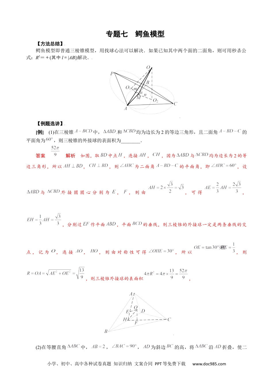 小学、初中、高中各种试卷真题知识归纳文案合同PPT等免费下载www.doc985.com专题七鳄鱼模型【方法总结】鳄鱼模型即普通三棱锥模型,用找球心法可以解决.如果已知其中两个面的二面角,则可用秒杀公式:R2=+(其中l=|AB|)解决.【例题选讲】[例](1)在三棱锥中,和均为边长为2的等边三角形,且二面角的平面角为,则三棱锥的外接球的表面积为________.答案解析如图,取中点,连接,,因为与均为边长为2的等边三角形,所以,,则为二面角的平面角,即,设与外接圆圆心分别为,,则由,可得,,分别过作平面,平面的垂线,则三棱锥的外接球一定是两条垂线的交点,记为,连接,,则由对称性可得,所以,则,则三棱锥外接球的表面积,(2)在等腰直角中,,,为斜边的高,将沿折叠,使二小学、初中、高中各种试卷真题知识归纳文案合同PPT等免费下载www.doc985.com面角为,则三棱锥的外接球的表面积为________.答案解析沿折叠后二面角为,即折叠后,所以为等边三角形,又因为,所以折叠后,设点为三棱锥外接球的球心,为的外心,所以,所以,又,所以球心半径,所以.(3)在四面体ABCD中,AB=AD=2,∠BAD=60°,∠BCD=90°,二面角A-BD-C的大小为150°,则四面体ABCD外接球的半径为________.答案解析因为∠BCD=90°,所以BC⊥CD,设BD的中点为O2,则O2为△BCD外接圆的圆心,由AB=AD=2,∠BAD=60°知,△ABD为等边三角形,设△ABD的外接圆的圆心为O1,连接AO2,则O1在线段AO2上,过O1,O2分别作平面ABD与平面BDC的垂线,交于点O,则O为四面体ABCD外接球的球心,过O2在平面BCD内作O2E⊥BD,交DC于点E,则∠AO2E=150°,所以∠AO2O=60°,又O1O2=,所以OO1=1,连接OA,又AO1=,所以OA===.(3)在三棱锥S-ABC中,AB⊥BC,AB=BC=,SA=SC=2,二面角S-AC-B的余弦值是-,若S,A,B,C都在同一球面上,则该球的表面积是()A.4πB.6πC.8πD.9π答案B解析如图,取AC的中点D,连接SD,BD.因为SA=SC,AB=BC,所以SD⊥AC,BD⊥AC,可得∠SDB即为二面角S-AC-B的平面角,故cos∠SDB=-.在△ABC中,AB⊥BC,AB=BC=,则AC==2,所以CD=AD=1.在Rt△SDC中,SD===,同理可得BD=1,由余弦定理得cos∠SDB==-,解得SB=.在△SCB中,SC2+CB2=4+2=()2=SB2,所以△SCB为直角三角形,同理可得△SAB为直角三角形,取SB的中点E,则SE=EB=,在Rt△SCB与Rt△SAB中,EA==,EC==,所以点E为该球的球心,半径为,所以该球的表面积为S=4×π×=6π,故选B.(4)已知三棱锥中,,,,,且二面角的大小为,则三棱锥外接球的表面积为A.B.C.D.答案D解析取中点,中点,易知,,,且平面平面,作交的延长线于,则平面,球心在过与平面小学、初中、高中各种试卷真题知识归纳文案合同PPT等免费下载www.doc985.com垂直的直线上如图:作于,设,由已知条件可得,,,,从而,,在直角三角形中,,在直角三角形中,,由解得,,,(5)在三棱锥中,,三角形为等边三角形,二面角的余弦值为,当三棱锥的体积最大值为时,三棱锥的外接球的表面积为________.答案解析如图所示,过点作面,垂足为,过点作交于点,连接,则为二面角的平面角的补角,即有,易知面,则,而为等边三角形,所以为中点,设,,,则,故三棱锥的体积为:,当且仅当时,体积最大,则,即,,所以、、三点共线,设三棱锥的外接球的球心为,半径为,过点作于,则四边形为矩形,则,小学、初中、高中各种试卷真题知识归纳文案合同PPT等免费下载www.doc985.com,,在中,,解得,三棱锥的外接球的表面积为.(6)在体积为的四棱锥中,底面为边长为2的正方形,为等边三角形,二面角为锐角,则四棱锥外接球的半径为A.B.C.D.答案A解析取的中点,的中点,连接,,,过作于,由,可得,,所以面,可得,,所以面,所以,解得,而为等边三角形,所以,所以,所以可得,可得,,,所以,所以,取的中点,即四边形的对角线的交点,,过作垂直于底面,可得,取为外接球的球心,设外接球的半径为,连接,,则可得,过作于,则四边形为矩形,所以,,当,在面的同侧时,在中,①,在小学、初中、高中各种试卷真题...