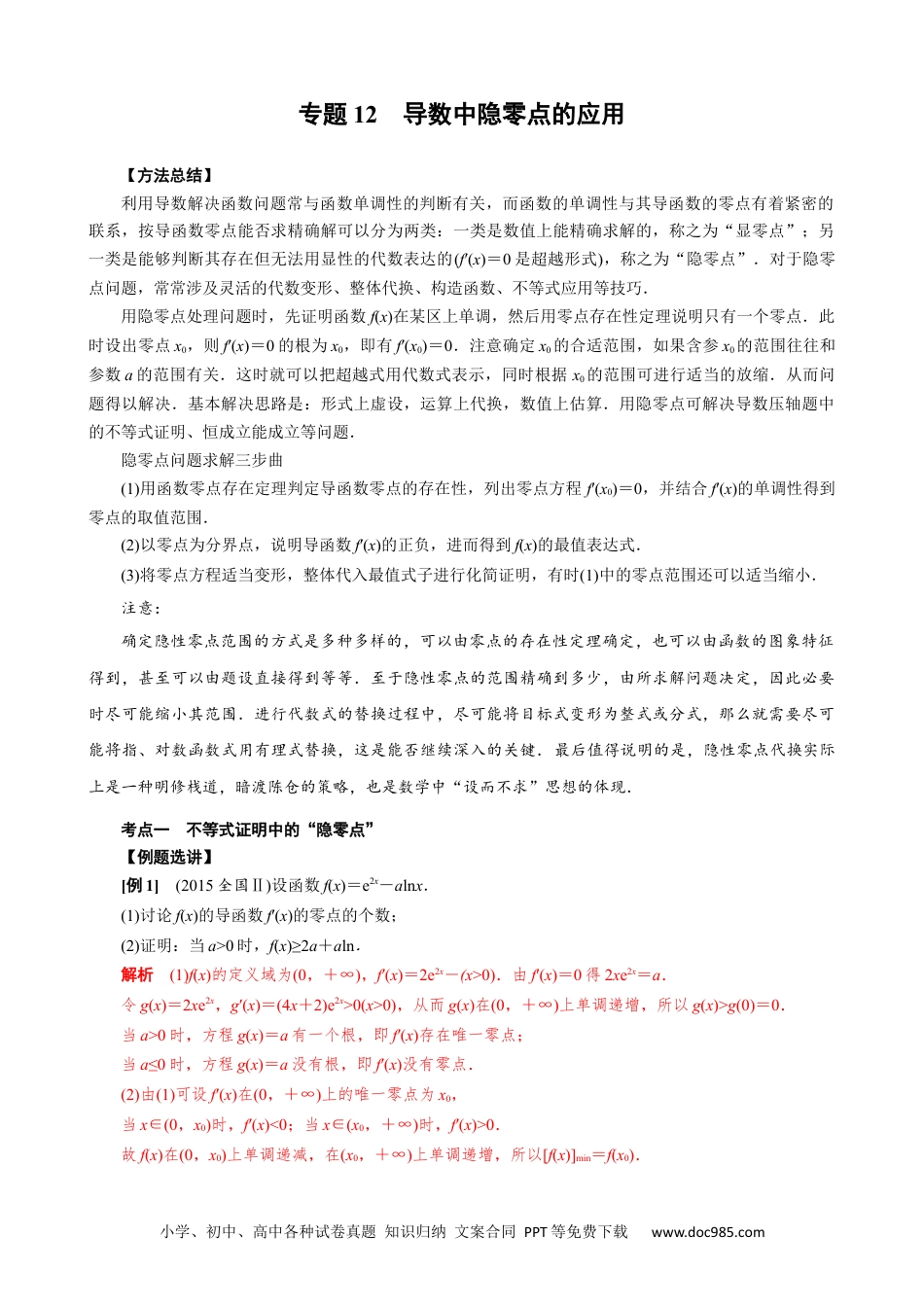 小学、初中、高中各种试卷真题知识归纳文案合同PPT等免费下载www.doc985.com专题12导数中隐零点的应用【方法总结】利用导数解决函数问题常与函数单调性的判断有关,而函数的单调性与其导函数的零点有着紧密的联系,按导函数零点能否求精确解可以分为两类:一类是数值上能精确求解的,称之为“显零点”;另一类是能够判断其存在但无法用显性的代数表达的(f′(x)=0是超越形式),称之为“隐零点”.对于隐零点问题,常常涉及灵活的代数变形、整体代换、构造函数、不等式应用等技巧.用隐零点处理问题时,先证明函数f(x)在某区上单调,然后用零点存在性定理说明只有一个零点.此时设出零点x0,则f′(x)=0的根为x0,即有f′(x0)=0.注意确定x0的合适范围,如果含参x0的范围往往和参数a的范围有关.这时就可以把超越式用代数式表示,同时根据x0的范围可进行适当的放缩.从而问题得以解决.基本解决思路是:形式上虚设,运算上代换,数值上估算.用隐零点可解决导数压轴题中的不等式证明、恒成立能成立等问题.隐零点问题求解三步曲(1)用函数零点存在定理判定导函数零点的存在性,列出零点方程f′(x0)=0,并结合f′(x)的单调性得到零点的取值范围.(2)以零点为分界点,说明导函数f′(x)的正负,进而得到f(x)的最值表达式.(3)将零点方程适当变形,整体代入最值式子进行化简证明,有时(1)中的零点范围还可以适当缩小.注意:确定隐性零点范围的方式是多种多样的,可以由零点的存在性定理确定,也可以由函数的图象特征得到,甚至可以由题设直接得到等等.至于隐性零点的范围精确到多少,由所求解问题决定,因此必要时尽可能缩小其范围.进行代数式的替换过程中,尽可能将目标式变形为整式或分式,那么就需要尽可能将指、对数函数式用有理式替换,这是能否继续深入的关键.最后值得说明的是,隐性零点代换实际上是一种明修栈道,暗渡陈仓的策略,也是数学中“设而不求”思想的体现.考点一不等式证明中的“隐零点”【例题选讲】[例1](2015全国Ⅱ)设函数f(x)=e2x-alnx.(1)讨论f(x)的导函数f′(x)的零点的个数;(2)证明:当a>0时,f(x)≥2a+aln.解析(1)f(x)的定义域为(0,+∞),f′(x)=2e2x-(x>0).由f′(x)=0得2xe2x=a.令g(x)=2xe2x,g′(x)=(4x+2)e2x>0(x>0),从而g(x)在(0,+∞)上单调递增,所以g(x)>g(0)=0.当a>0时,方程g(x)=a有一个根,即f′(x)存在唯一零点;当a≤0时,方程g(x)=a没有根,即f′(x)没有零点.(2)由(1)可设f′(x)在(0,+∞)上的唯一零点为x0,当x∈(0,x0)时,f′(x)<0;当x∈(x0,+∞)时,f′(x)>0.故f(x)在(0,x0)上单调递减,在(x0,+∞)上单调递增,所以[f(x)]min=f(x0).小学、初中、高中各种试卷真题知识归纳文案合同PPT等免费下载www.doc985.com由2e2x0-=0得e2x0=,又x0=,得lnx0=ln=ln-2x0,所以f(x0)=-alnx0=-a=+2ax0+aln≥2+aln=2a+aln.故当a>0时,f(x)≥2a+aln.[例2](2013全国Ⅱ)设函数f(x)=ex-ln(x+m).(1)若x=0是f(x)的极值点,求m的值,并讨论f(x)的单调性;(2)当m≤2时,求证:f(x)>0.解析(1)f′(x)=ex-.由x=0是f(x)的极值点得f′(0)=0,所以m=1.于是f(x)=ex-ln(x+1),定义域为(-1,+∞),f′(x)=ex-.函数f′(x)=ex-在(-1,+∞)单调递增,且f′(0)=0.因此当x∈(-1,0)时,f′(x)<0;当x∈(0,+∞)时,f′(x)>0.所以f(x)在(-1,0)单调递减,在(0,+∞)单调递增.(2)当m≤2,x∈(-m,+∞)时,ln(x+m)≤ln(x+2),故只需证明当m=2时,f(x)>0.当m=2时,函数f′(x)=ex-在(-2,+∞)单调递增.又f′(-1)<0,f′(0)>0,故f′(x)=0在(-2,+∞)有唯一实根x0,且x0∈(-1,0).当x∈(-2,x0)时,f′(x)<0;当x∈(x0,+∞)时,f′(x)>0,从而当x=x0时,f(x)取得最小值.由f′(x0)=0得=,ln(x0+2)=-x0,故f(x)≥f(x0)=+x0=>0.综上,当m≤2时,f(x)>0.[例3]已知函数f(x)=xex-a(x+lnx).(1)讨论f(x)极值点的个数;(2)若x0是f(x)的一个极小值点,且f(x0)>0,证明:f(x0)>2(x0-x).解析(1)f′(x)=(x+1)ex-a=(x+1)=,x∈(0,+∞).①当a≤...