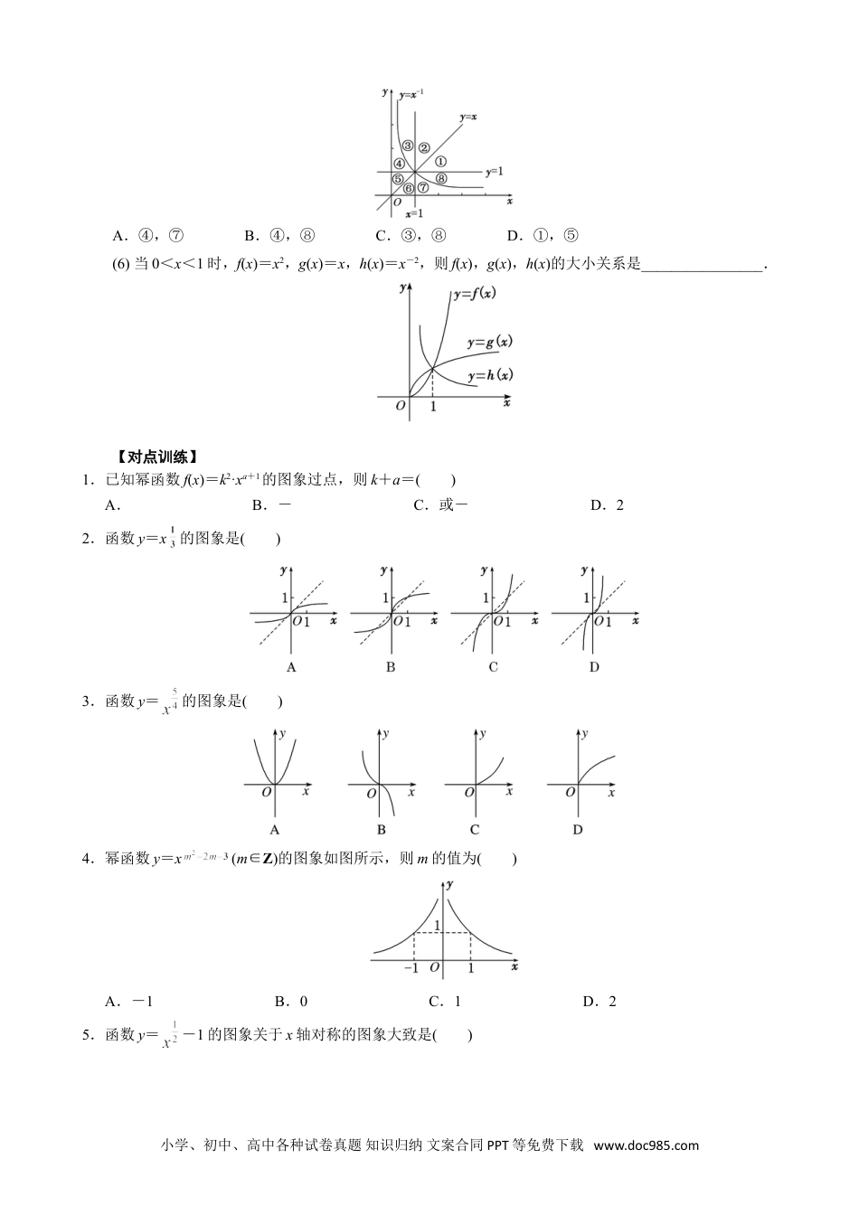 专题十一幂函数1.幂函数的概念一般地,形如y=xα(α∈R)的函数称为幂函数,其中底数x是自变量,α为常数.2.五种常见幂函数的图象与性质函数特征性质y=xy=x2y=x3y=xy=x-1图象定义域RR{x|x≥0}{x|x≠0}值域R{y|y≥0}R{y|y≥0}{y|y≠0}奇偶性奇奇非奇非偶奇单调性增(-∞,0)减,(0,+∞)增增增(-∞,0)和(0,+∞)减公共点(1,1)3.常用结论幂函数的图象特征与性质xyy=1y=xx=1α<00<α<1α>1O对于幂函数图象的掌握只要抓住在第一象限内三条线分第一象限为六个区域,即x=1,y=1,y=x分区域.根据α<0,0<α<1,α=1,α>1的取值确定位置后,其余象限部分由奇偶性决定.(1)幂函数在(0,+∞)上都有定义;(2)幂函数的图象过定点(1,1);(3)当α>0时,幂函数的图象都过点(1,1)和(0,0),且在(0,+∞)上单调递增,特别地,当α>1时,幂函数的图象下凸;当0<α<1时,幂函数的图象上凸;(4)当α<0时,幂函数的图象都过点(1,1),且在(0,+∞)上单调递减;(5)幂指数互为倒数的幂函数在第一象限内的图象关于直线y=x对称.(6)在第一象限,作直线x=a(a>1),它同各幂函数图象相交,按交点从下到上的顺序,幂指数按从小到大的顺序排列.(7)对于形如f(x)=xα(其中α∈Z),当α为奇数时,幂函数为奇函数,图象关于原点对称;当α为偶数时,幂函数为偶函数,图象关于y轴对称.(8)对于形如f(x)=x(其中m∈N*,n∈Z,m与n互质)的幂函数的奇偶性:①当n为偶数时,f(x)为偶函数,图象关于y轴对称;小学、初中、高中各种试卷真题知识归纳文案合同PPT等免费下载www.doc985.com②当m,n都为奇数时,f(x)为奇函数,图象关于原点对称;③当m为偶数时,x>0(或x≥0),f(x)是非奇非偶函数,图象只在第一象限(或第一象限及原点处).考点一幂函数的图象及其应用【方法总结】幂函数图象的规律(1)幂函数的图象一定会出现在第一象限,一定不会出现在第四象限,至于是否出现在第二、三象限,要看函数的奇偶性;(2)幂函数的图象最多能同时出现在两个象限内;(3)如果幂函数图象与坐标轴相交,则交点一定是原点;(4)当α为奇数时,幂函数的图象关于原点对称;当α为偶数时,幂函数的图象关于y轴对称.【例题选讲】[例1](1)若幂函数y=(m2-3m+3)·xm2-m-2的图象不过原点,则m的取值是()A.-1≤m≤2B.m=1或m=2C.m=2D.m=1(2)幂函数y=f(x)的图象过点(4,2),则幂函数y=f(x)的图象是()(3)若幂函数y=x-1,y=xm与y=xn在第一象限内的图象如图所示,则m与n的取值情况为()A.-1<m<0<n<1B.-1<n<0<mC.-1<m<0<nD.-1<n<0<m<1(4)如图所示,图中的曲线是幂函数y=xn在第一象限的图象,已知n取±2,±四个值,则相应于C1,C2,C3,C4的n依次为()A.-2,-,,2B.2,,-,-2C.-,-2,2,D.2,,-2,-(5)幂函数y=x-1及直线y=x,y=1,x=1将平面直角坐标系的第一象限分成八个“卦限”:①,②,③,④,⑤,⑥,⑦,⑧(如图所示),则幂函数y=x的图象经过的“卦限”是()小学、初中、高中各种试卷真题知识归纳文案合同PPT等免费下载www.doc985.comA.④,⑦B.④,⑧C.③,⑧D.①,⑤(6)当0<x<1时,f(x)=x2,g(x)=x,h(x)=x-2,则f(x),g(x),h(x)的大小关系是________________.【对点训练】1.已知幂函数f(x)=k2·xa+1的图象过点,则k+a=()A.B.-C.或-D.22.函数y=x的图象是()3.函数y=的图象是()4.幂函数y=x(m∈Z)的图象如图所示,则m的值为()A.-1B.0C.1D.25.函数y=-1的图象关于x轴对称的图象大致是()小学、初中、高中各种试卷真题知识归纳文案合同PPT等免费下载www.doc985.com6.图中C1,C2,C3为三个幂函数y=xk在第一象限内的图象,则解析式中指数k的值依次可以是()A.-1,,3B.-1,3,C.,-1,3D.,3,-17.若四个幂函数y=xa,y=xb,y=xc,y=xd在同一坐标系中的图象如图所示,则a,b,c,d的大小关系是()A.d>c>b>aB.a>b>c>dC.d>c>a>bD.a>b>d>c8.在同一坐标系内,函数y=xa(a≠0)和y=ax-的图象可能是()考点二幂函数性质的综合应用考向1比较幂值大小【方法总结】比较幂值大小的常见类型及解决方法(1)同底不同指:利用...