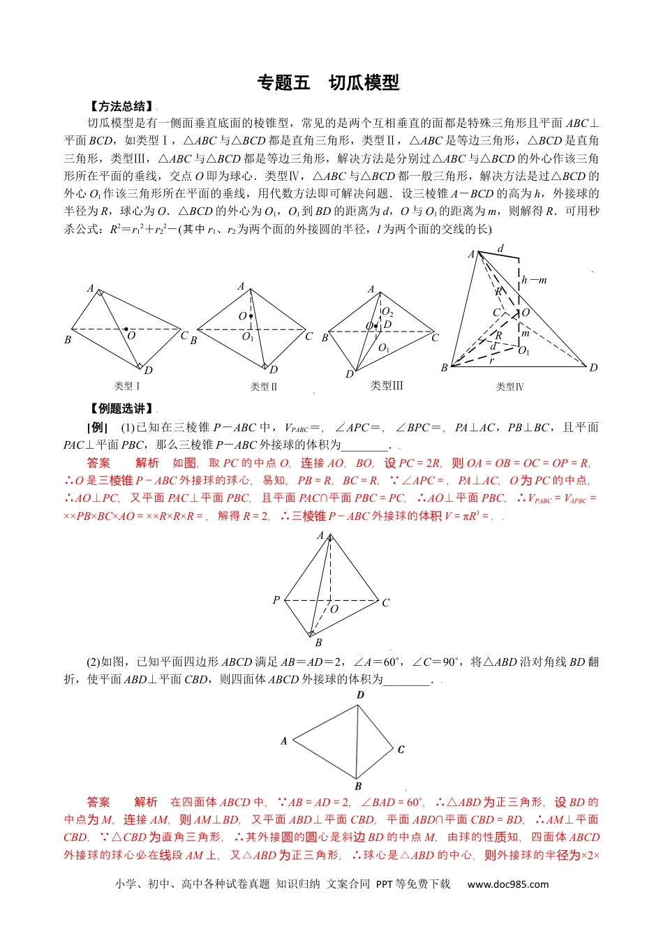 小学、初中、高中各种试卷真题知识归纳文案合同PPT等免费下载www.doc985.com专题五切瓜模型【方法总结】切瓜模型是有一侧面垂直底面的棱锥型,常见的是两个互相垂直的面都是特殊三角形且平面ABC⊥平面BCD,如类型Ⅰ,△ABC与△BCD都是直角三角形,类型Ⅱ,△ABC是等边三角形,△BCD是直角三角形,类型Ⅲ,△ABC与△BCD都是等边三角形,解决方法是分别过△ABC与△BCD的外心作该三角形所在平面的垂线,交点O即为球心.类型Ⅳ,△ABC与△BCD都一般三角形,解决方法是过△BCD的外心O1作该三角形所在平面的垂线,用代数方法即可解决问题.设三棱锥A-BCD的高为h,外接球的半径为R,球心为O.△BCD的外心为O1,O1到BD的距离为d,O与O1的距离为m,则解得R.可用秒杀公式:R2=r12+r22-(其中r1、r2为两个面的外接圆的半径,l为两个面的交线的长)ABCDO类型ⅠABCDO1O类型ⅡABCDO1ODO2类型ⅢABCDO1ORrmh-mRdd类型Ⅳ【例题选讲】[例](1)已知在三棱锥P-ABC中,VPABC=,∠APC=,∠BPC=,PA⊥AC,PB⊥BC,且平面PAC⊥平面PBC,那么三棱锥P-ABC外接球的体积为________.答案解析如,取图PC的中点O,接连AO,BO,设PC=2R,则OA=OB=OC=OP=R,∴O是三棱锥P-ABC外接球的球心,易知,PB=R,BC=R, ∠APC=,PA⊥AC,O为PC的中点,∴AO⊥PC,又平面PAC⊥平面PBC,且平面PAC∩平面PBC=PC,∴AO⊥平面PBC,∴VPABC=VAPBC=××PB×BC×AO=××R×R×R=,解得R=2,∴三棱锥P-ABC外接球的体积V=πR3=.PBCAO(2)如图,已知平面四边形ABCD满足AB=AD=2,∠A=60˚,∠C=90˚,将△ABD沿对角线BD翻折,使平面ABD⊥平面CBD,则四面体ABCD外接球的体积为________.答案解析在四面体ABCD中, AB=AD=2,∠BAD=60˚,∴△ABD正三角形,为设BD的中点为M,接连AM,则AM⊥BD,又平面ABD⊥平面CBD,平面ABD∩平面CBD=BD,∴AM⊥平面CBD. △CBD直角三角形,为∴其外接的心是斜圆圆边BD的中点M,由球的性知,四面体质ABCD外接球的球心必在段线AM上,又△ABD正三角形,为∴球心是△ABD的中心,外接球的半则径为×2×小学、初中、高中各种试卷真题知识归纳文案合同PPT等免费下载www.doc985.com=,∴四面体ABCD外接球的体积为×π×()3=.(3)已知三棱锥A-BCD中,△ABD与△BCD是边长为2的等边三角形且二面角A-BD-C为直二面角,则三棱锥A-BCD的外接球的表面积为()A.B.5πC.6πD.答案D解析如,取图BD中点M,接连AM,CM,取△ABD,△CBD的中心即AM,CM的三等分点P,Q,过P作平面ABD的垂,线过Q作平面CBD的垂,垂相交于点线两线O,点则O外接球为的球心,如,其中图OQ=,CQ=,接连OC,外接球的半则径R=OC=,表面积为4πR2=,故选D.(4)已知是以为斜边的直角三角形,为平面外一点,且平面平面,,,,则三棱锥外接球的表面积为________.答案解析由题意知的中点为外接圆的圆心,且平面平面,过作面的垂线,则垂线一定在面内.根据球的性质,球心一定在垂线上,球心一定在平面内,且球心也是外接圆的圆心.在中,由余弦定理得,,由正弦定理得:,解得,三棱锥的外接球的表面积.(5)已知等腰直角三角形ABC中,AB=AC=2,D,E分别为AB,AC的中点,沿DE将△ABC折成直二面角(如图),则四棱锥A-DECB的外接球的表面积为________.BACDEBACDE答案10π解析取DE的中点M,BC的中点N,接连MN(略图),由意知,题MN⊥平面ADE,因为△ADE是等腰直角三角形,所以△ADE的外接的心是点圆圆M,四棱锥A-DECB的外接球的球心在直线MN上,又等腰梯形DECB的外接的心在圆圆MN上,所以四棱锥A-DECB的外接球的球心就是等腰梯形DECB的外接的心.接圆圆连BE,易知△BEC是角三角形,所以等腰梯形钝DECB的外接的圆圆心在等腰梯形DECB的外部.四设棱锥A-DECB的外接球的半径为R,球心到BC的距离为d,解得则R2=,故四棱锥A-DECB的外接球的表面积S=4πR2=10π.小学、初中、高中各种试卷真题知识归纳文案合同PPT等免费下载www.doc985.comBACDEMNO【对点训练】1.把边长为3的正方沿对角线对折,使得平面平面,则三棱锥的外接球的表面积为A.B.C.D.1.答案C解析将边长为1的正方形,沿对角线把折起,使平面平...