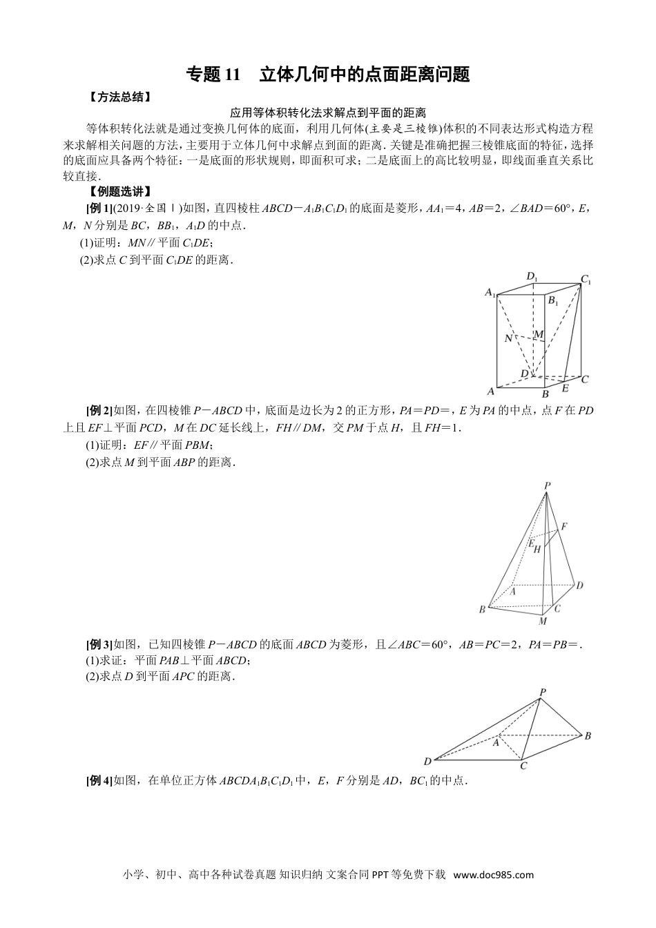 专题11立体几何中的点面距离问题【方法总结】应用等体积转化法求解点到平面的距离等体积转化法就是通过变换几何体的底面,利用几何体(主要是三棱锥)体积的不同表达形式构造方程来求解相关问题的方法,主要用于立体几何中求解点到面的距离.关键是准确把握三棱锥底面的特征,选择的底面应具备两个特征:一是底面的形状规则,即面积可求;二是底面上的高比较明显,即线面垂直关系比较直接.【例题选讲】[例1](2019·全国Ⅰ)如图,直四棱柱ABCD-A1B1C1D1的底面是菱形,AA1=4,AB=2,∠BAD=60°,E,M,N分别是BC,BB1,A1D的中点.(1)证明:MN∥平面C1DE;(2)求点C到平面C1DE的距离.[例2]如图,在四棱锥P-ABCD中,底面是边长为2的正方形,PA=PD=,E为PA的中点,点F在PD上且EF⊥平面PCD,M在DC延长线上,FH∥DM,交PM于点H,且FH=1.(1)证明:EF∥平面PBM;(2)求点M到平面ABP的距离.[例3]如图,已知四棱锥P-ABCD的底面ABCD为菱形,且∠ABC=60°,AB=PC=2,PA=PB=.(1)求证:平面PAB⊥平面ABCD;(2)求点D到平面APC的距离.[例4]如图,在单位正方体ABCDA1B1C1D1中,E,F分别是AD,BC1的中点.小学、初中、高中各种试卷真题知识归纳文案合同PPT等免费下载www.doc985.com(1)求证:EF∥平面C1CDD1;(2)在线段A1B上是否存在点G,使EG⊥平面A1BC1?若存在,求点G到平面C1DF的距离;若不存在,请说明理由.[例5]如图1,四边形ABCD为等腰梯形,AB=2,AD=DC=CB=1,将△ADC沿AC折起,使得平面ADC⊥平面ABC,E为AB的中点,连接DE,DB(如图2).(1)求证:BC⊥AD;(2)求点E到平面BCD的距离.[例6]如图,高为1的等腰梯形ABCD中,AM=CD=AB=1.现将△AMD沿MD折起,使平面AMD⊥平面MBCD,连接AB,AC.(1)在AB边上是否存在点P,使AD∥平面MPC?(2)当点P为AB边的中点时,求点B到平面MPC的距离.【对点训练】1.(2018·全国Ⅱ)如图,在三棱锥P-ABC中,AB=BC=2,PA=PB=PC=AC=4,O为AC的中点.(1)证明:PO⊥平面ABC;(2)若点M在棱BC上,且MC=2MB,求点C到平面POM的距离.2.(2013·江西)如图,直四棱柱ABCD-A1B1C1D1中,AB∥CD,AD⊥AB,AB=2,AD=,AA1=3,E为CD上一点,DE=1,EC=3.(1)证明:BE⊥平面BB1C1C;(2)求点B1到平面EA1C1的距离.小学、初中、高中各种试卷真题知识归纳文案合同PPT等免费下载www.doc985.com3.如图,在三棱锥A—BCD中,△ABC是等腰直角三角形,且AC⊥BC,BC=2,AD⊥平面BCD,AD=1.(1)求证:平面ABC⊥平面ACD;(2)若E为AB的中点,求点A到平面CED的距离.4.已知三棱锥P-ABC中,AC⊥BC,AC=BC=2,PA=PB=PC=3,O是AB的中点,E是PB的中点.(1)证明:平面PAB⊥平面ABC;(2)求点B到平面OEC的距离.5.在如图所示的几何体中,四边形ABCD是直角梯形,AD∥BC,AB⊥BC,AD=2,AB=3,BC=BE=7,△DCE是边长为6的正三角形.(1)求证:平面DEC⊥平面BDE;(2)求点A到平面BDE的距离.6.如图,在四棱锥P-ABCD中,底面ABCD是矩形,且AD=2,AB=1,PA⊥平面ABCD,E,F分别是线段AB,BC的中点.(1)证明:PF⊥FD;(2)若PA=1,求点E到平面PFD的距离.小学、初中、高中各种试卷真题知识归纳文案合同PPT等免费下载www.doc985.com7.如图,四棱锥P-ABCD中,PA⊥底面ABCD,底面ABCD为梯形,AD∥BC,CD⊥BC,AD=2,AB=BC=3,PA=4,M为AD的中点,N为PC上一点,且PC=3PN.(1)求证:MN∥平面PAB;(2)求点M到平面PAN的距离.8.如图,在四棱锥P-ABCD中,侧面PAD是边长为2的正三角形,且与底面垂直,底面ABCD是∠ABC=60°的菱形,M为PC的中点.(1)求证:PC⊥AD;(2)求点D到平面PAM的距离.9.如图,在四棱锥P-ABCD中,PC⊥平面ABCD,底面ABCD是平行四边形,AB=BC=2a,AC=2a,E是PA的中点.(1)求证:平面BED⊥平面PAC;(2)求点E到平面PBC的距离.10.如图1,在直角梯形ABCP中,CP∥AB,CP⊥BC,AB=BC=CP,D是CP的中点,将△PAD沿AD折起,使点P到达点P′的位置得到图2,点M为棱P′C上的动点.①当M在何处时,平面ADM⊥平面P′BC,并证明;②若AB=2,∠P′DC=135°,证明:点C到平面P′AD的距离等于点P′到平面ABCD的距离,并求出该距离.11.如图1...